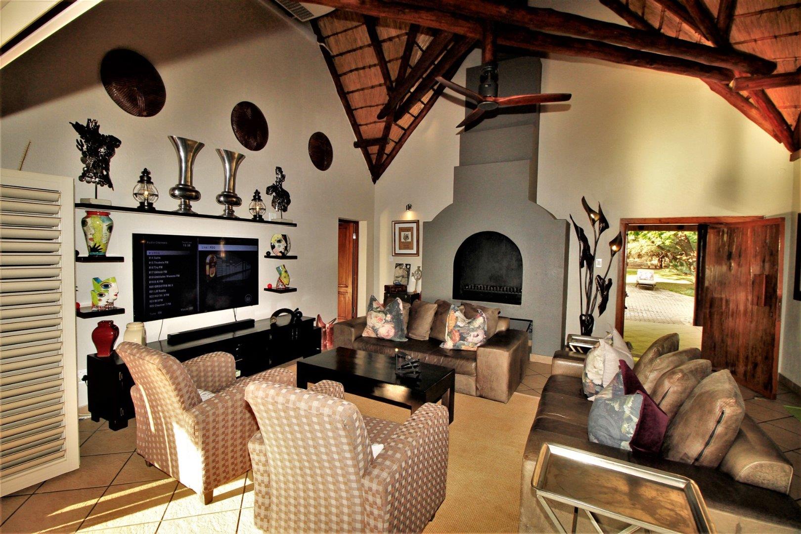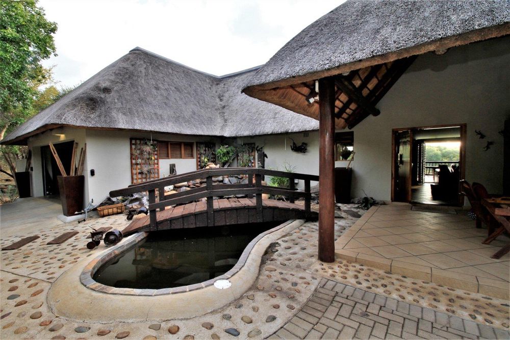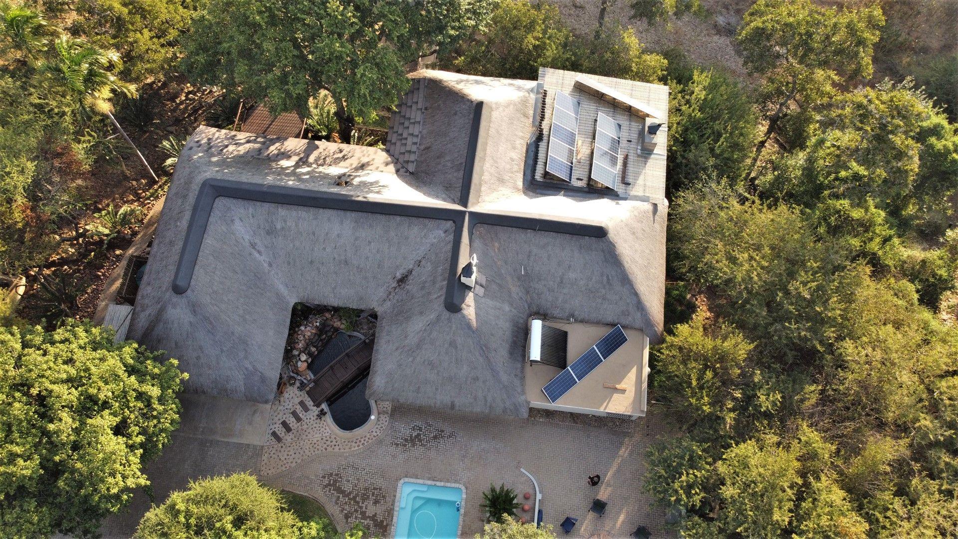 Spectacular 4-bedroom thatch home, situated within the picturesque Blyde Wildlife Estate. Majestically positioned, the house has an elevated view of the Blyde river flood-plain and un-interrupted mountain views as well! Set on two levels, the upper level houses the main living area with a lounge, kitchen and 2 bedrooms (both en-suite). The lower level has 2 additional bedrooms (both en-suite), along with a bar, laundry, storeroom and staff quarters. This house offers a beautiful open-plan kitchen and lounge with gas fireplace that leads out to an expansive covered patio with stunning views of the mountain. There is a second covered patio with built-in braai overlooking the sparkling pool, boma and beautiful garden with panoramic views of the surrounding mountains. The house is sold fully furnished.