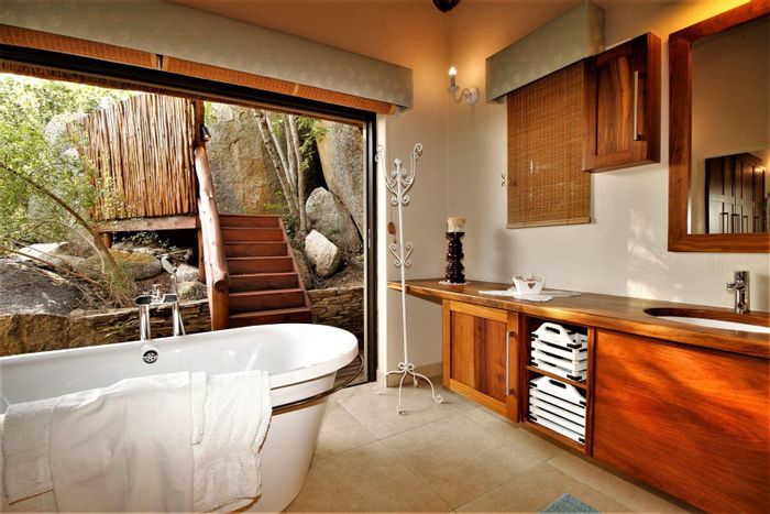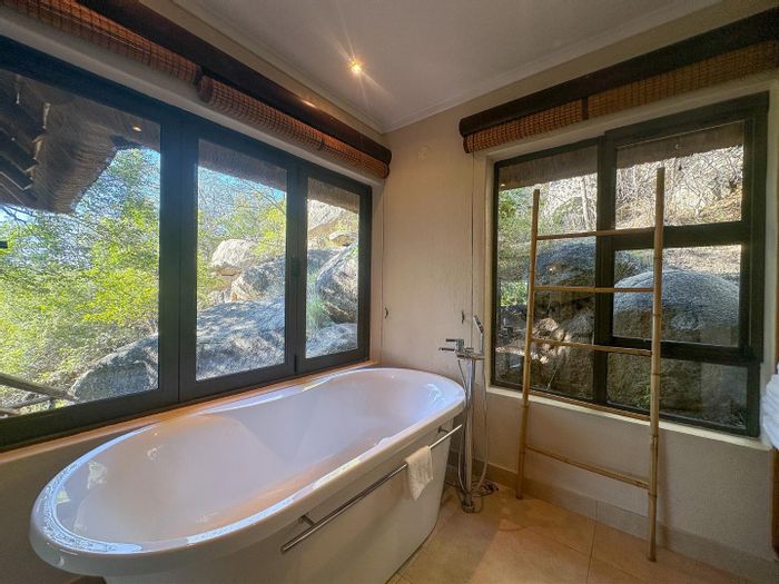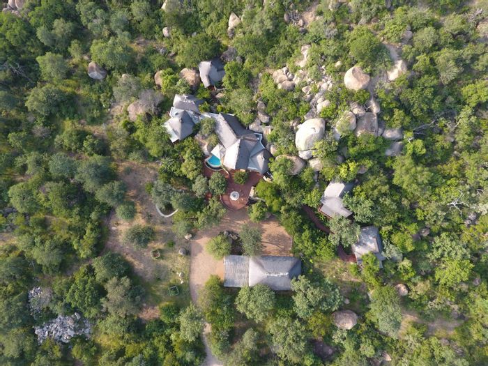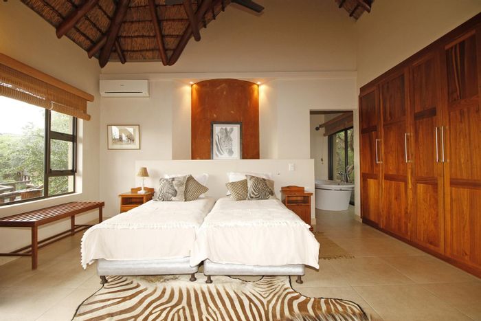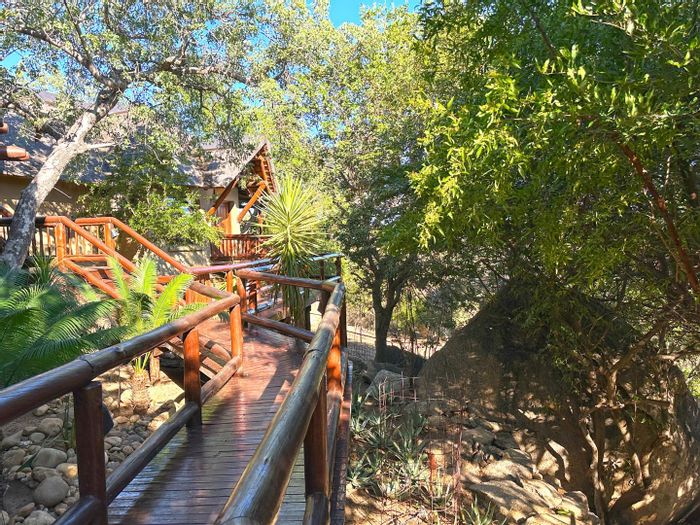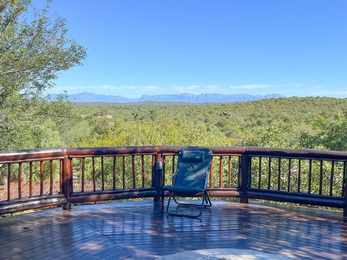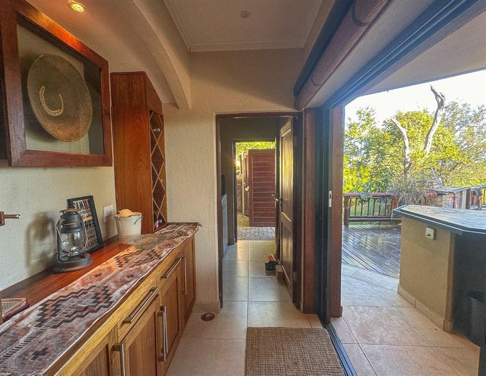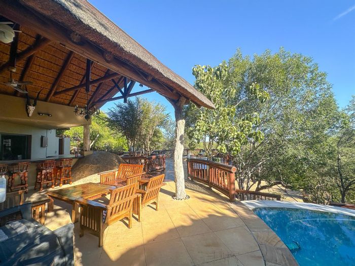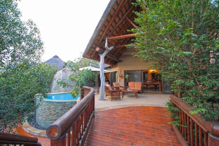 Bushveld retreat in Raptors View Wildlife Estate with abundant game and birdlife; covered entertaining deck, pool and outdoor showers, walking/cycling trails — three bedrooms, two bathrooms, fully furnished.