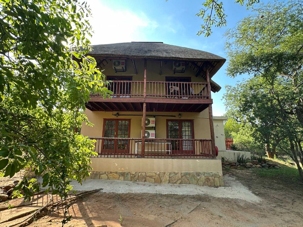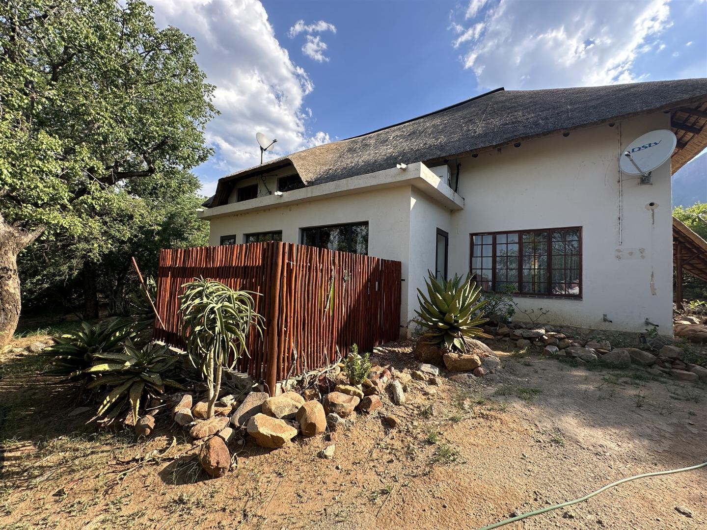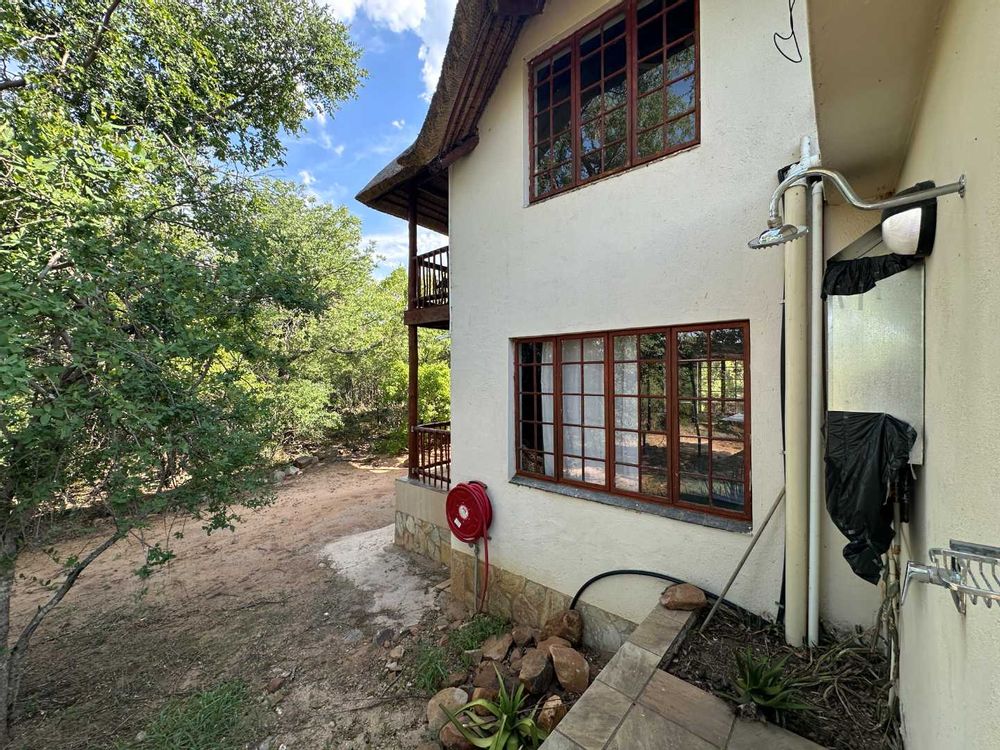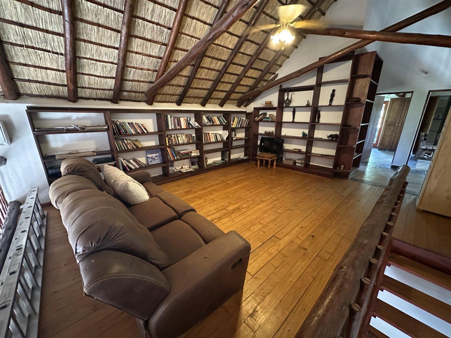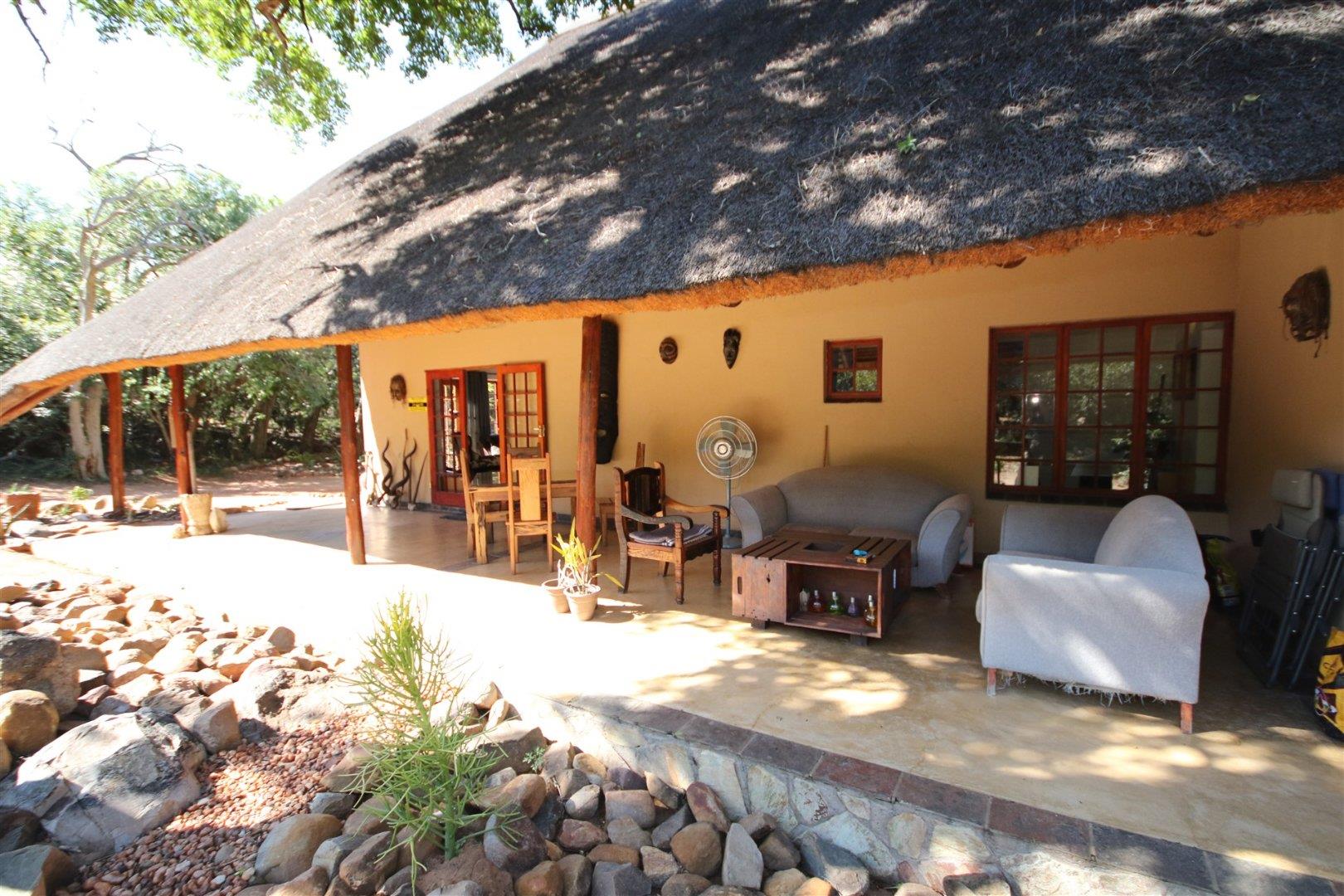 This comfortable, 3-bedroom home has two bathrooms, Lounge open plan kitchen, Upstairs library and large patio. The house has a new thatch roof and there is Solar panels, 5Kva inverted and 5 Kva batteries.