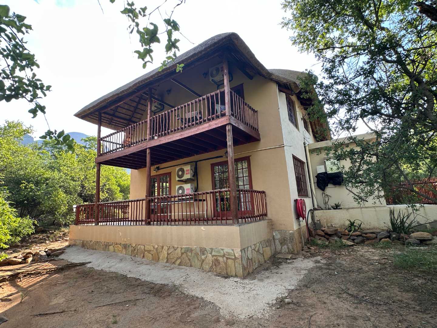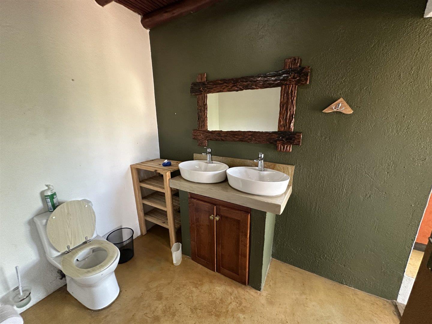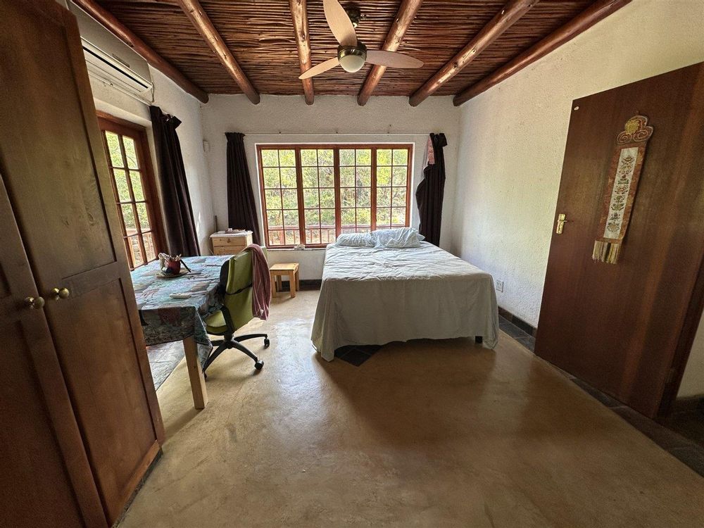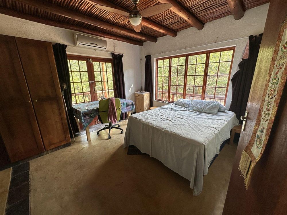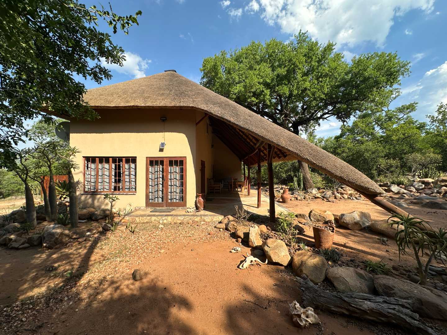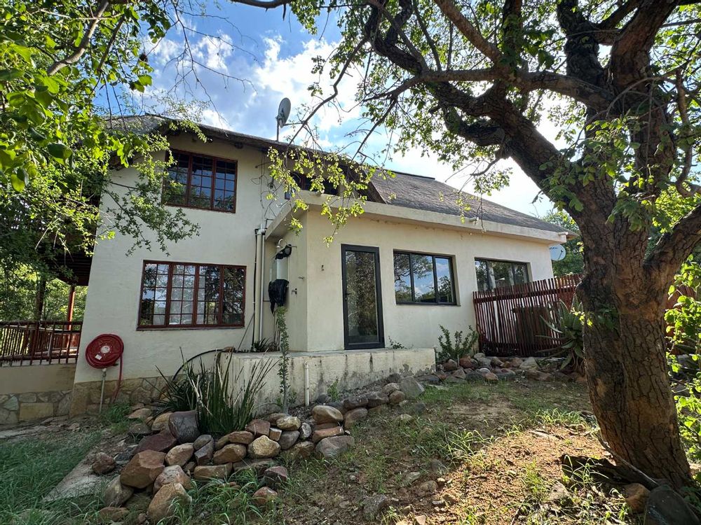 This comfortable, 3-bedroom home has two bathrooms, Lounge open plan kitchen, Upstairs library and large patio. The house has a new thatch roof and there is Solar panels, 5Kva inverted and 5 Kva batteries.