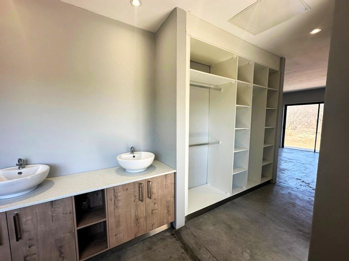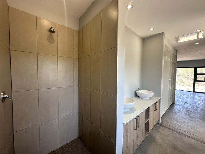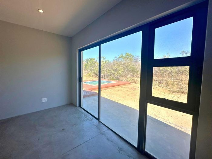 Bushveld retreat in Moditlo Estate with elevated views over plains and distant mountains, featuring a covered patio, pool and boma for alfresco entertaining — three bedrooms, three bathrooms, double carport.