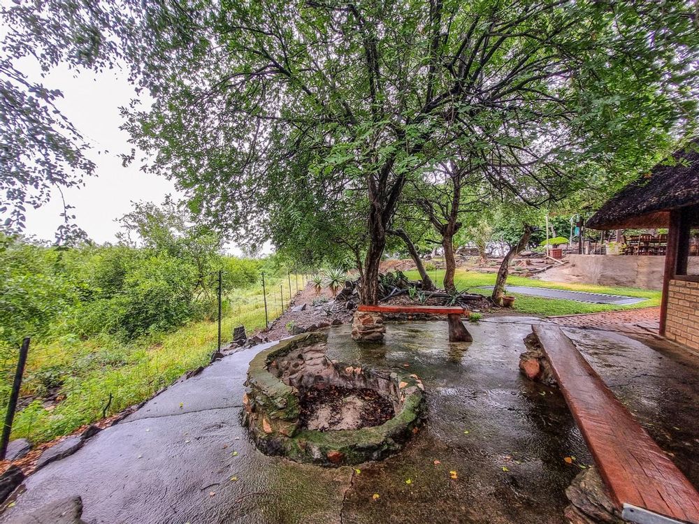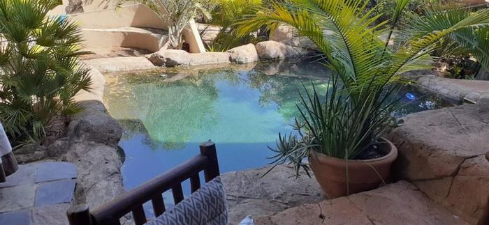 Outside there is a large covered patio area with built in braai, pool and fenced garden. A large entertainment/ games room with boma and toilets is found on one side of the garden, while the cottage is found on the other side of the patio area.