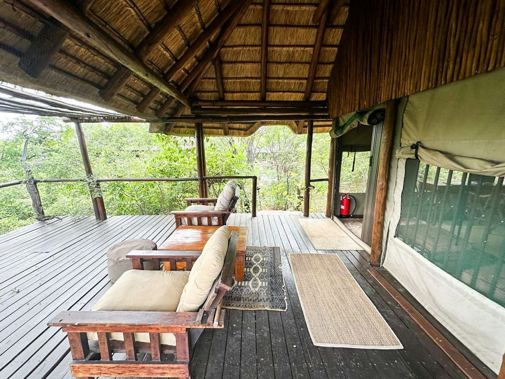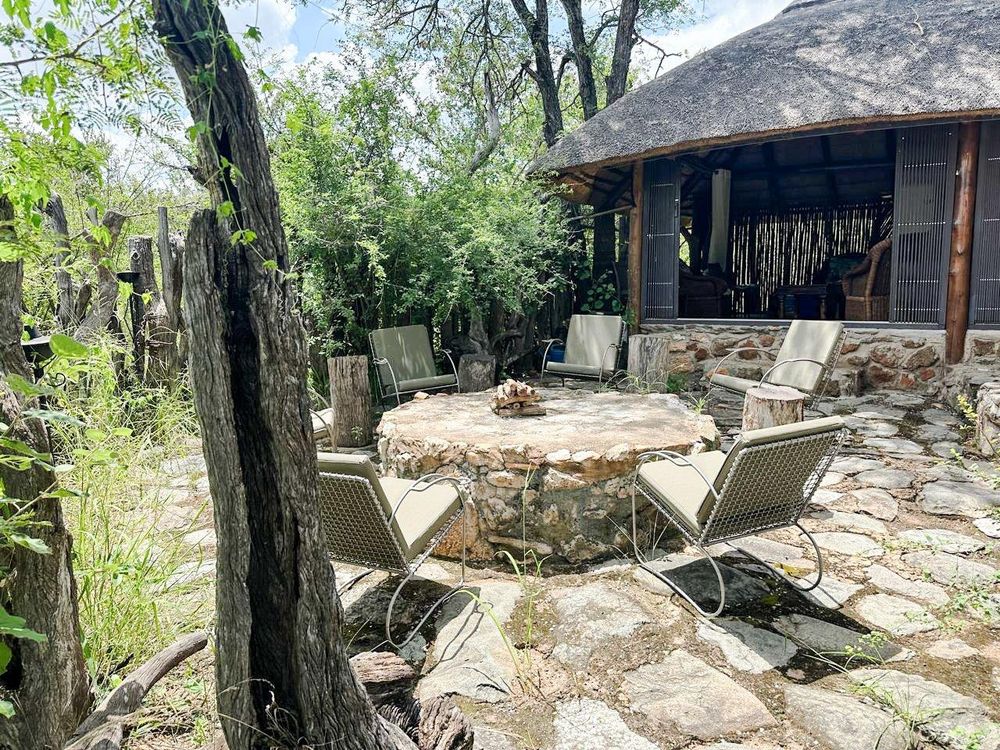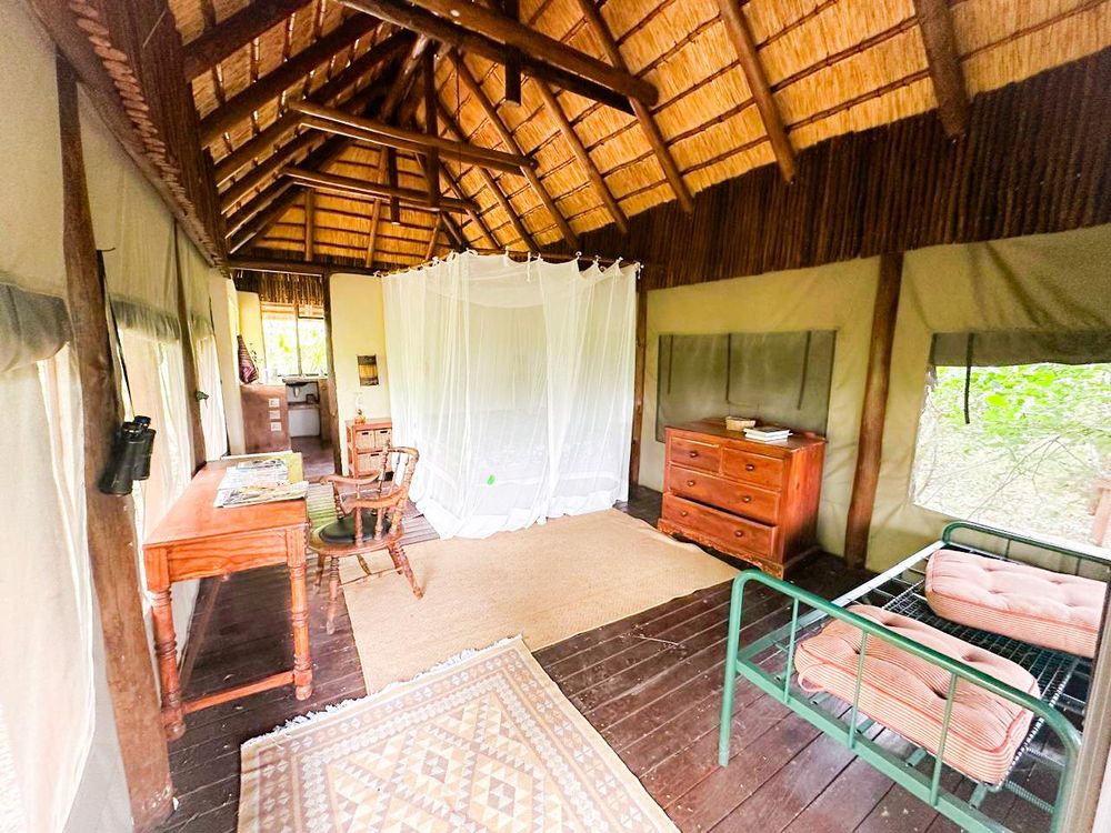 Set approximately 500 metres from the main homestead, the rustic bush camp delivers an immersive wilderness experience. It includes multiple stone-and-thatch, canvas-sided sleeping units (main en-suite), open-air bathrooms, an open-plan kitchen and dining area, and a separate dining area and day bed — perfect for unforgettable gatherings under the stars. The camp is fenced with electric elephant fence.