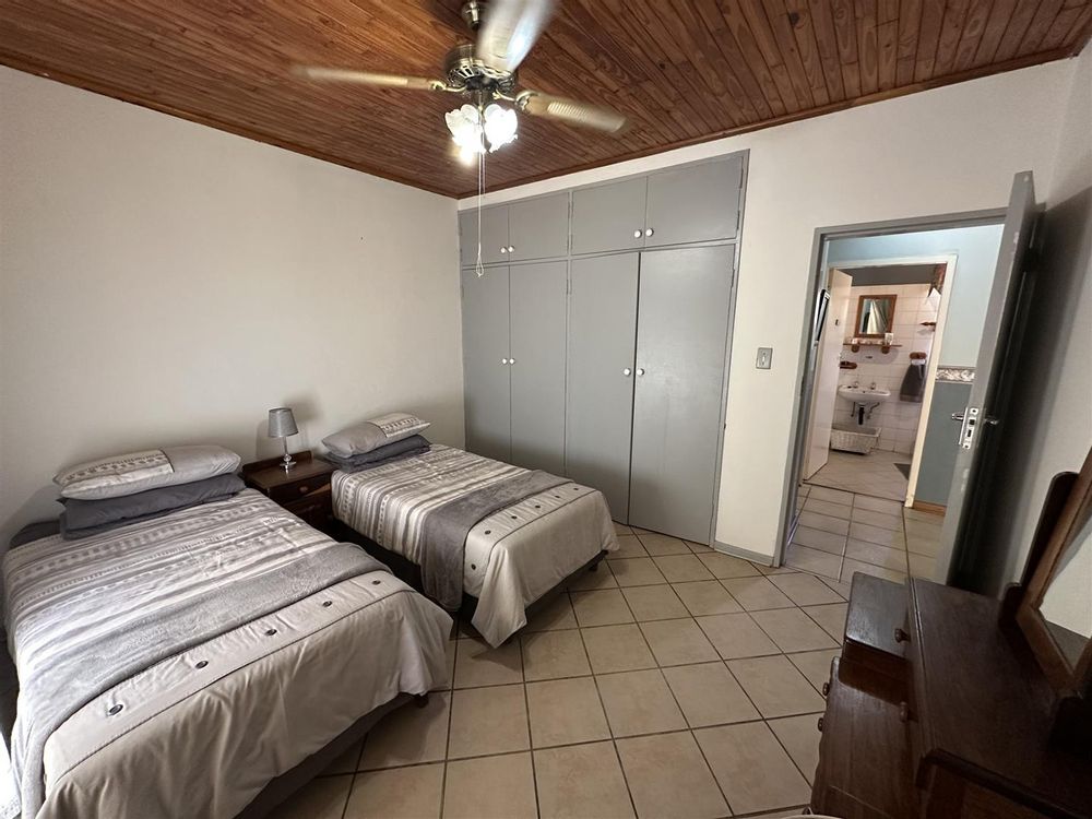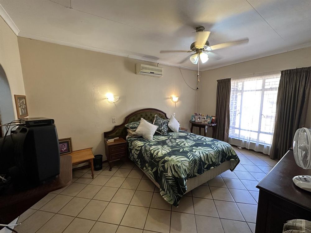 The open-plan dining room seamlessly flows onto a covered patio, offering tranquil views of the sparkling pool and lush, landscaped garden-complete with a built-in outdoor braai for memorable gatherings.