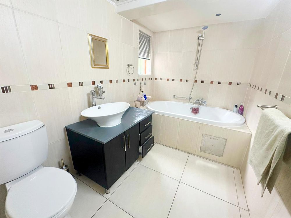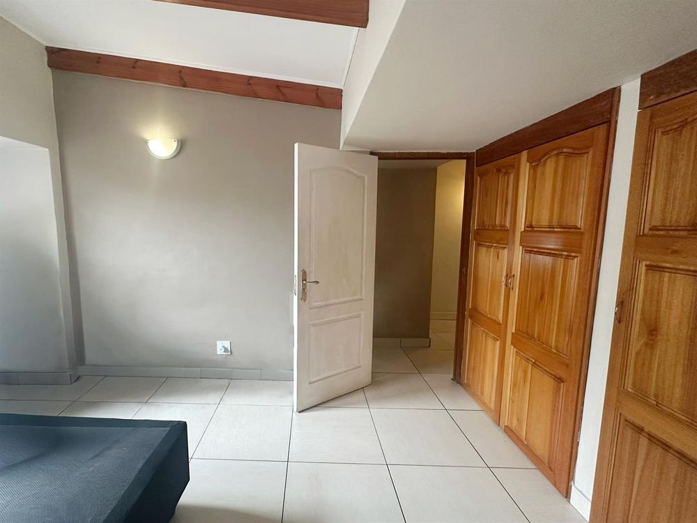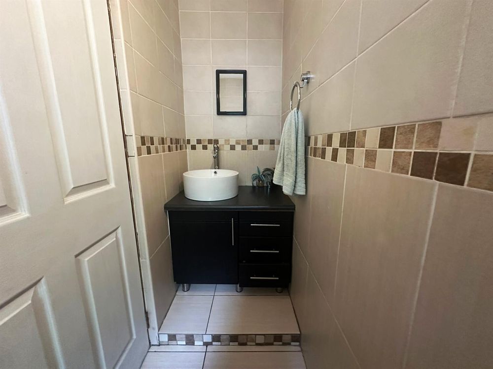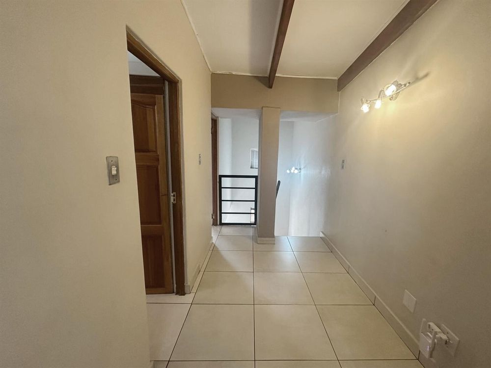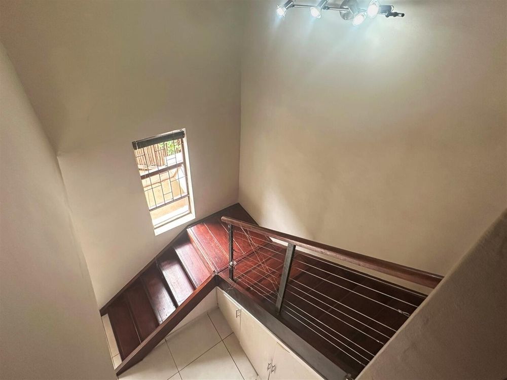 On the ground floor, the open-plan lounge and dining area flows into a modern kitchen. There’s a small study nook, perfect for working from home. The living area opens onto a private patio with a built-in braai, leading straight into the leafy communal garden. Ideal for outdoor entertaining. A private courtyard with a washing line adds convenience, and there’s also a guest loo downstairs.