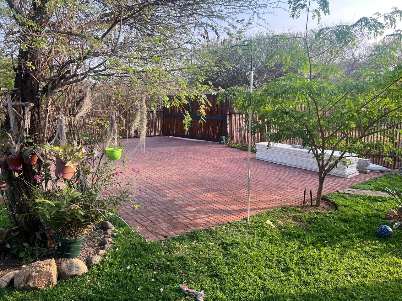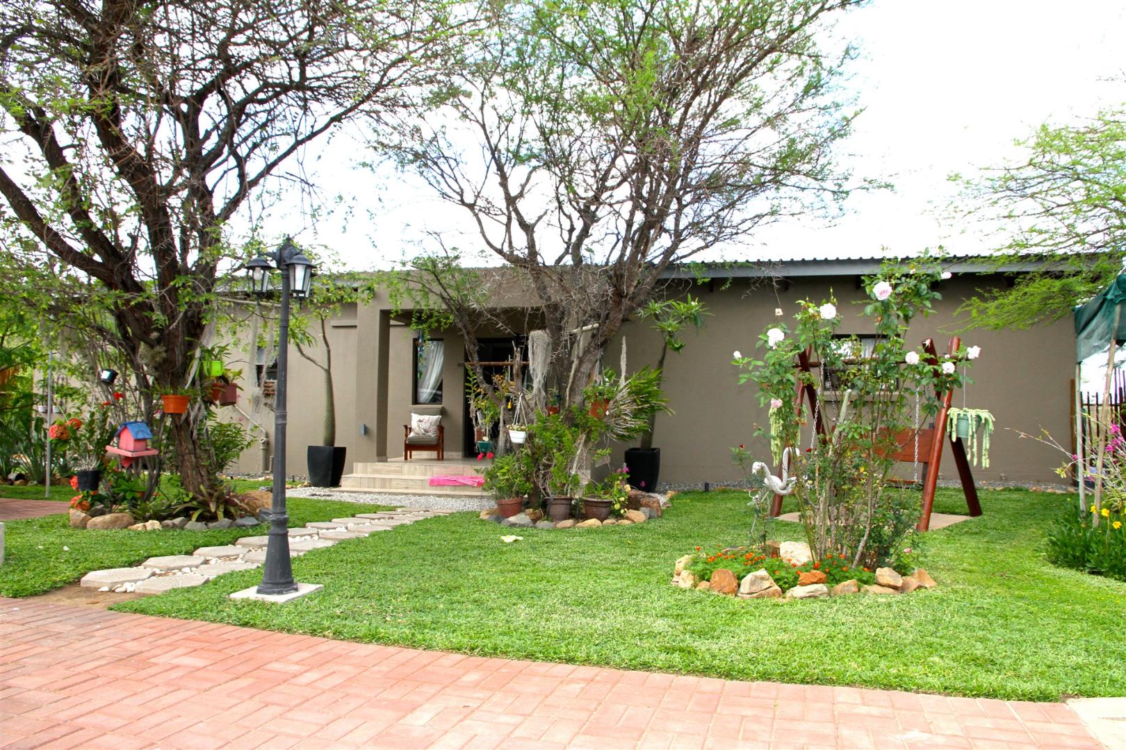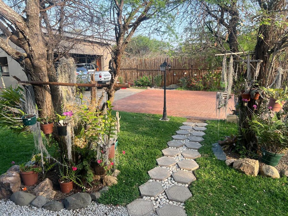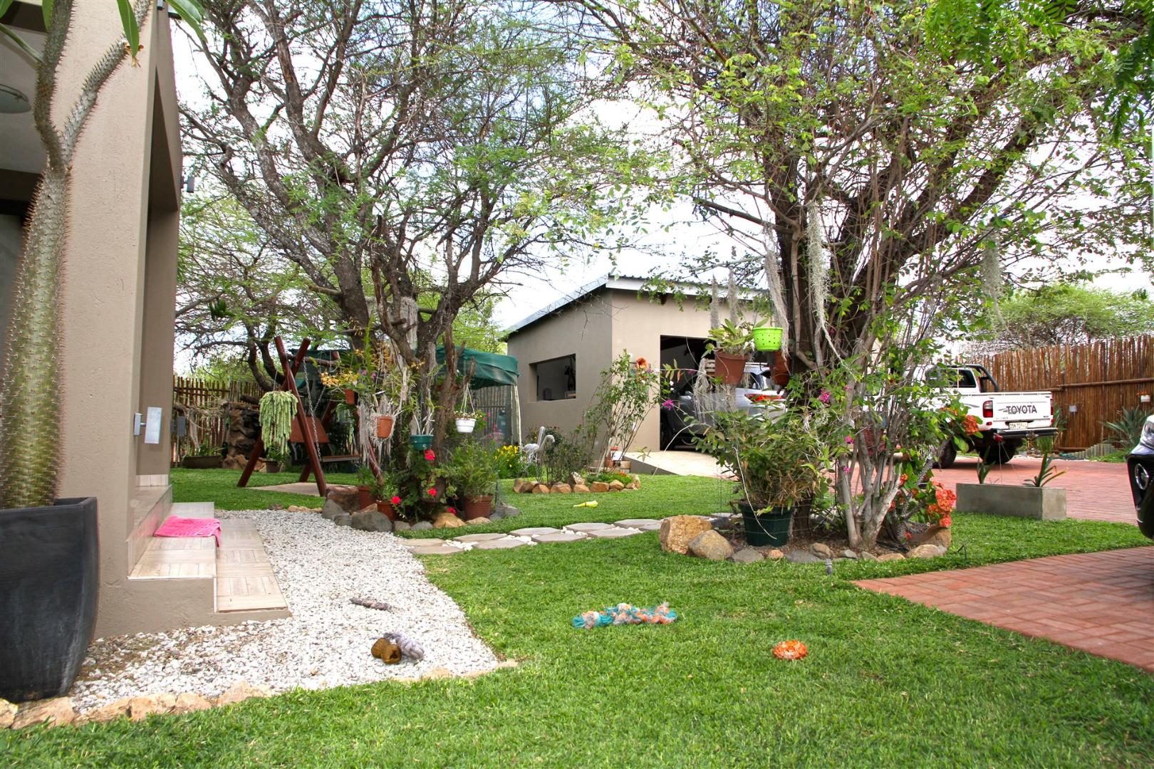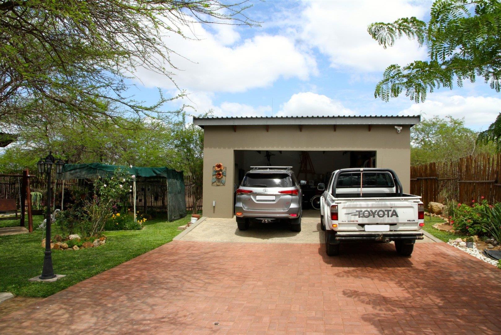 Additional features include paved entrance, 2 open parking bays, automated gate access, an open-sided double garage, natural latte fencing around a lovely landscaped garden with lawns and acacia trees, a water feature, water storage and filtration systems, and a separate outside toilet.