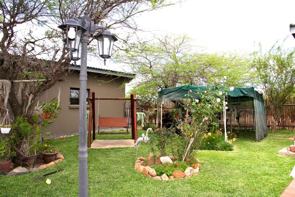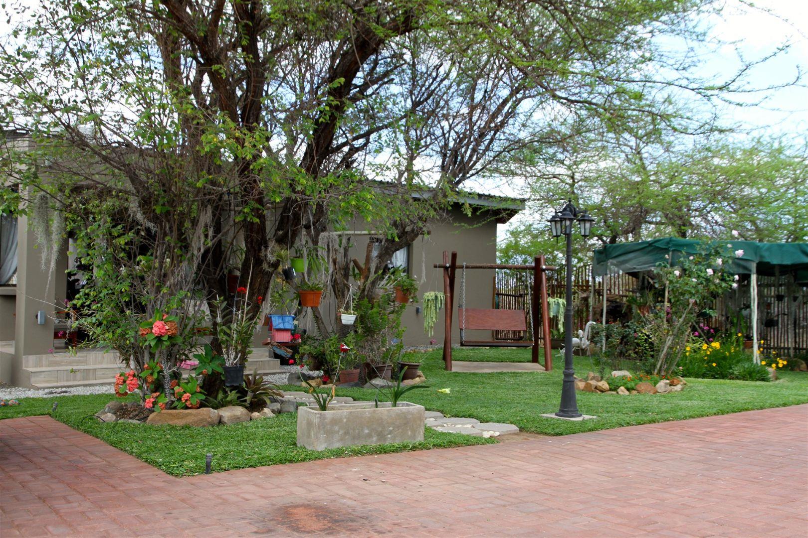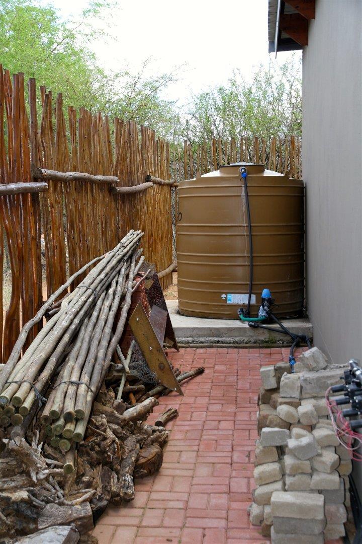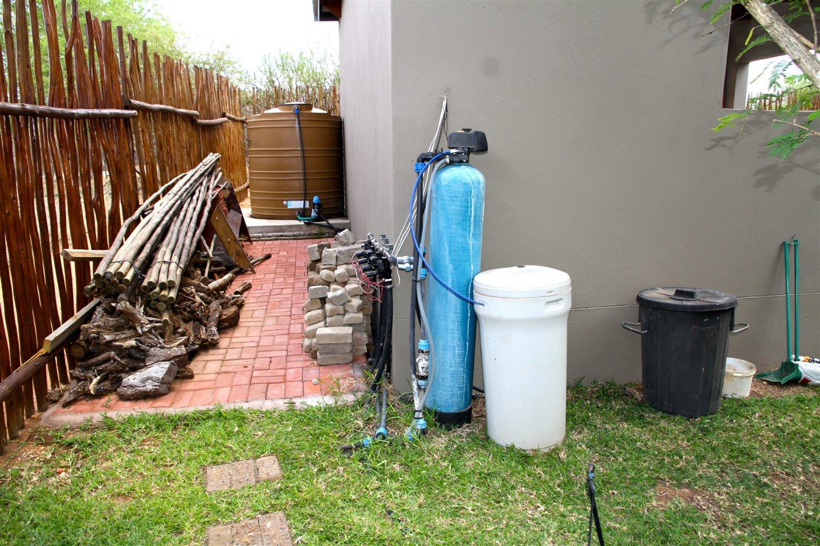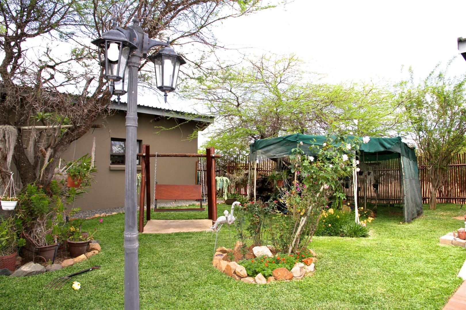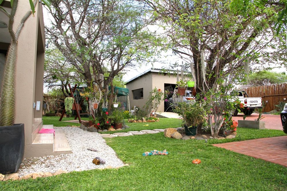 Additional features include paved entrance, 2 open parking bays, automated gate access, an open-sided double garage, natural latte fencing around a lovely landscaped garden with lawns and acacia trees, a water feature, water storage and filtration systems, and a separate outside toilet.