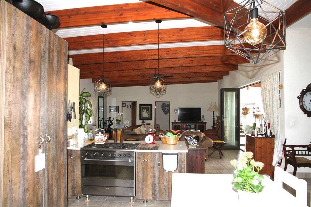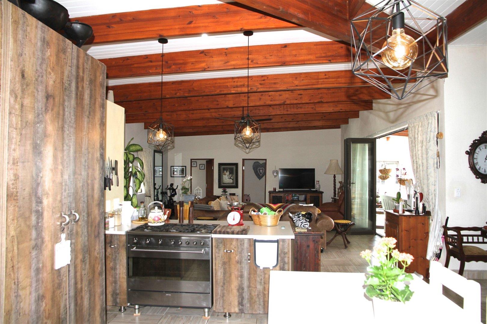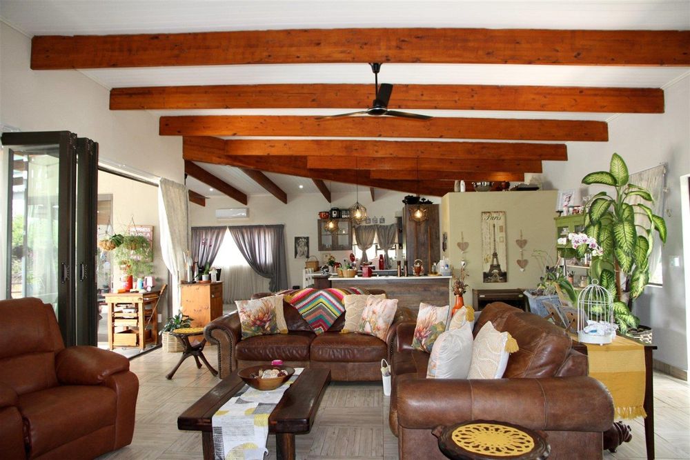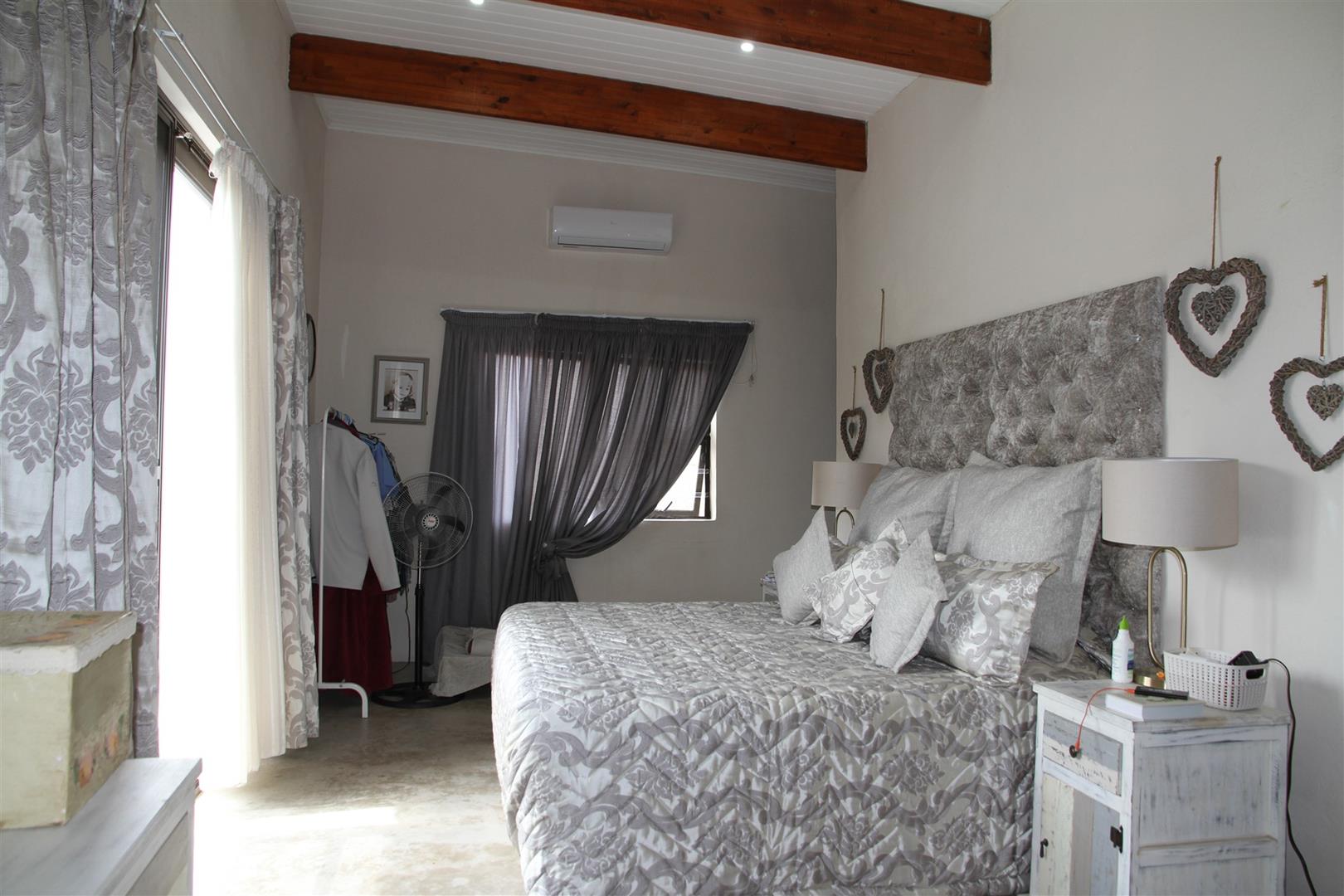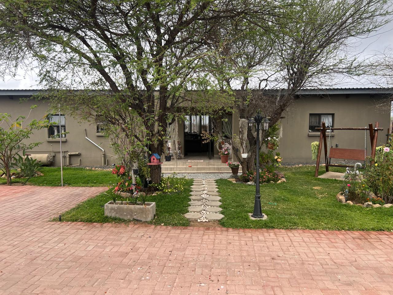 Additional features include paved entrance, 2 open parking bays, automated gate access, an open-sided double garage, natural latte fencing around a lovely landscaped garden with lawns and acacia trees, a water feature, water storage and filtration systems, and a separate outside toilet.