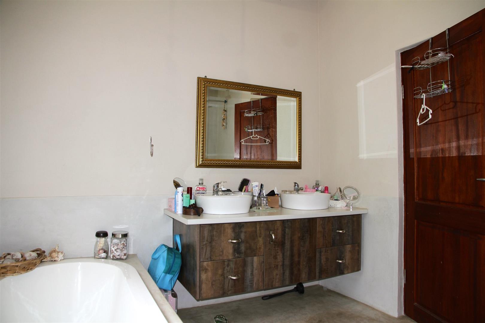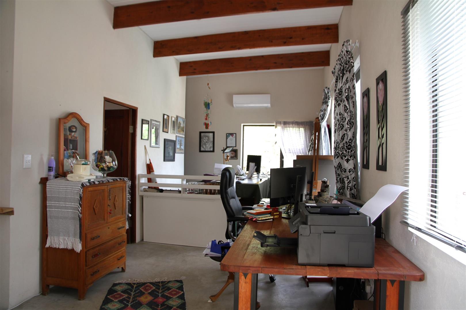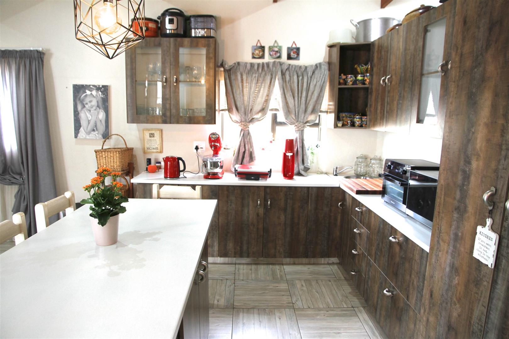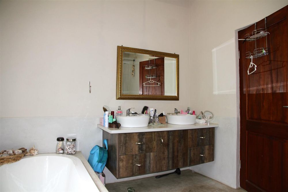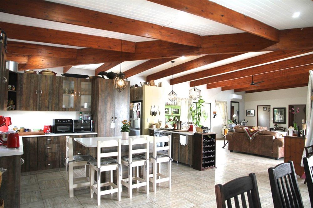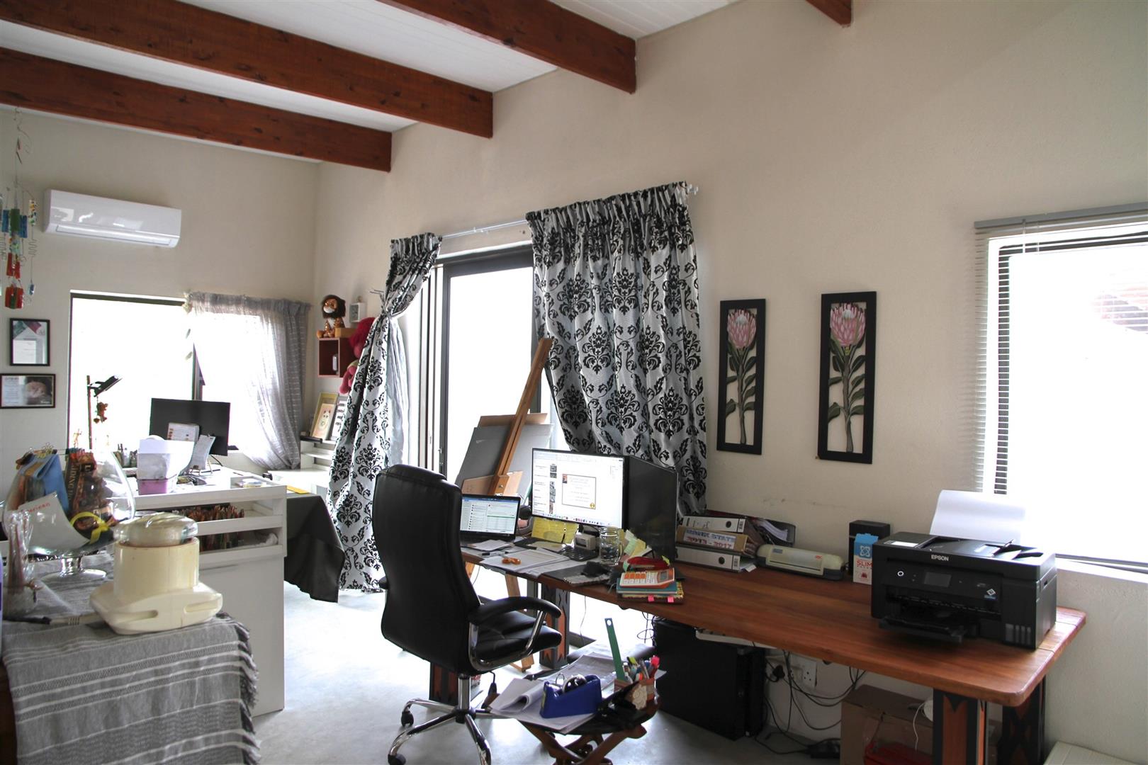 Additional features include paved entrance, 2 open parking bays, automated gate access, an open-sided double garage, natural latte fencing around a lovely landscaped garden with lawns and acacia trees, a water feature, water storage and filtration systems, and a separate outside toilet.