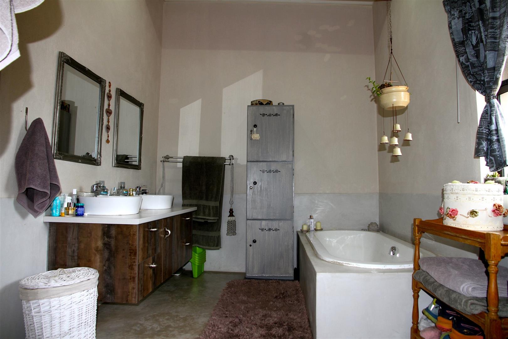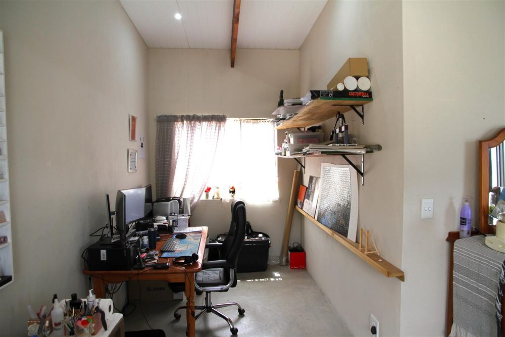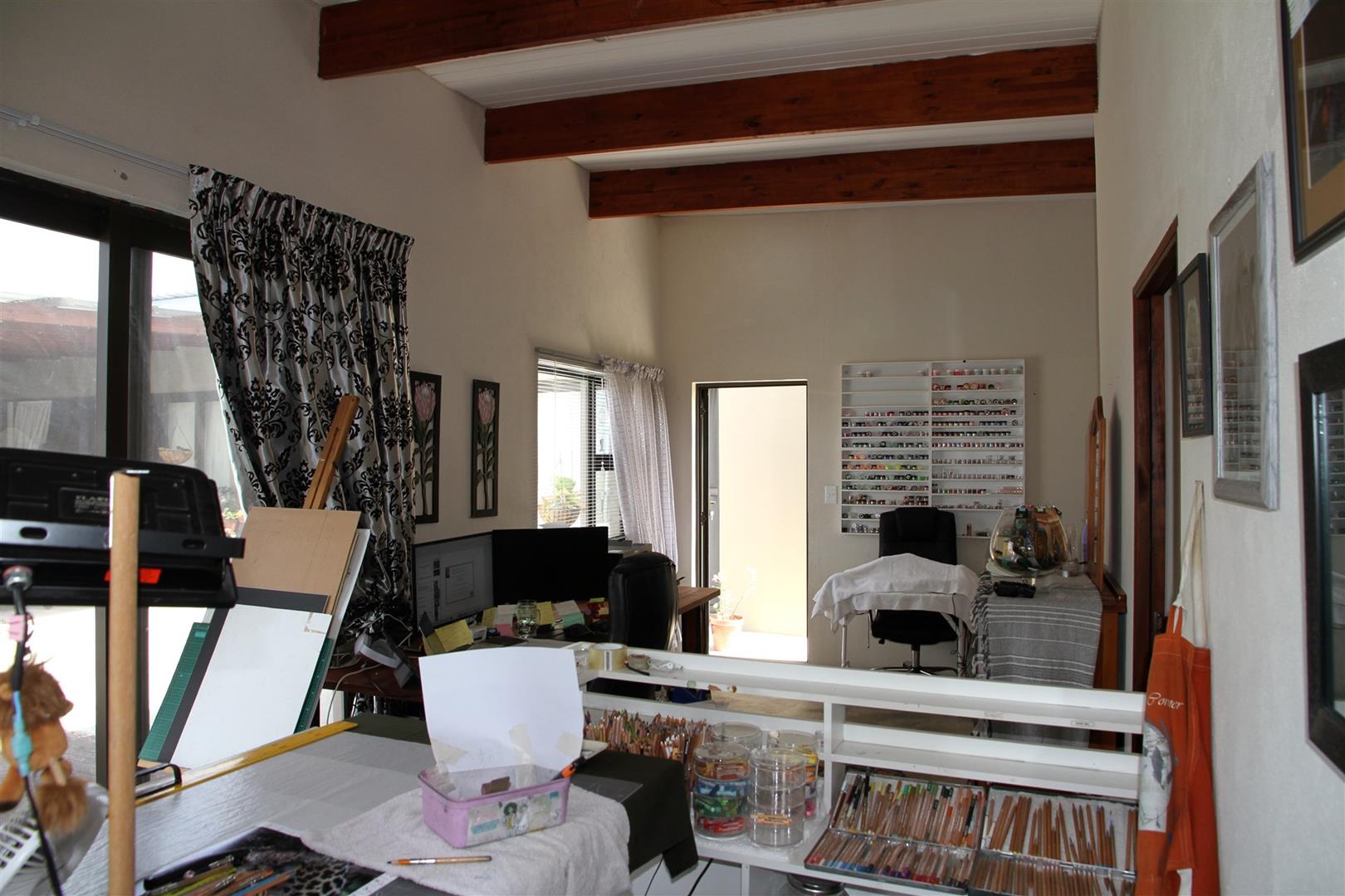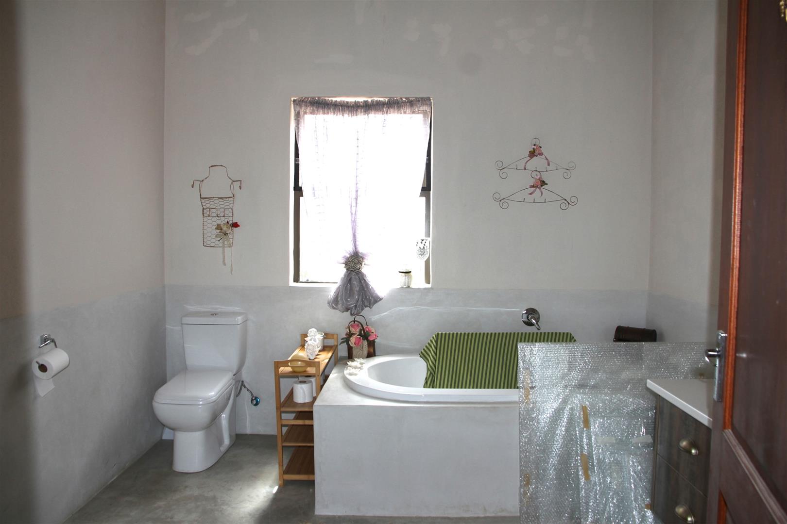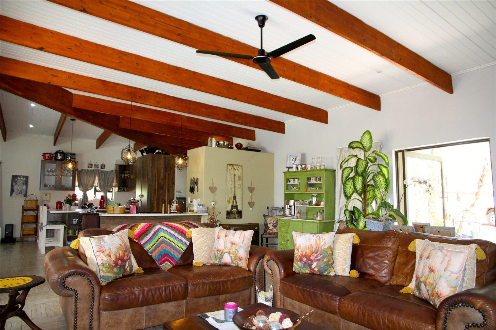 Additional features include paved entrance, 2 open parking bays, automated gate access, an open-sided double garage, natural latte fencing around a lovely landscaped garden with lawns and acacia trees, a water feature, water storage and filtration systems, and a separate outside toilet.