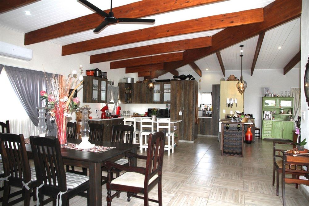 This inviting home in Hoedspruit Wildlife Estate features three full en-suite bedrooms, spacious open-plan living, dining and kitchen area with a separate scullery. The living space is enhanced by high vaulted ceilings, natural wood beam finishes, warm color tones and cool screed flooring. Two of the bedrooms are situated within the main living area while the third and larger bedroom is set apart and overlooks the elevated swimming pool with mountain views. All the bedrooms have walk-in closets and this home is fitted with air-conditioning and ceiling fans throughout, as well as a separate guest toilet.