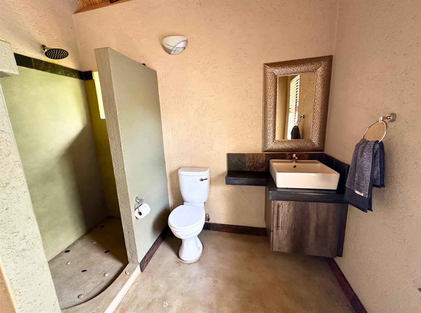 The property is open and unfenced, allowing the home to blend naturally into its surroundings. A salt-chlorinated swimming pool and boma area provide ideal spaces for relaxed outdoor living and entertaining.