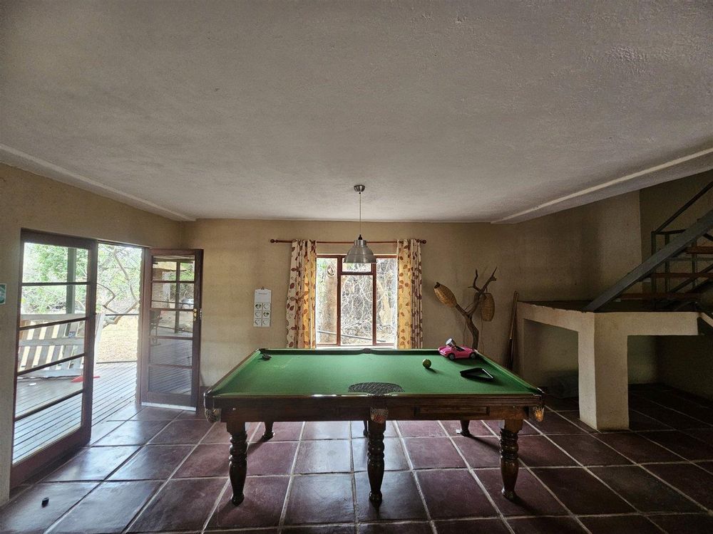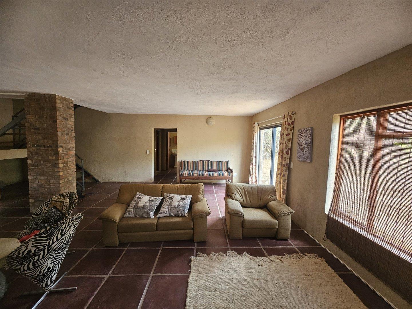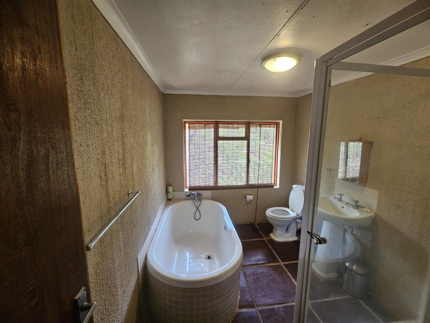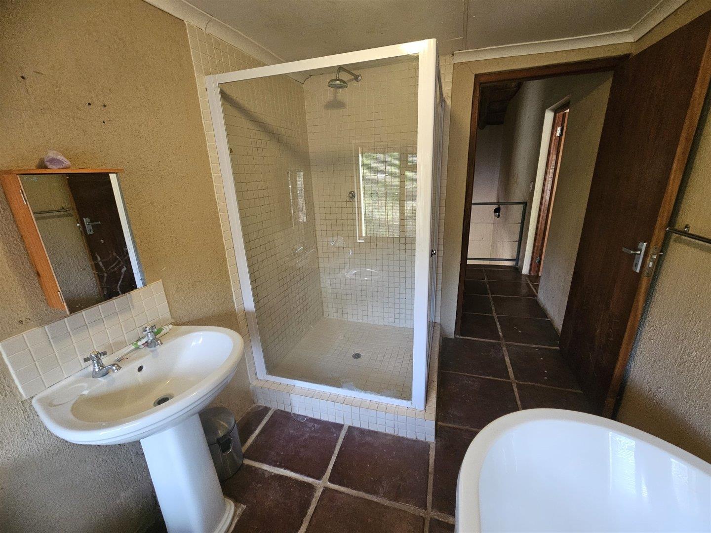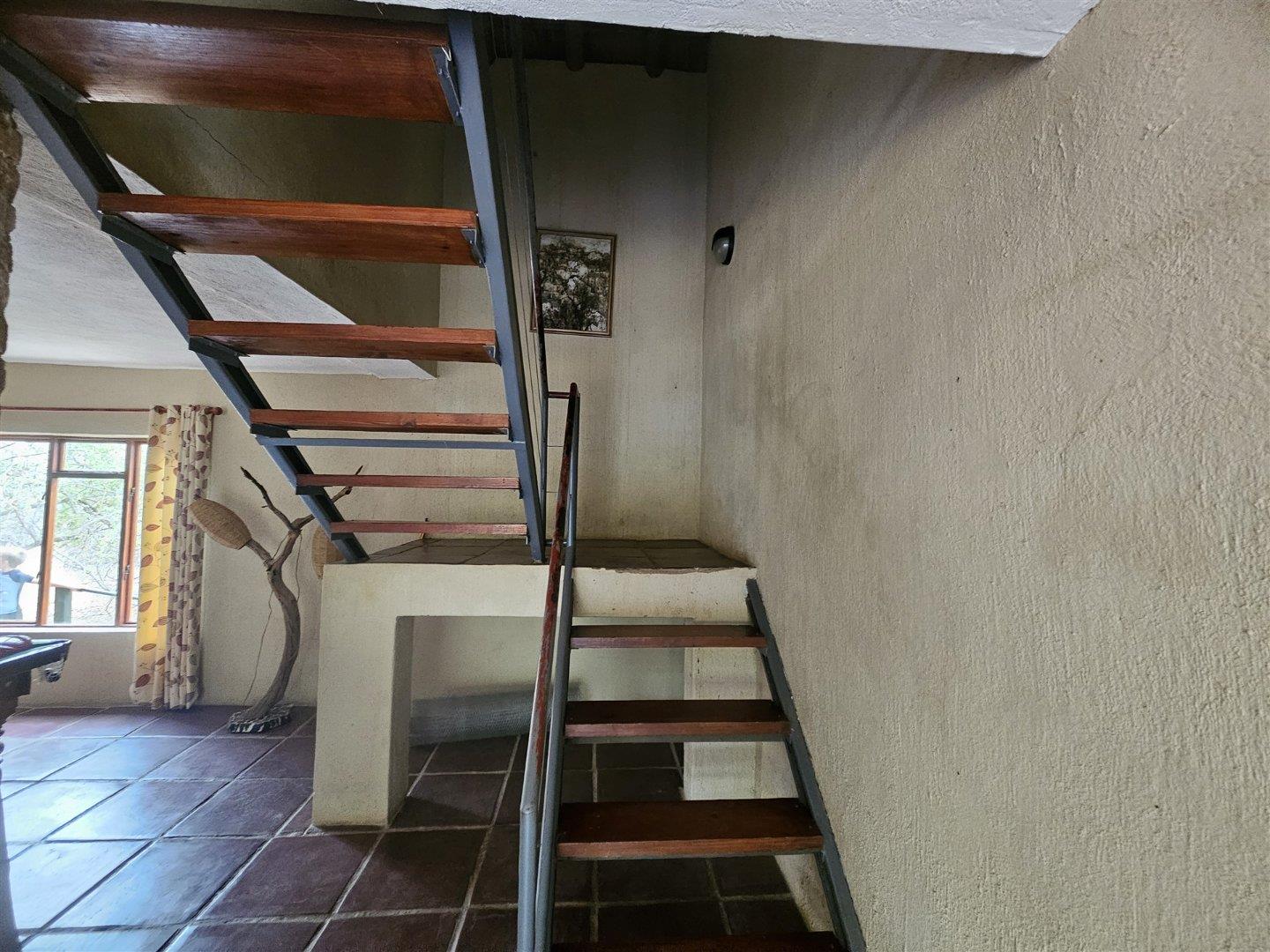 Immerse yourself in the tranquility of Escarpia Eco Estate in this very spacious home. Entertain in the huge dining room/games room/entertainment area/kitchen, which has a built in braai. Cross over a covered deck/walkway into a large sitting room, which leads upstairs to the bedrooms. There is 1 bedroom downstairs with a bathroom, guest toilet and study/office. The downstairs bathroom has a shower, toilet and basin. All floors are tiled. There is also an outside braai area.