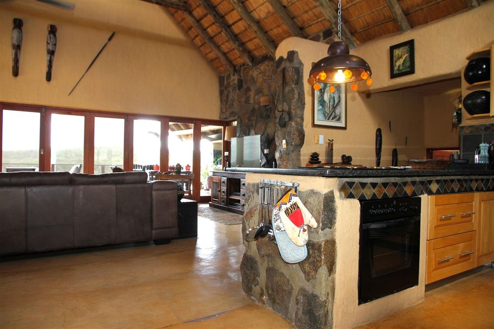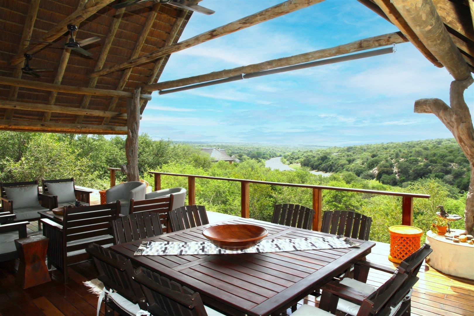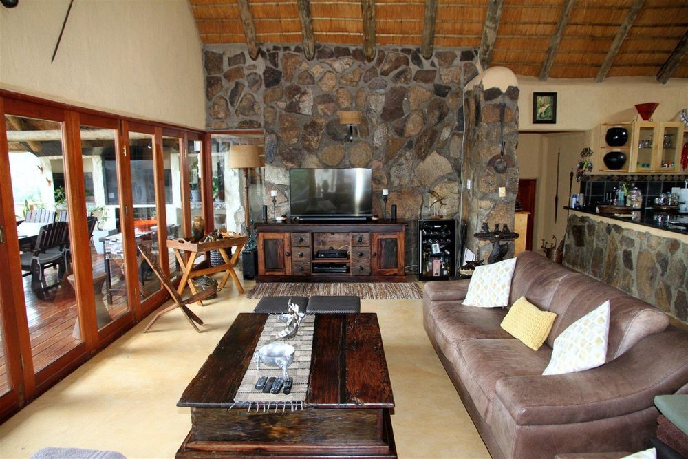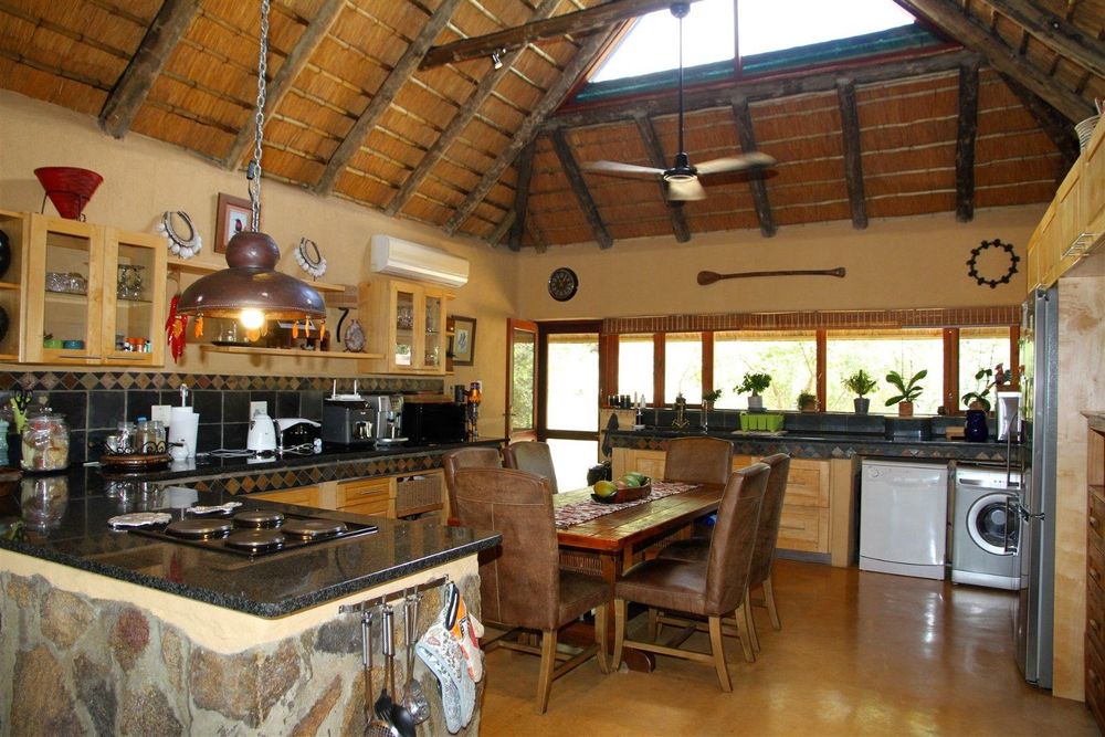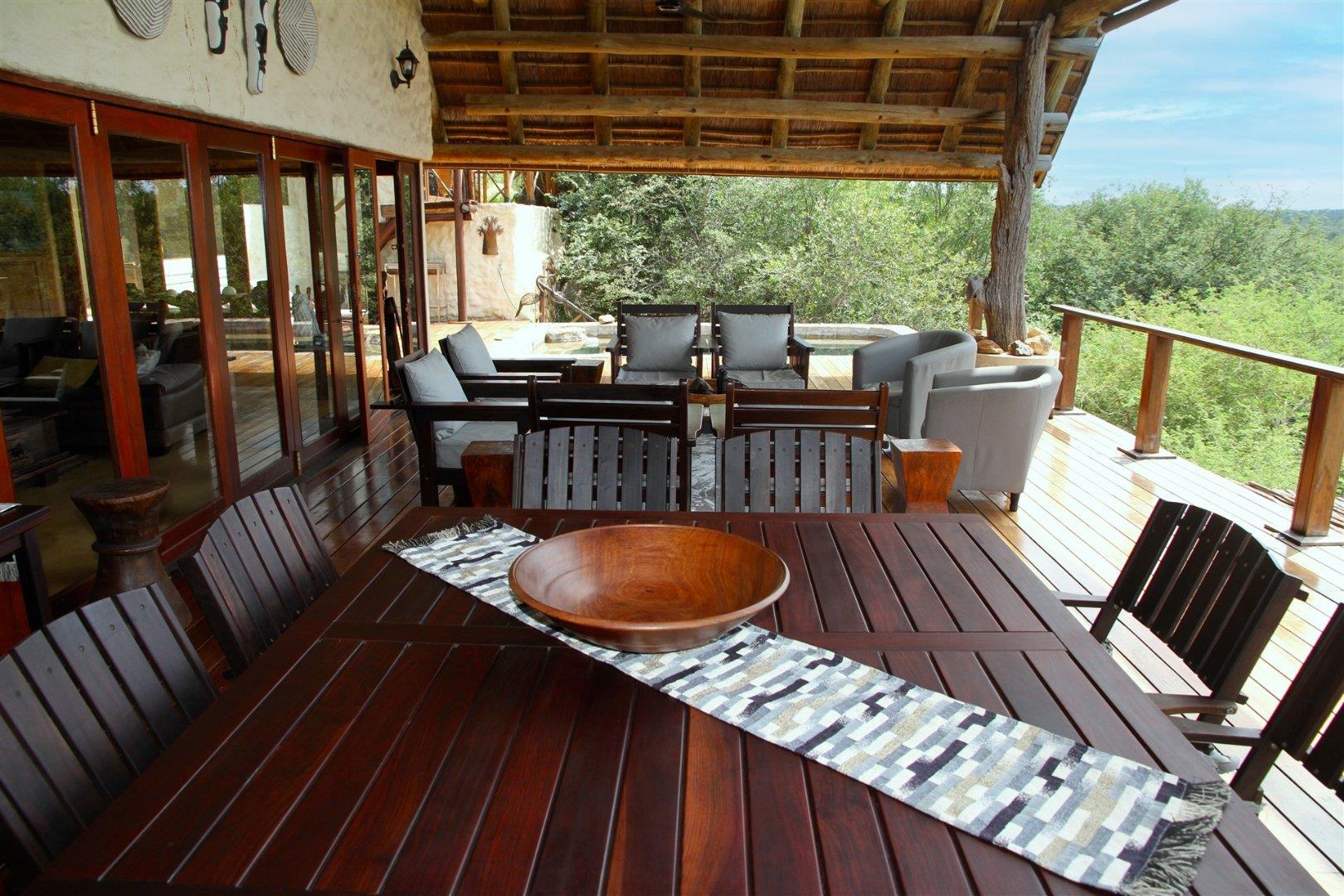 The residence features four well-appointed bedrooms, with two located at ground level and two positioned below, separate from the main living space and ideal for hosting guests while maintaining privacy and comfort. The layout is both practical and inviting, catering to relaxed bush living and entertaining. At the heart of the home is a spacious kitchen, thoughtfully designed with a central focus on the dining table creating a warm and social space where meals can be prepared while still enjoying the company of family and friends. The open-plan living room flows from the kitchen and extends out onto a spectacular covered patio with built in barbecue facilities. This outdoor living area is truly a highlight of this home, offering breathtaking, uninterrupted views over the Olifants River and escarpment with plenty of comfortable seating. It connects beautifully to the swimming pool deck, creating the perfect setting for entertaining, relaxing, or simply soaking in the sights and sounds of the African bush.