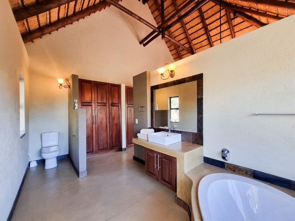The main bedroom is en-suite and features built-in cupboards, sliding doors, and a large window with shutters that seamlessly connect the interior with the surrounding bushveld. The en-suite bathroom includes a bath, basin, toilet, and an outdoor shower.