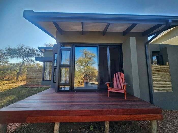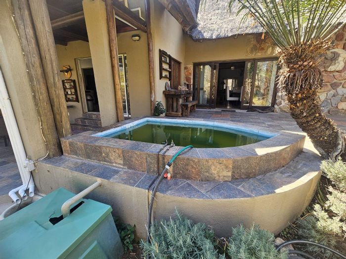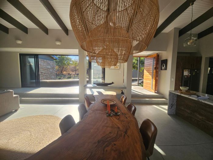 Sliding doors lead out onto a huge, covered patio, featuring a sitting area, dining table with seating for 6, outside bar and built-in braai. Enjoy your evenings in the warm South African evenings under the night-sky around the boma and fire-pit or while away your days in the inviting pool. Spectacular views of the mountain can also be seen from the deck.