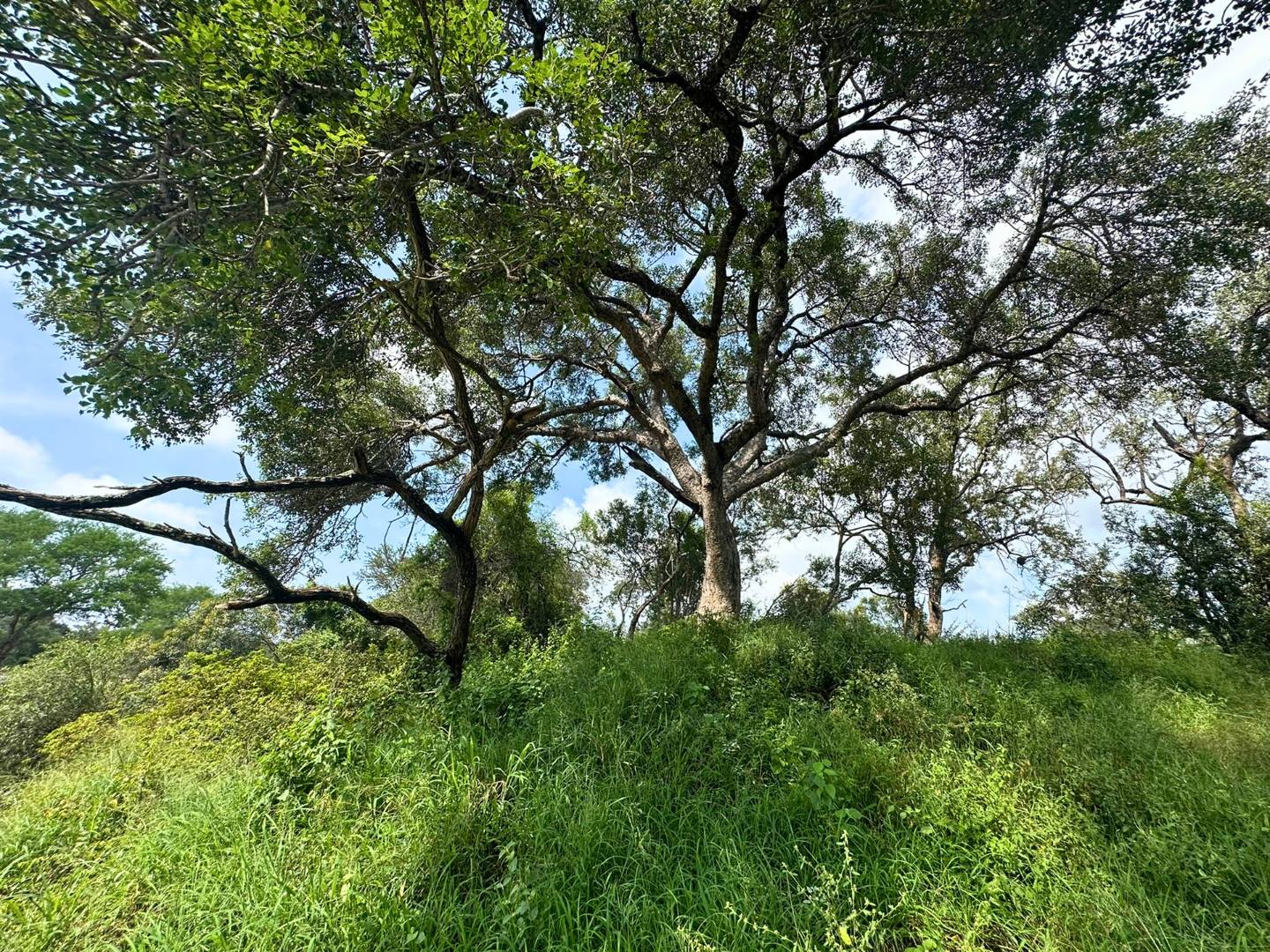 The vegetation is well established, with mature Leadwood, Marula, Knobthorn and Scotia trees spaced across the stand, creating a mix of shaded and open areas rather than dense or overgrown bush.