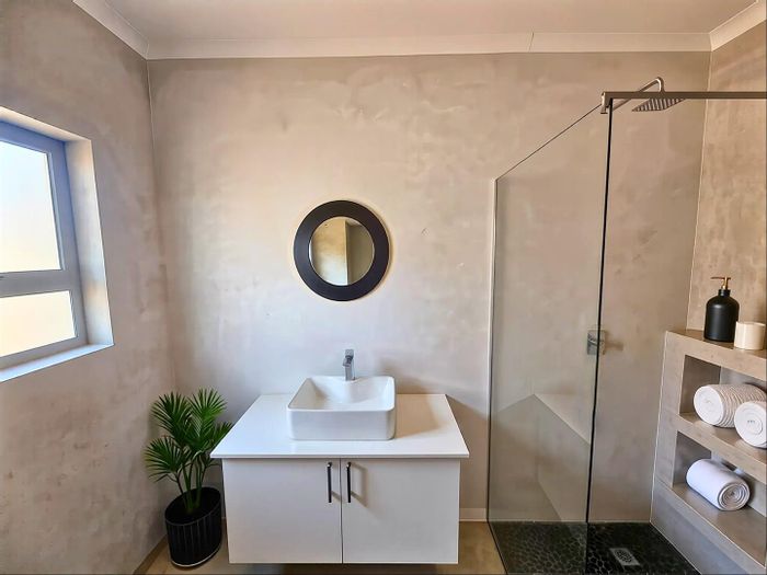 Live sustainably minutes from town in an exclusive, pet-friendly development — open-plan indoor-outdoor flow with covered patio and built-in braai, two en-suite bedrooms and single garage.
