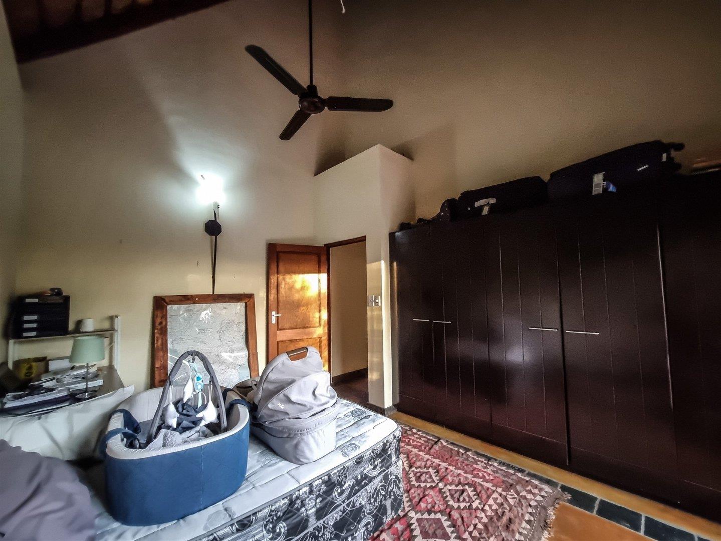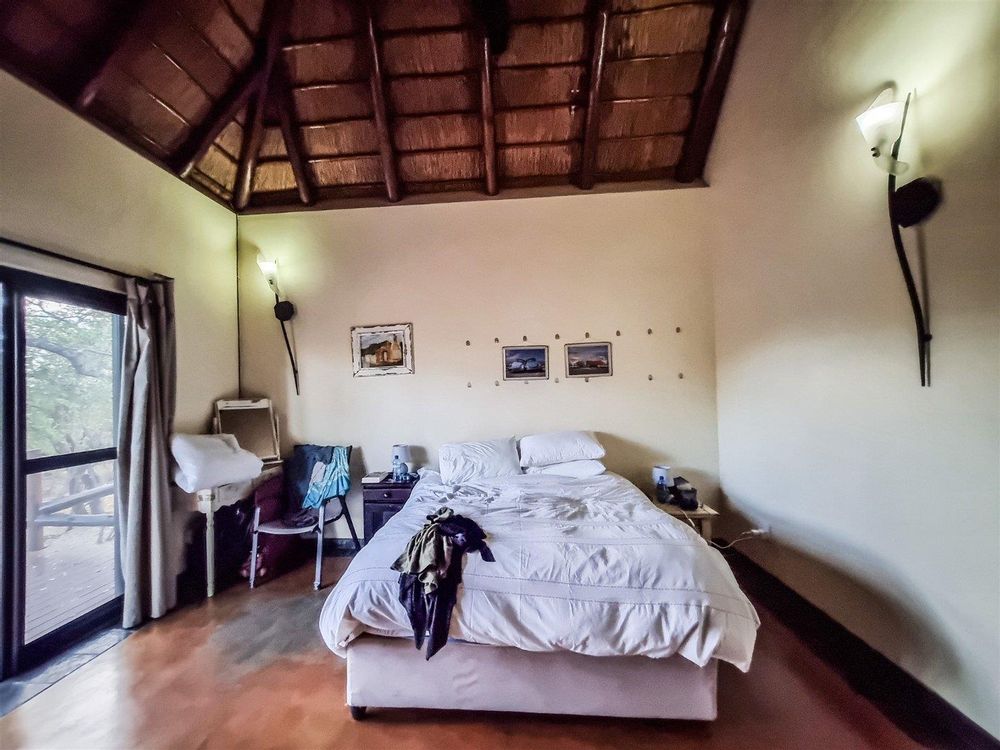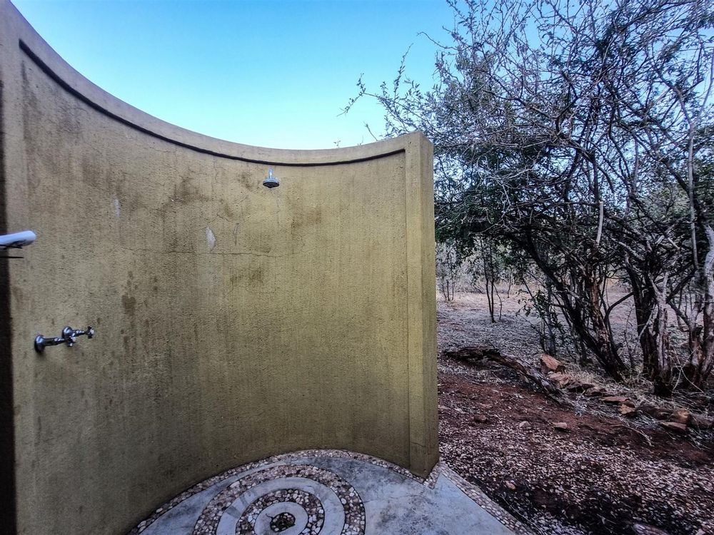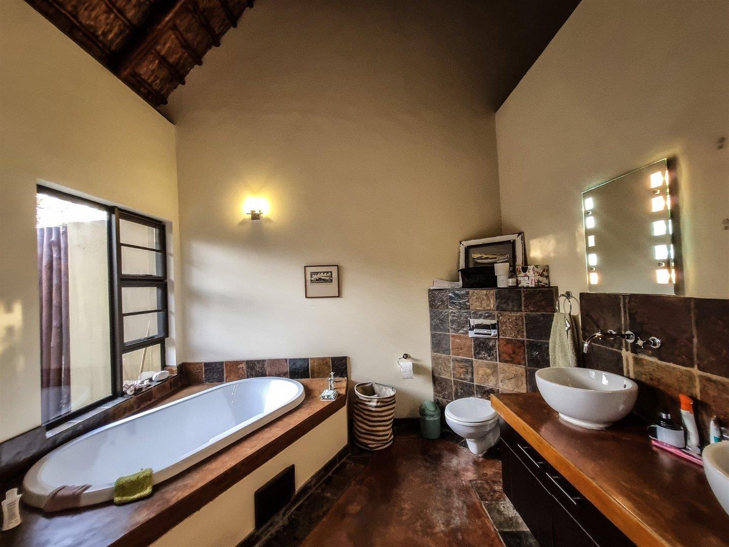 The main bedroom is en-suite, complete with built-in cupboards, a ceiling fan, and a luxurious bathroom featuring a double basin, toilet, bathtub, and both indoor and outdoor showers—perfect for embracing the bushveld lifestyle.