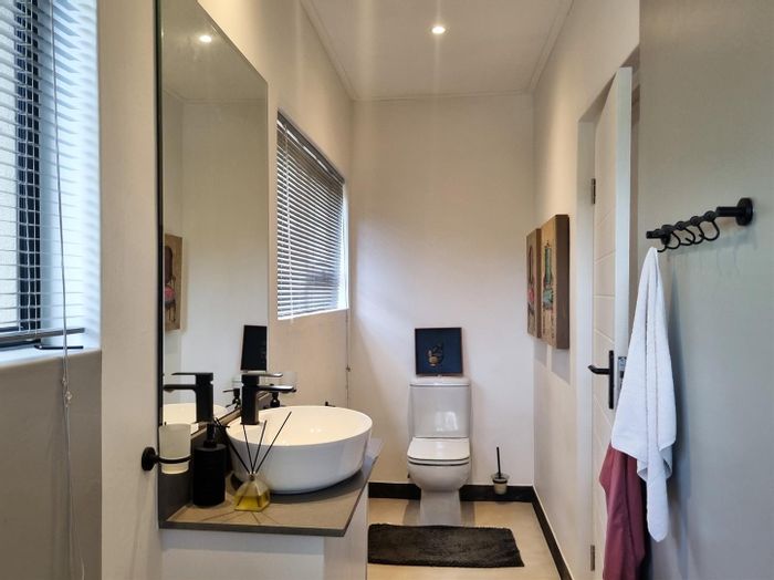 The main bedroom offers a peaceful retreat with built-in cupboards, air conditioning, and sliding doors that open onto the patio. Its en-suite bathroom features a basin, bath, and both indoor and outdoor showers.