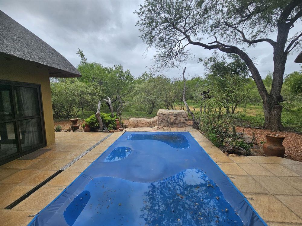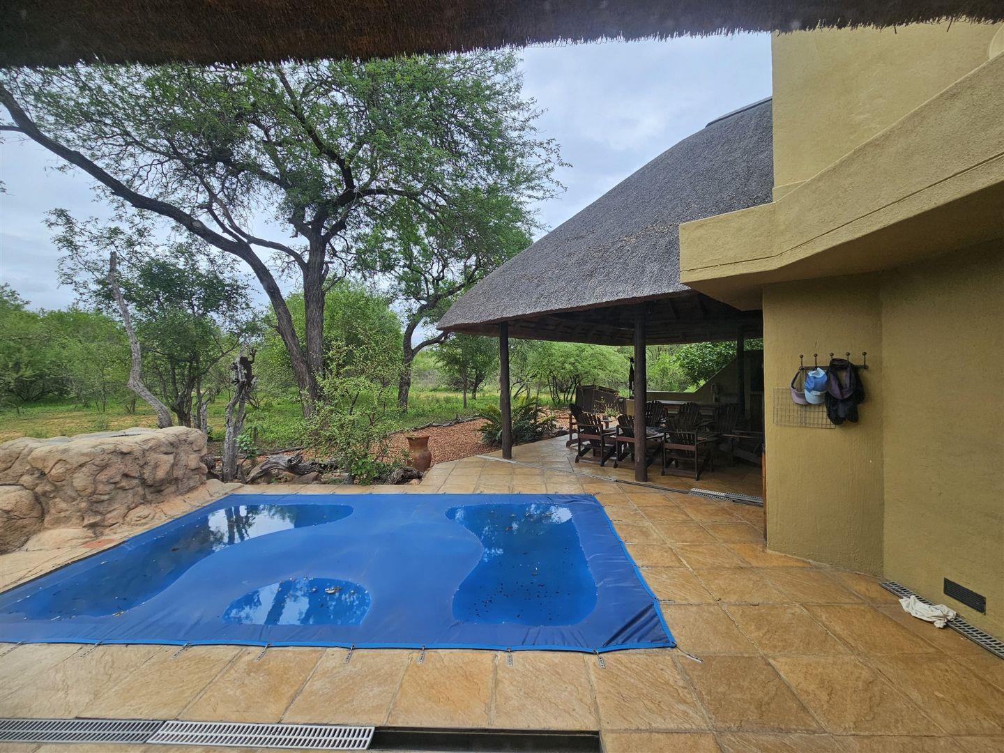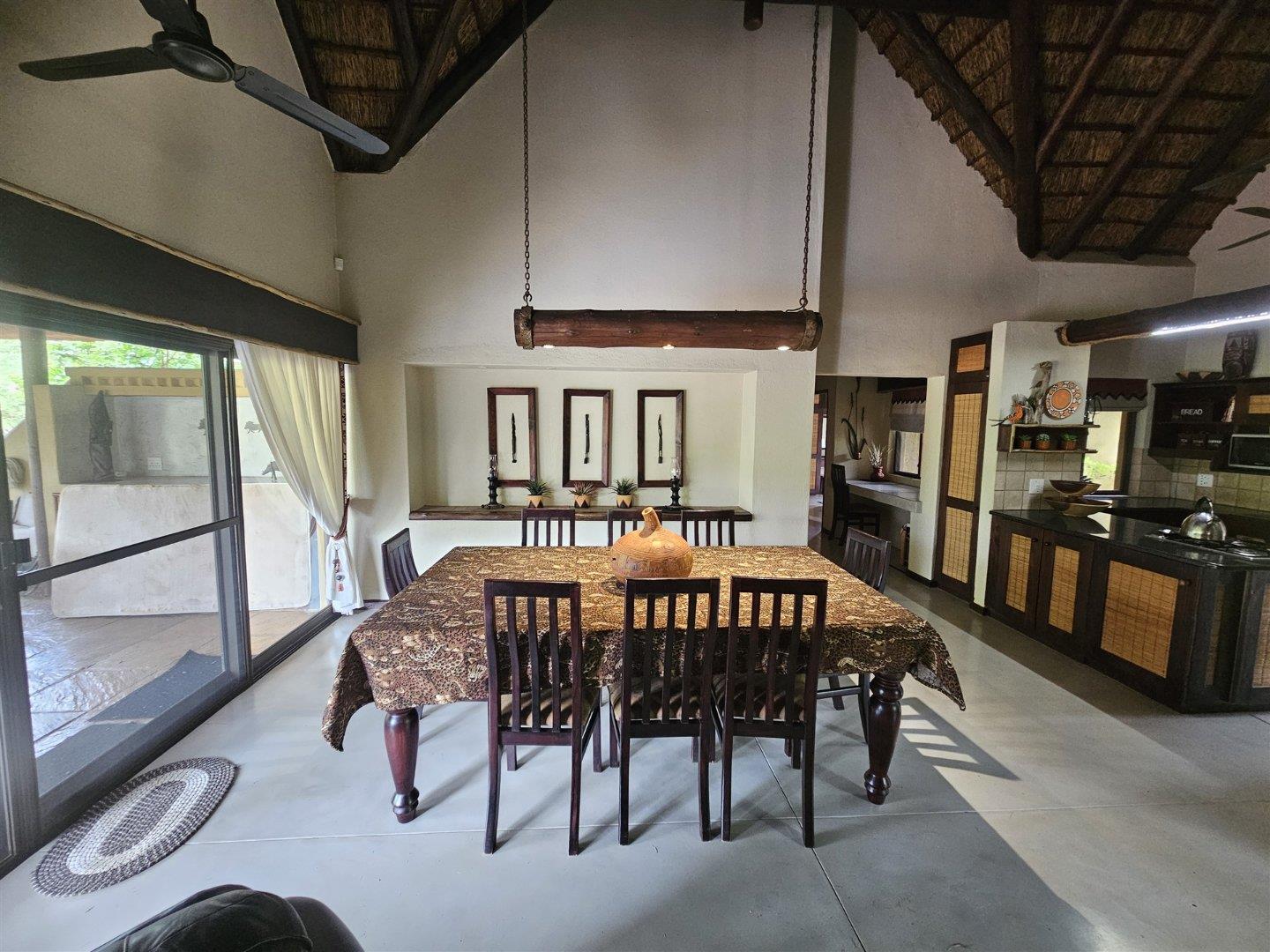 The lounge/dining room opens up to a huge covered patio with two large tables, plenty of seating and a braai area overlooking the bush, with the swimming pool alongside.