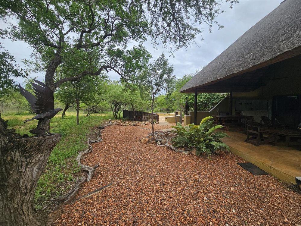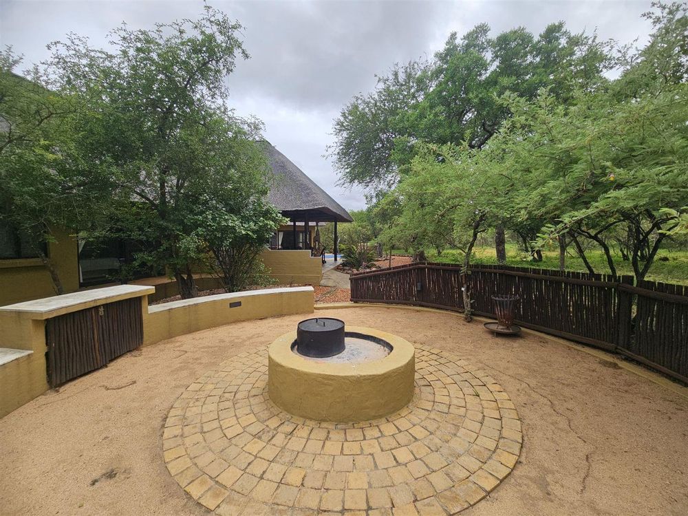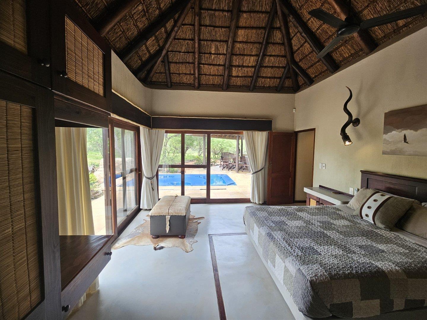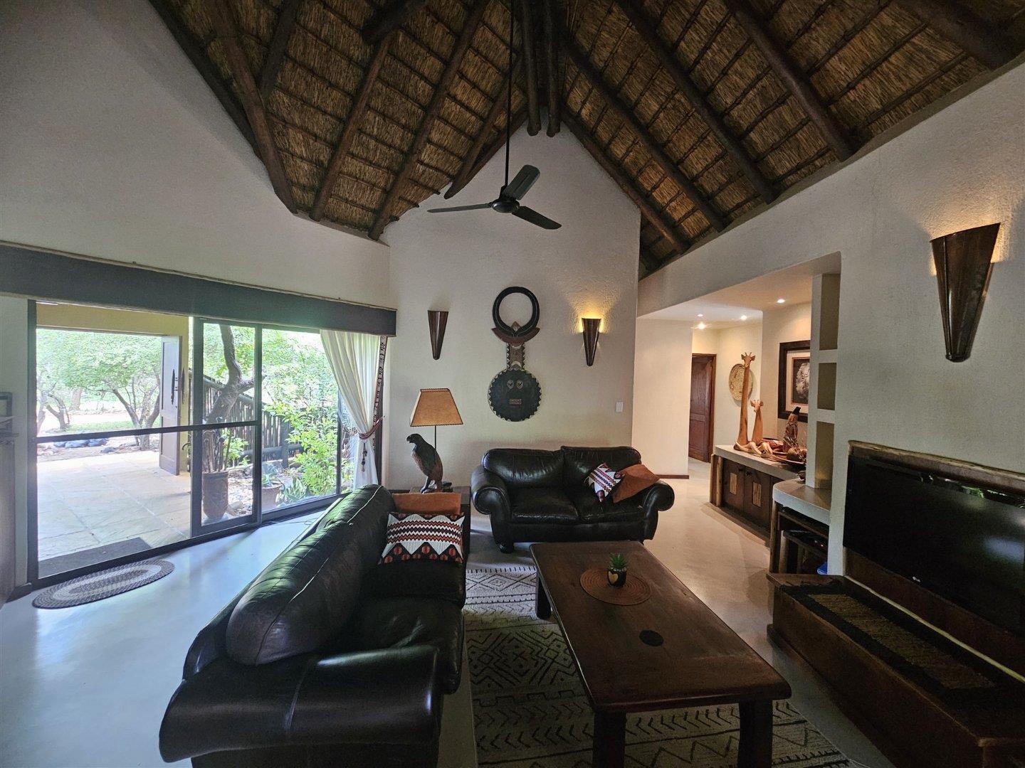 The lounge/dining room opens up to a huge covered patio with two large tables, plenty of seating and a braai area overlooking the bush, with the swimming pool alongside.