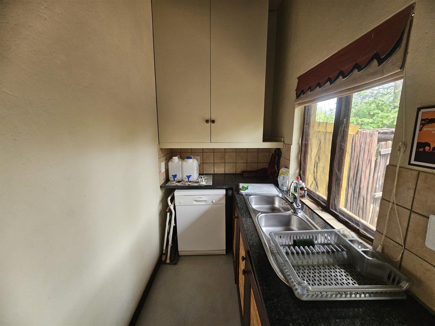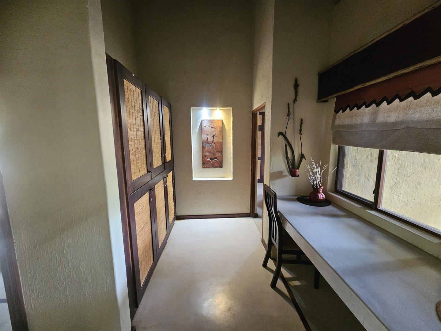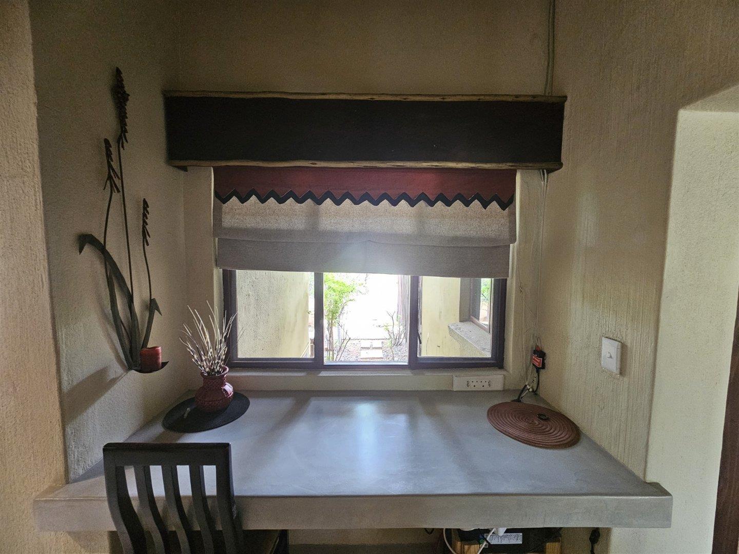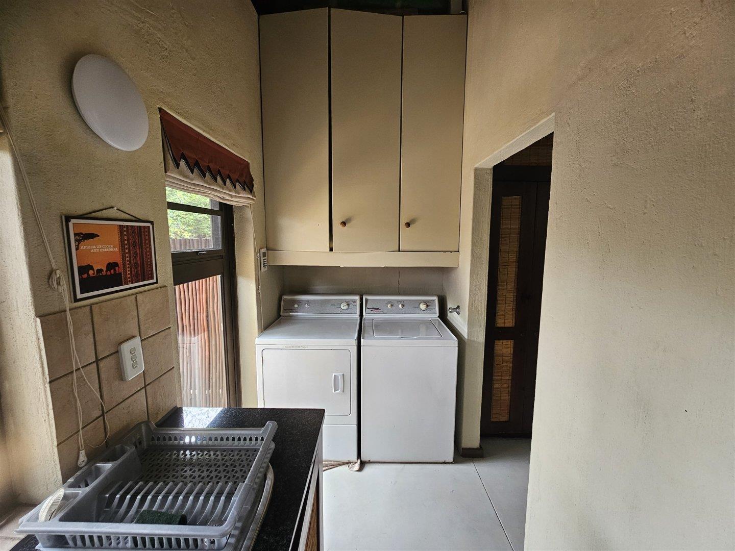 Enjoy the tranquility of the African bush in this beautiful, fully furnished 4 bedroom house in a lovely, peaceful part of Raptors View. This home is move-in ready and has a spacious open plan lounge and dining room cooled by fans, with the kitchen and separate scullery alongside. There is also an outside courtyard. The scullery has a washing machine, tumble dryer and washing machine.