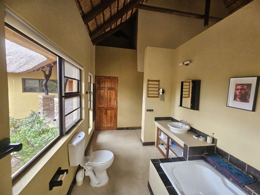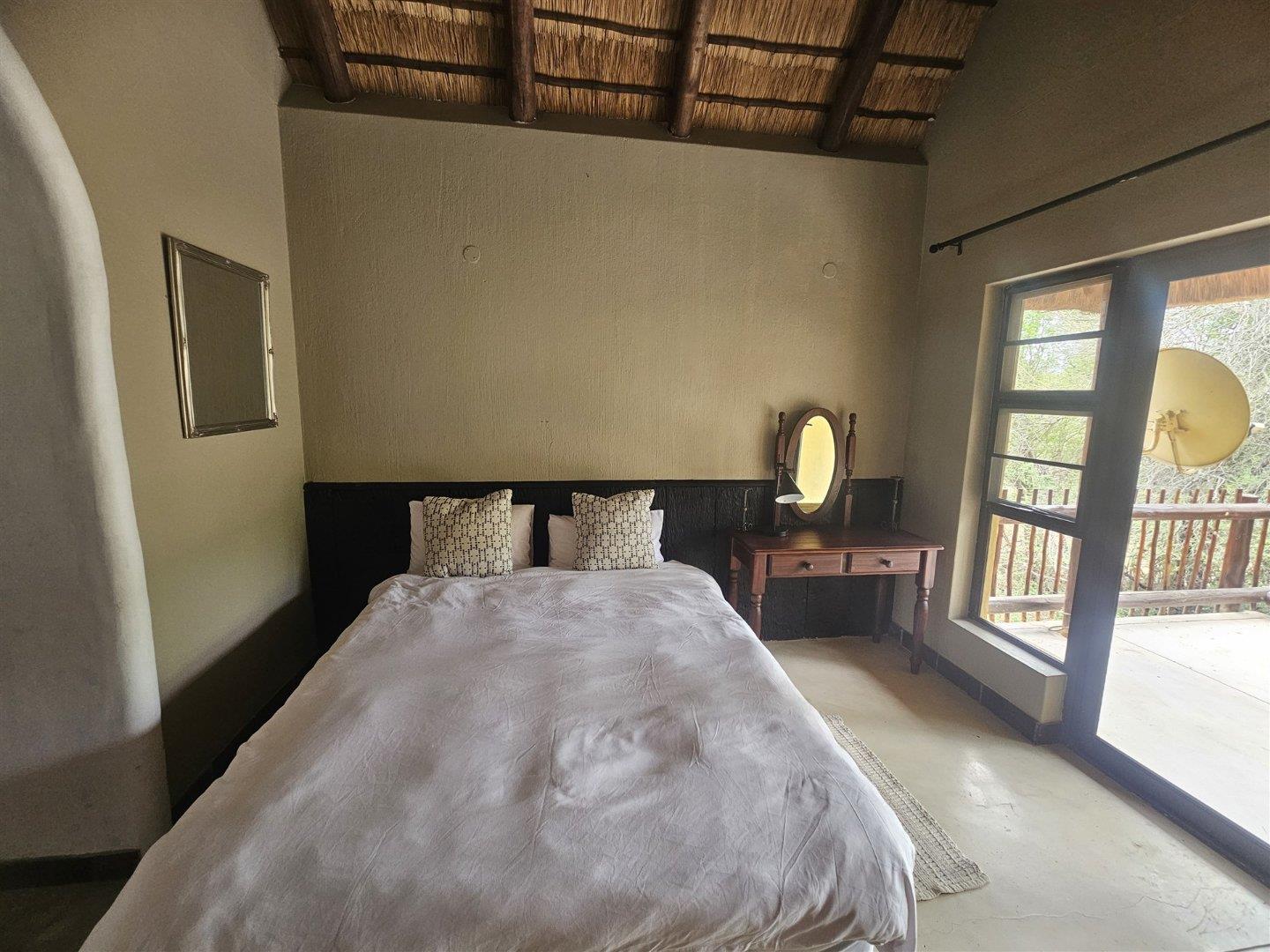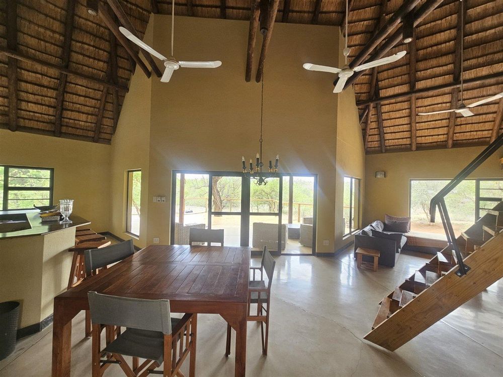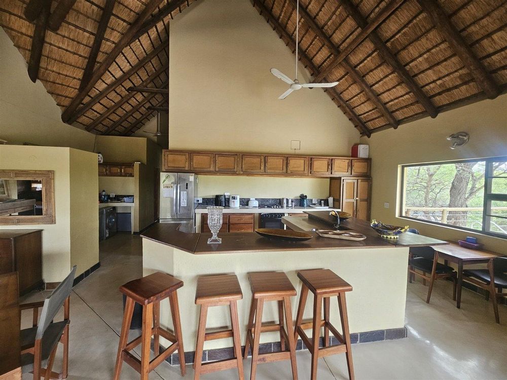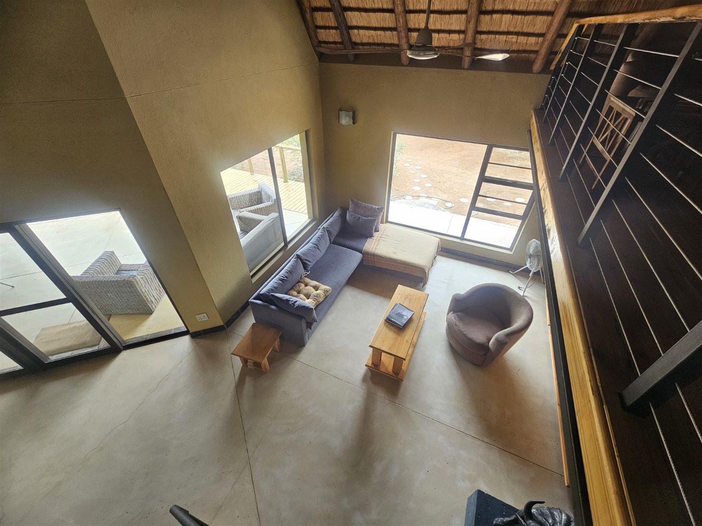 There is a large open-plan kitchen with scullery, dining room and living room. An interesting feature is the upstairs library looking over the lounge area. This comfortable area has sliding doors which lead to a spacious covered deck area with pool and boma overlooking the bush.