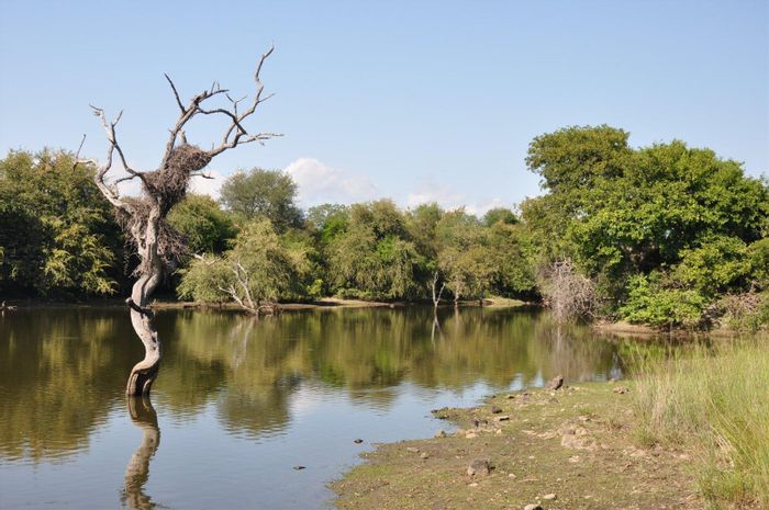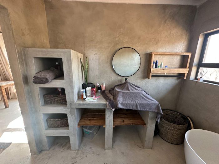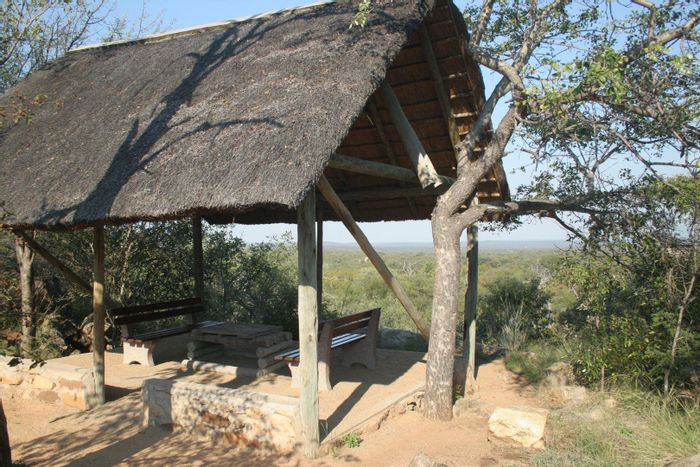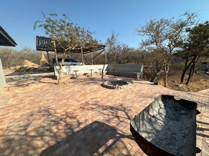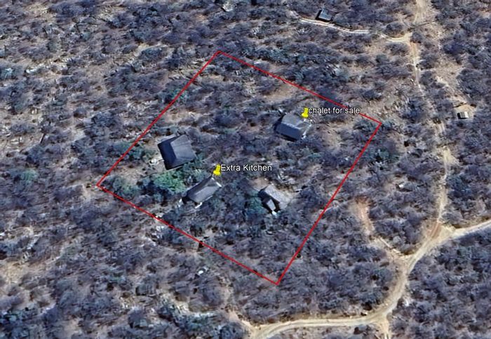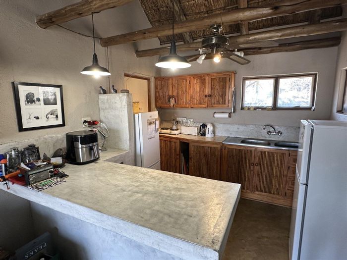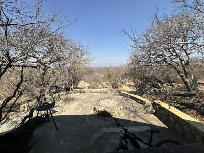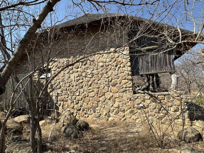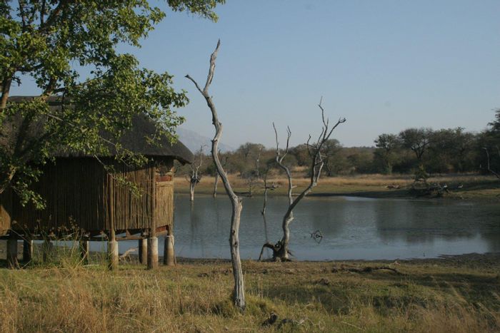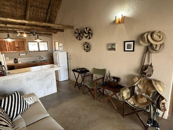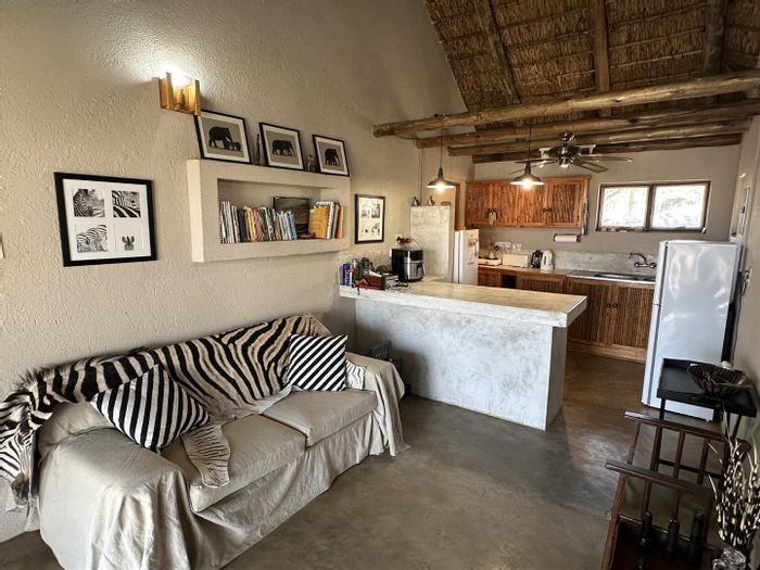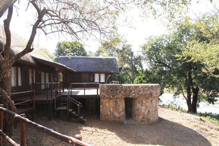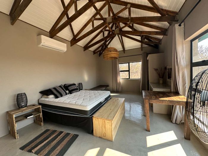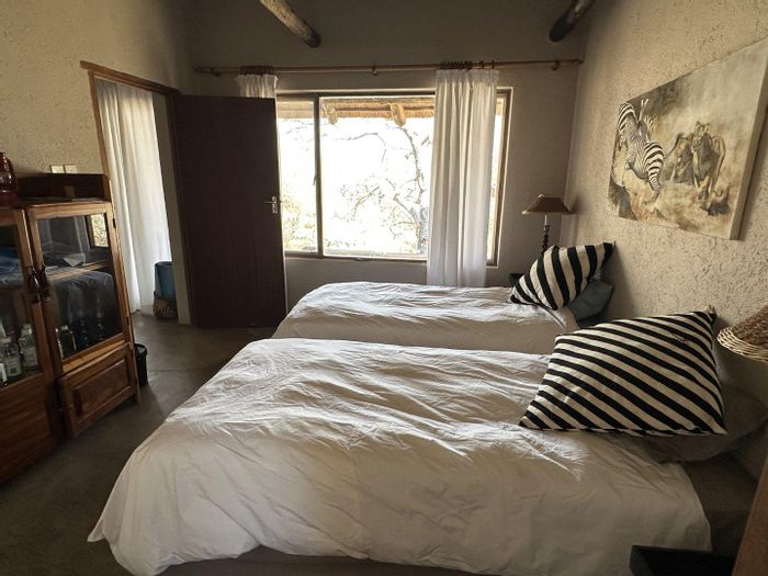 Private bush chalet with two en-suite bedrooms on a 2,500ha reserve bordering the Olifants River, rock-and-leadwood character, Drakensberg views, private patio, outdoor shower, shared communal kitchen and boma.