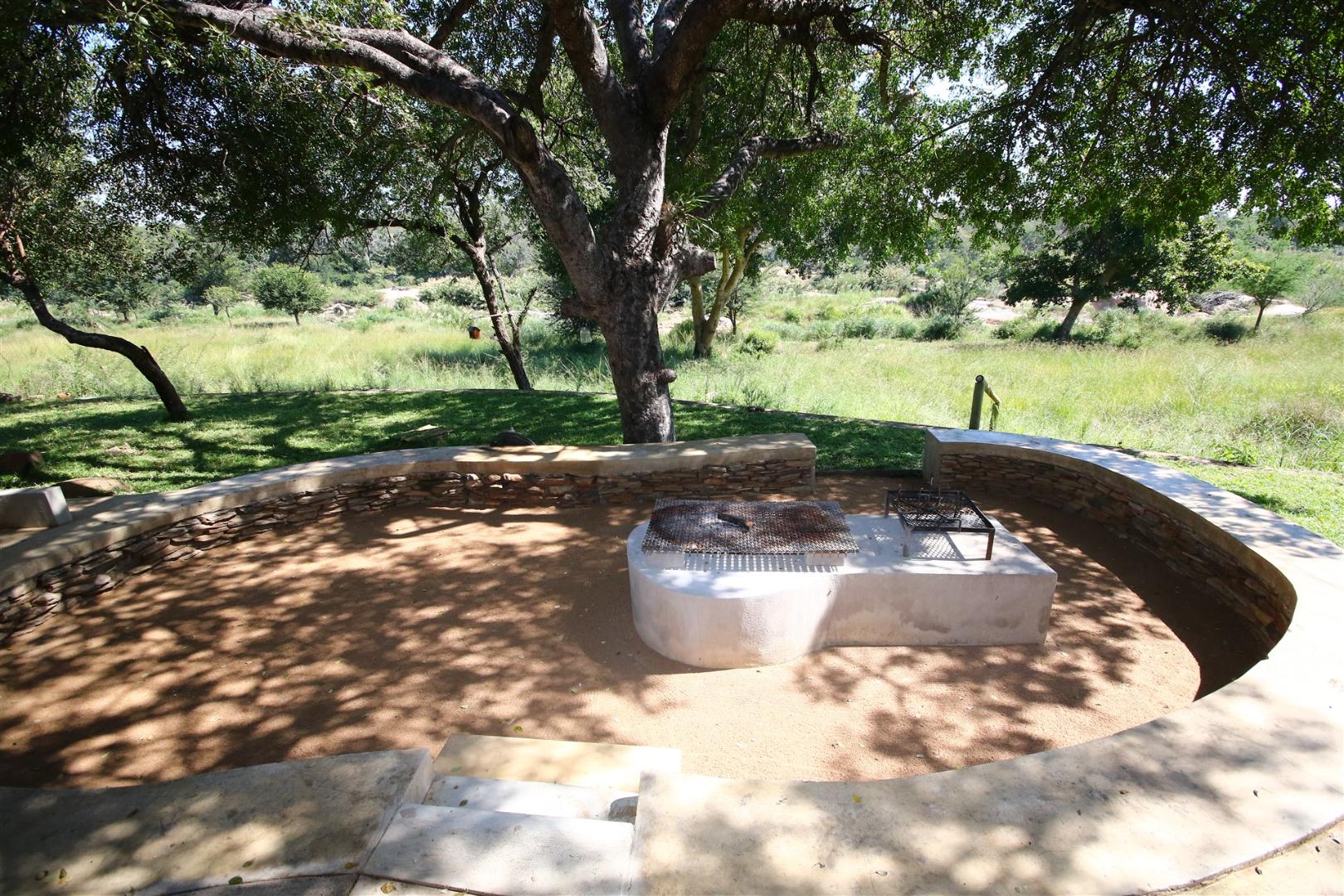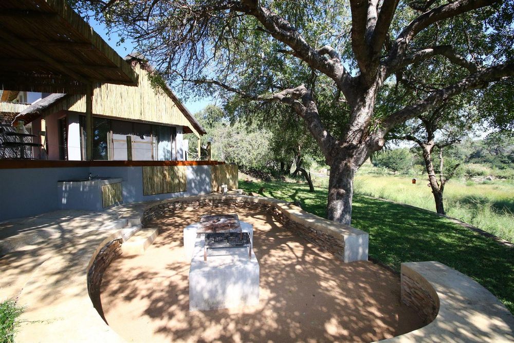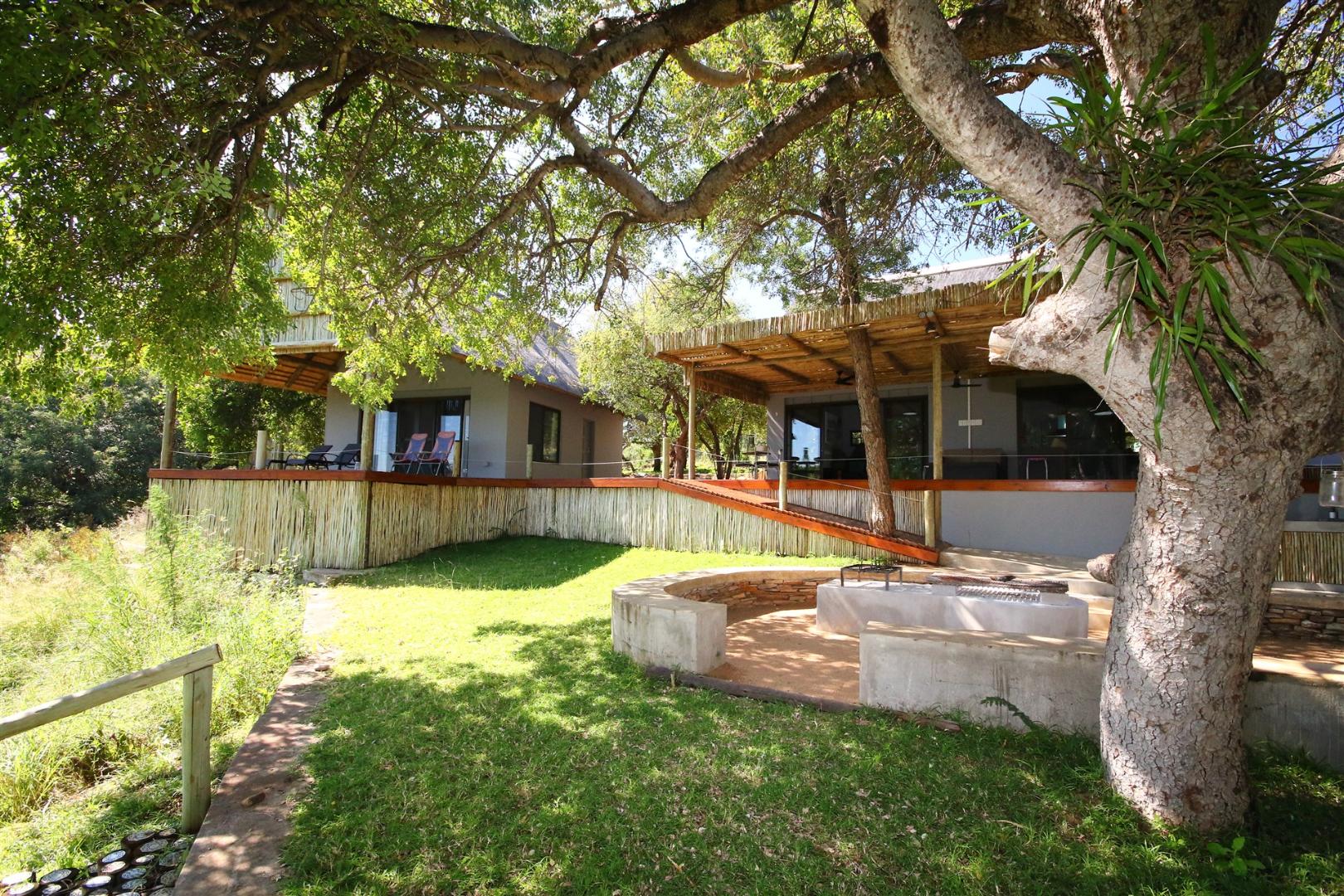 * Large river-facing patio with fire pit and braai area, shaded by a Marula tree
