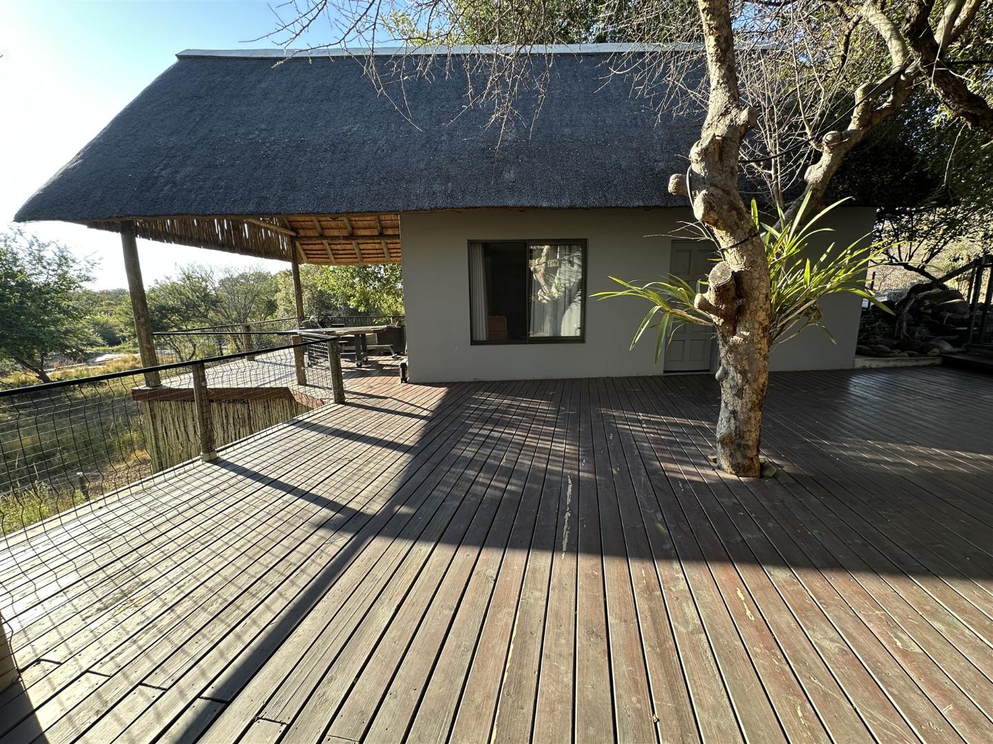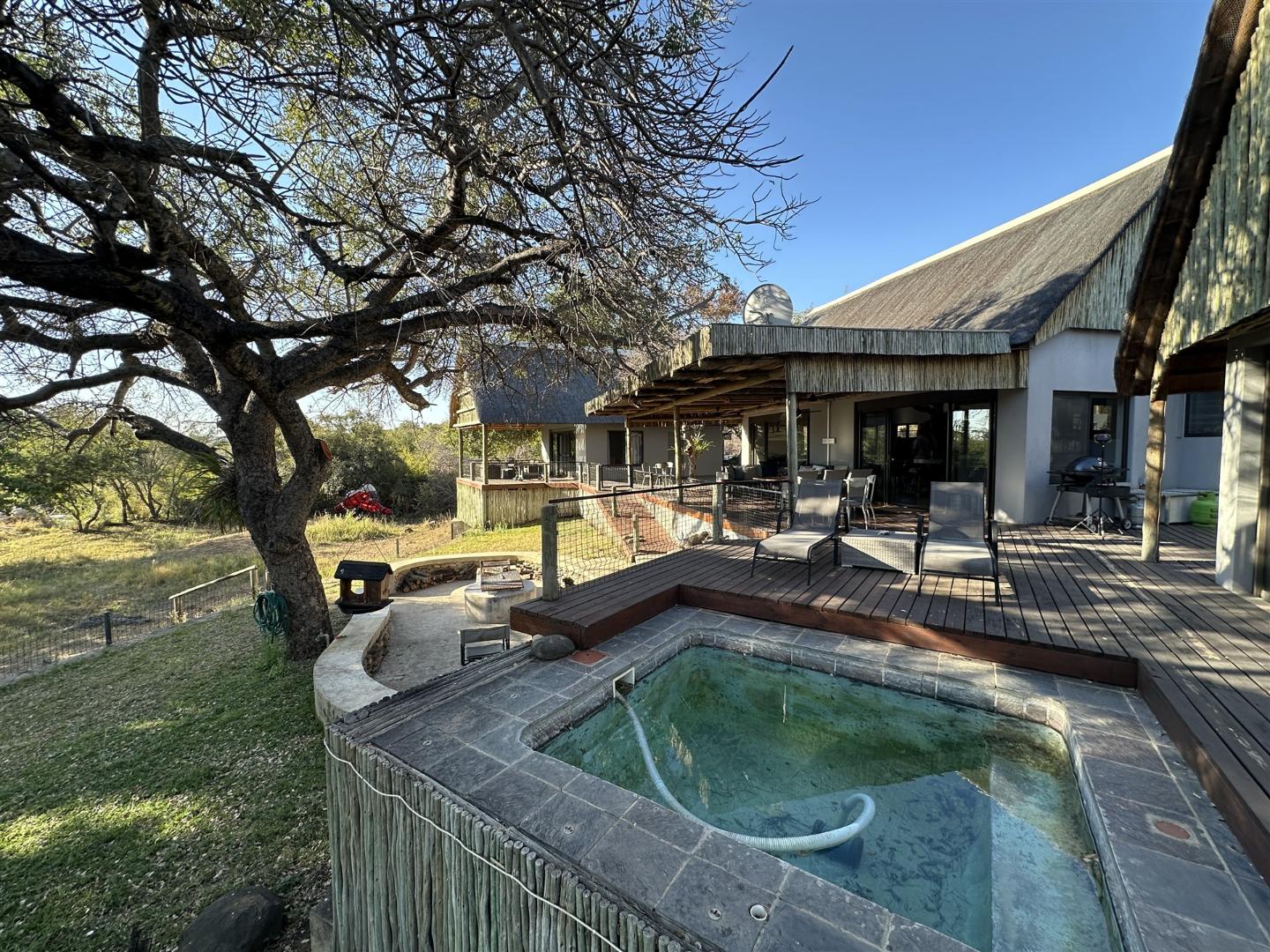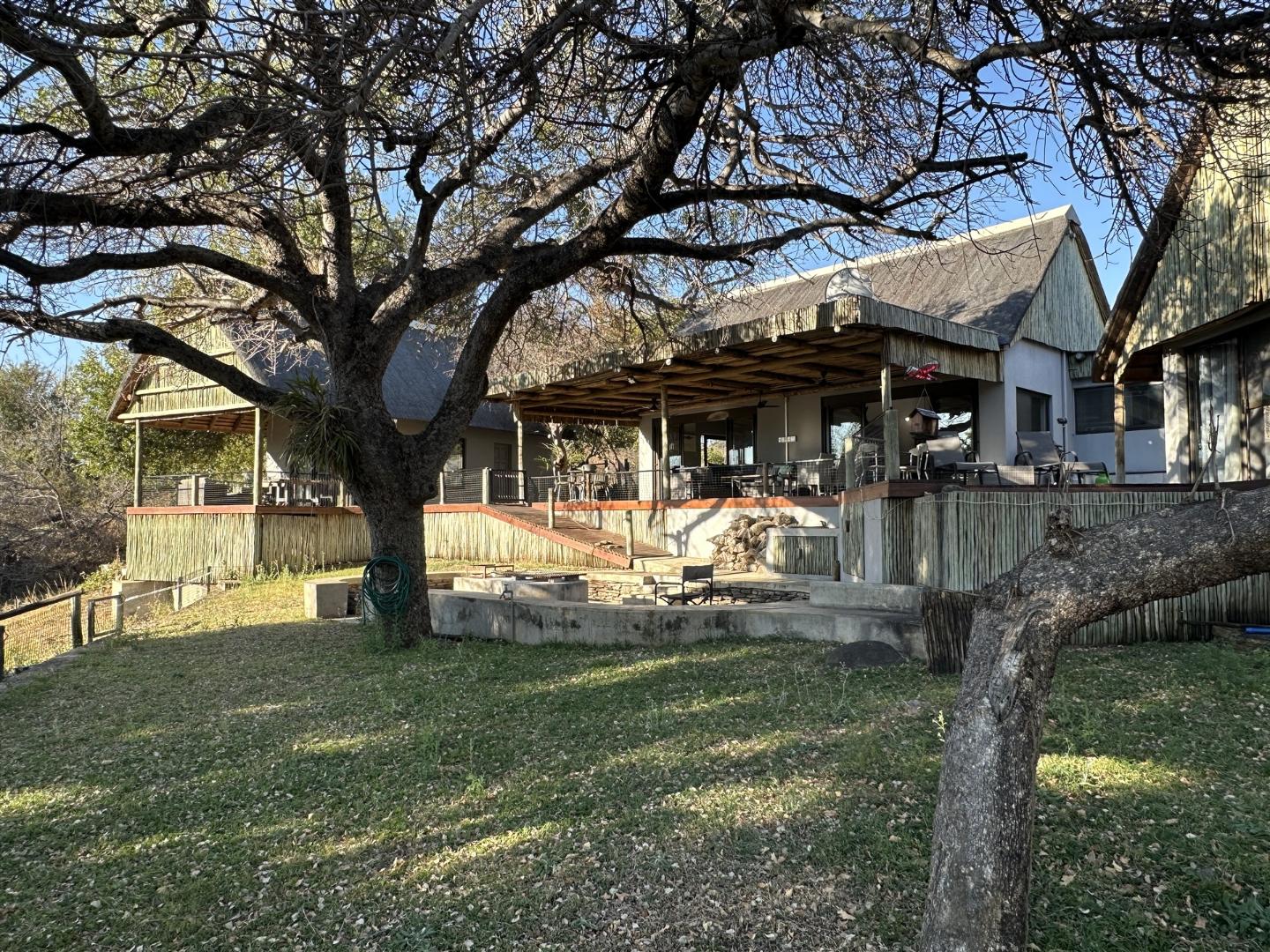 * Large river-facing patio with fire pit and braai area, shaded by a Marula tree