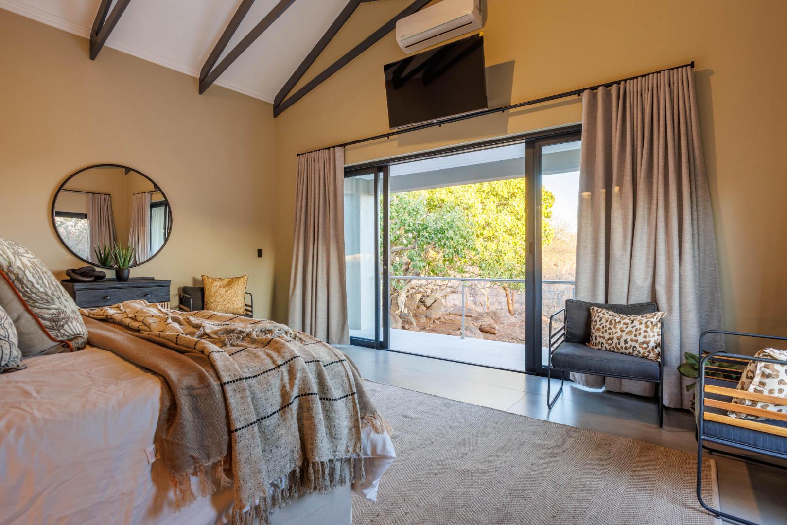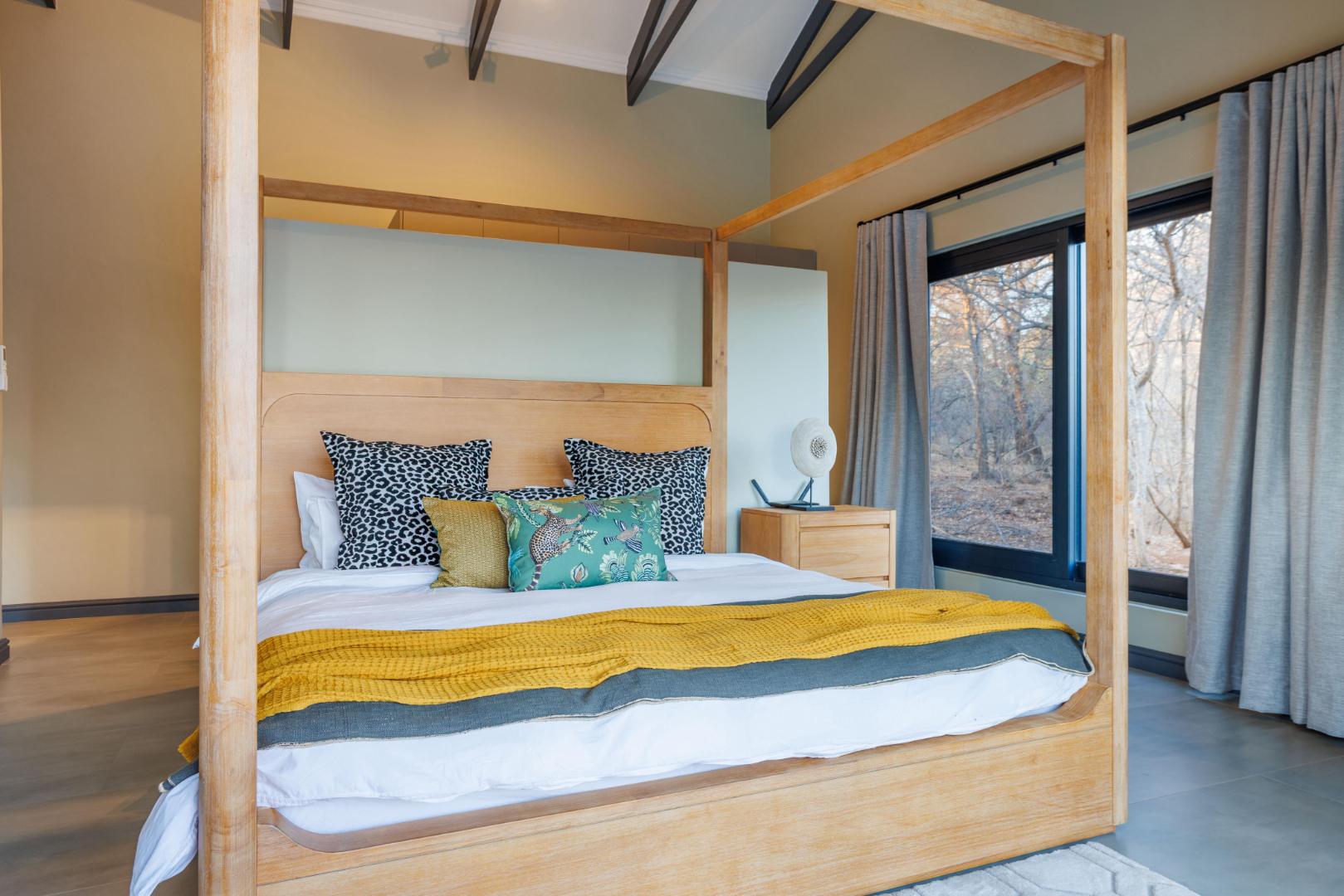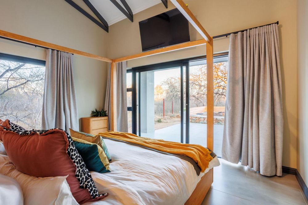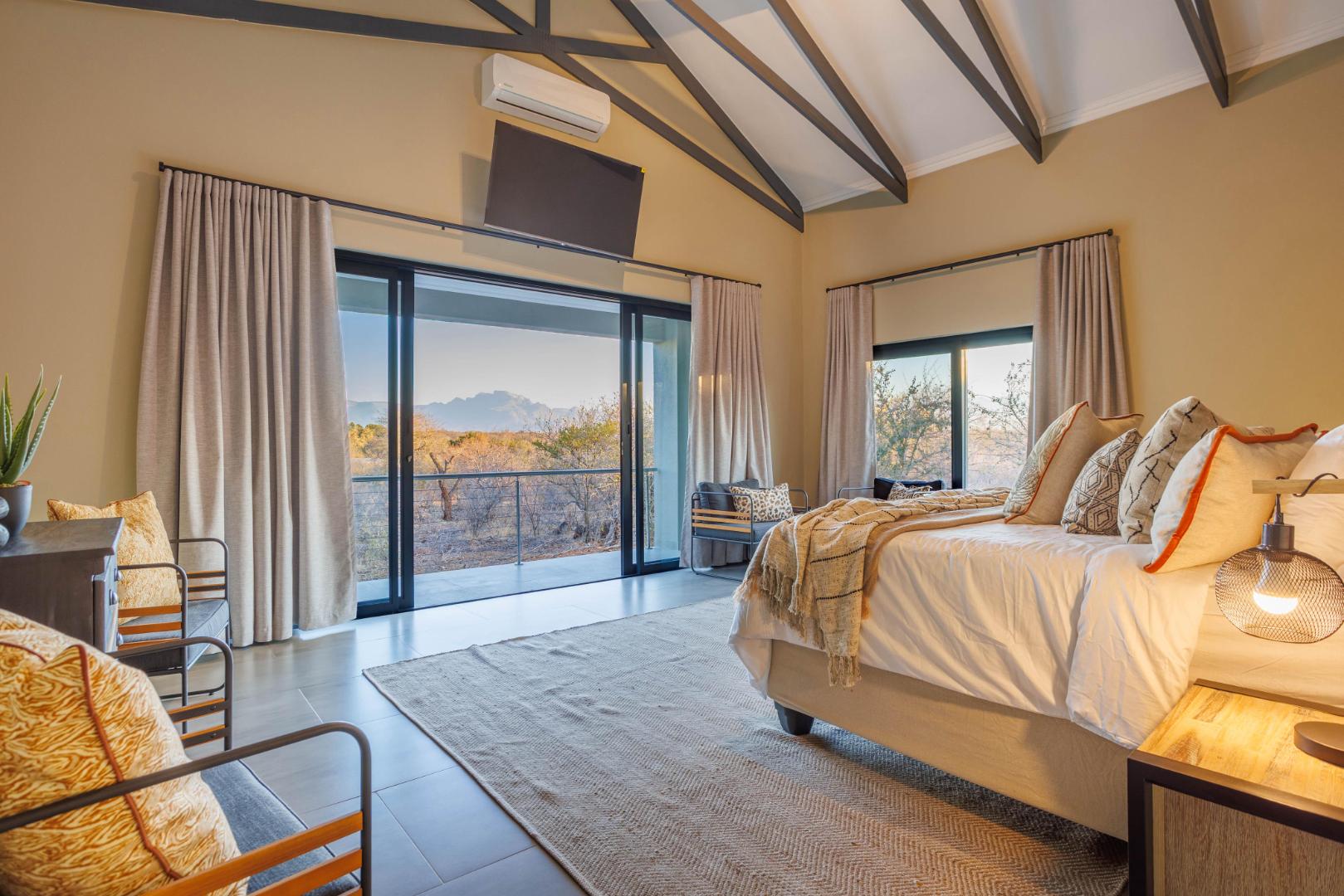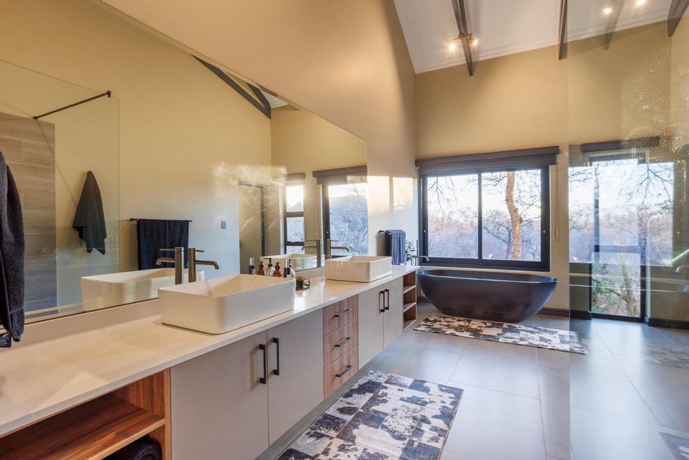The main bedroom is privately set apart from the other bedrooms, creating a peaceful retreat. It offers a large walk-in cupboard, its own private patio, and beautiful views towards Mariepskop. The en-suite bathroom is elegantly designed with a bath, double basins, a large shower, and windows that open to the bush, creating a tranquil and luxurious feel.