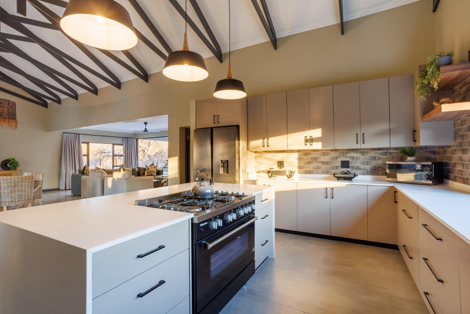 The living area is light, spacious, and welcoming, with high open-trussed ceilings that enhance the sense of volume. The layout is L-shaped and open-plan, combining the lounge, dining area, and modern kitchen into one easy-flowing living space. The kitchen is well-designed with a large gas stove, electric oven, prep bowl, and separate scullery. Large windows bring in natural light and frame the surrounding views, while the modern finishes add to the home’s sleek appeal.