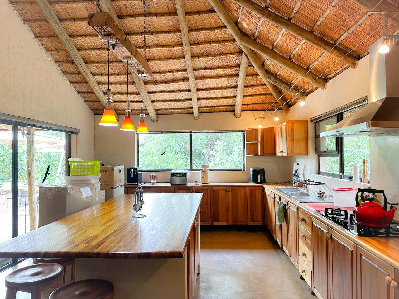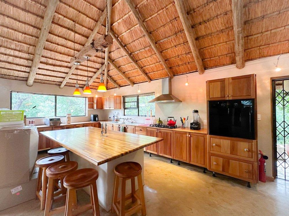 The fully off-grid main home features quality finishes, screed floors and a Harvey Thatch Tile roof. A spacious lounge, library and well-equipped kitchen (gas stove and electric oven) flow onto a covered thatched patio overlooking the pool and surrounding wilderness. The air-conditioned main bedroom includes built-in cupboards, an en-suite bathroom and a distinctive outdoor bath with bush views. A loft provides flexible space for an office or additional accommodation, while a separate guest bathroom adds convenience.