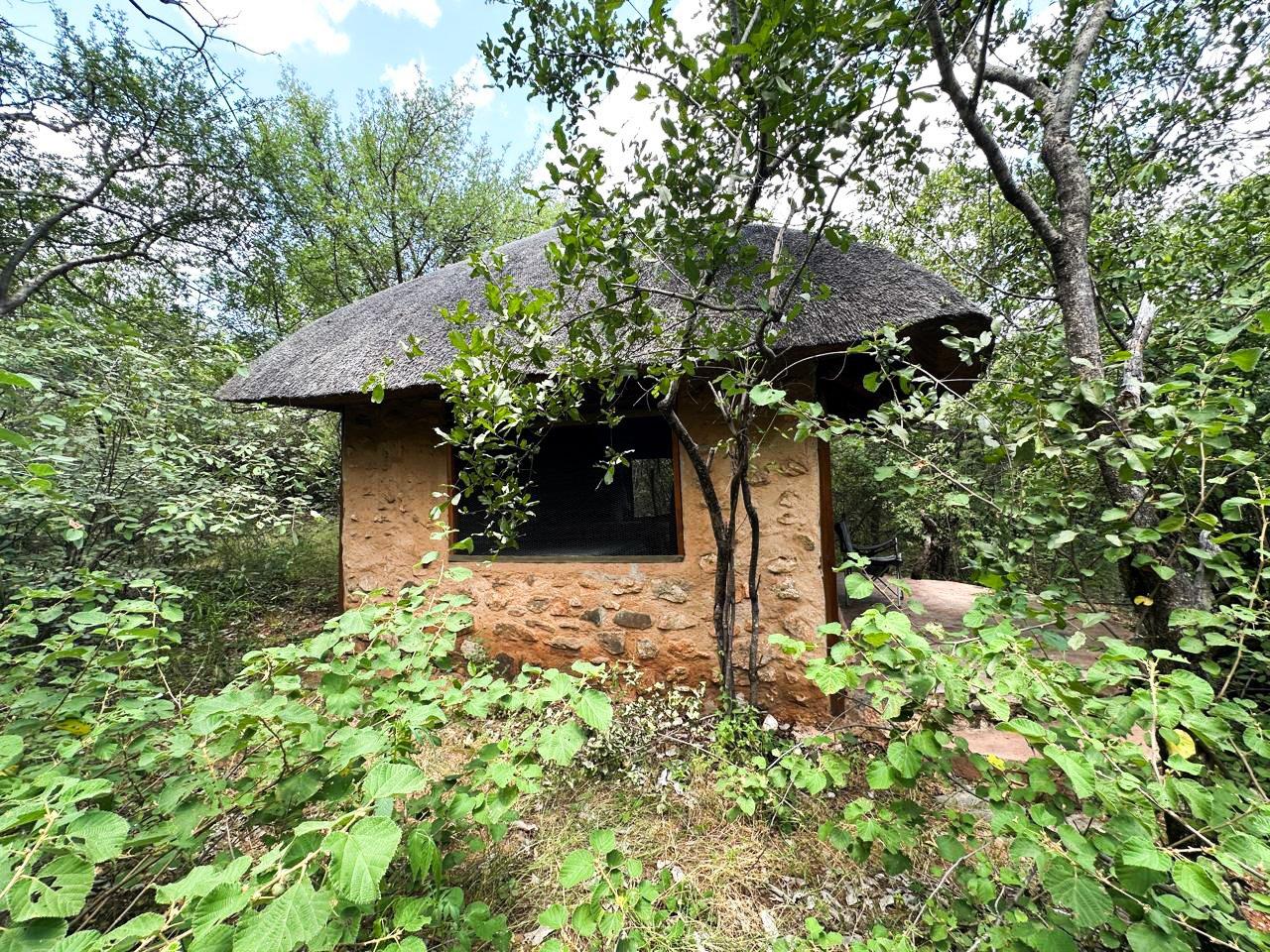 Set approximately 500 metres from the main homestead, the rustic bush camp delivers an immersive wilderness experience. It includes multiple stone-and-thatch, canvas-sided sleeping units (main en-suite), open-air bathrooms, an open-plan kitchen and dining area, and a separate dining area and day bed — perfect for unforgettable gatherings under the stars. The camp is fenced with electric elephant fence.