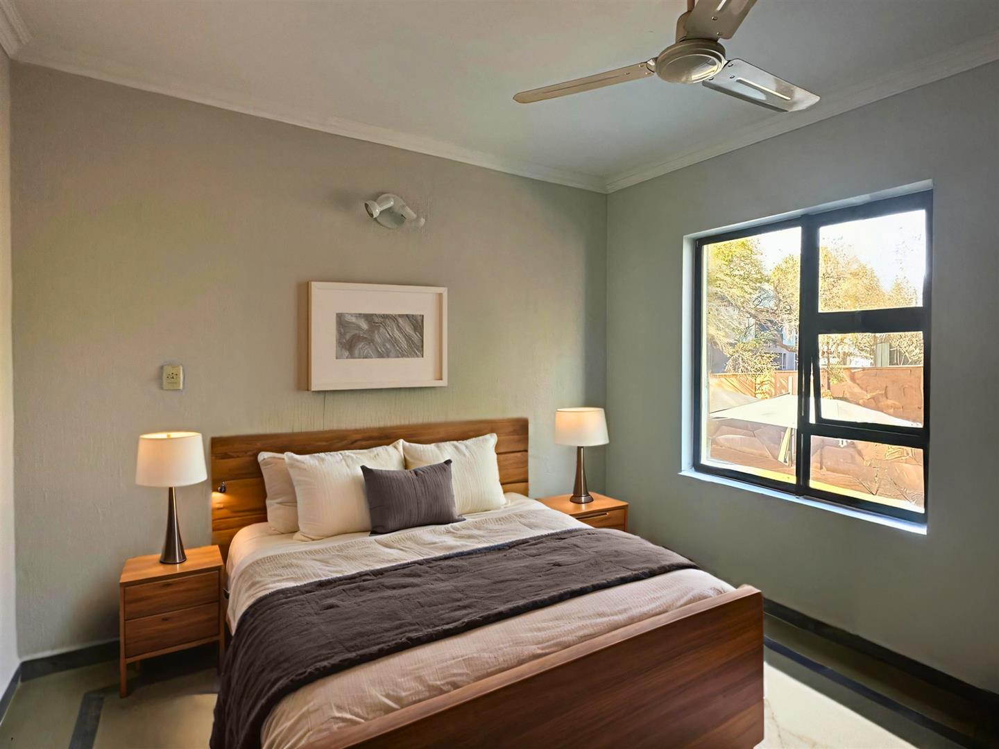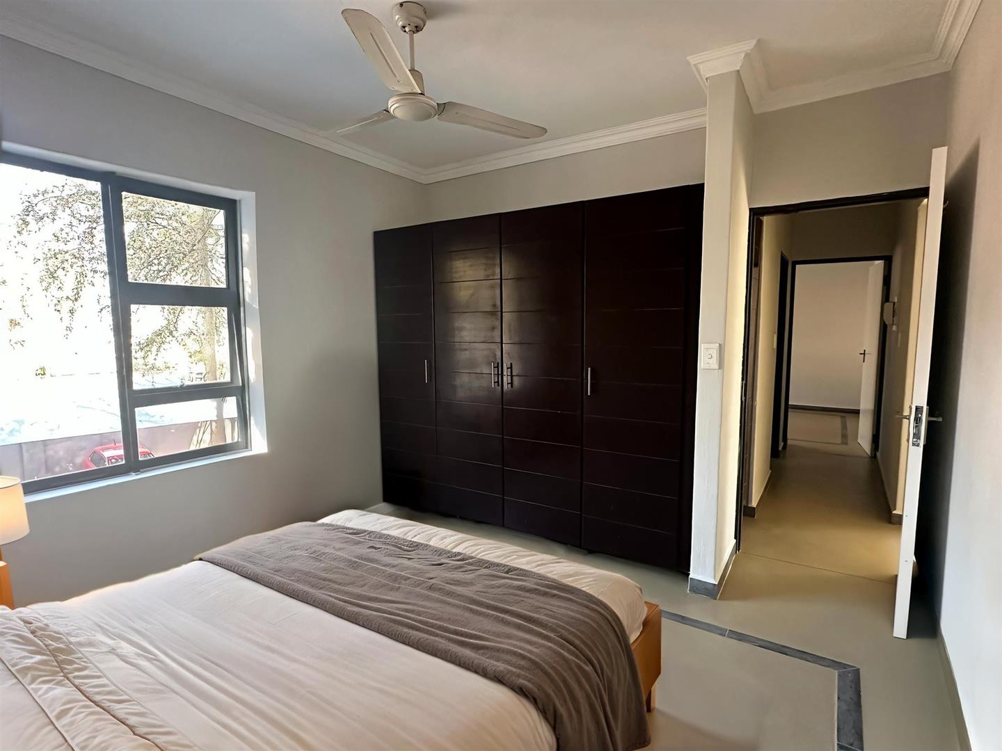 Both bedrooms have built-in cupboards and ceiling fans, and the bathroom includes a shower and bath.