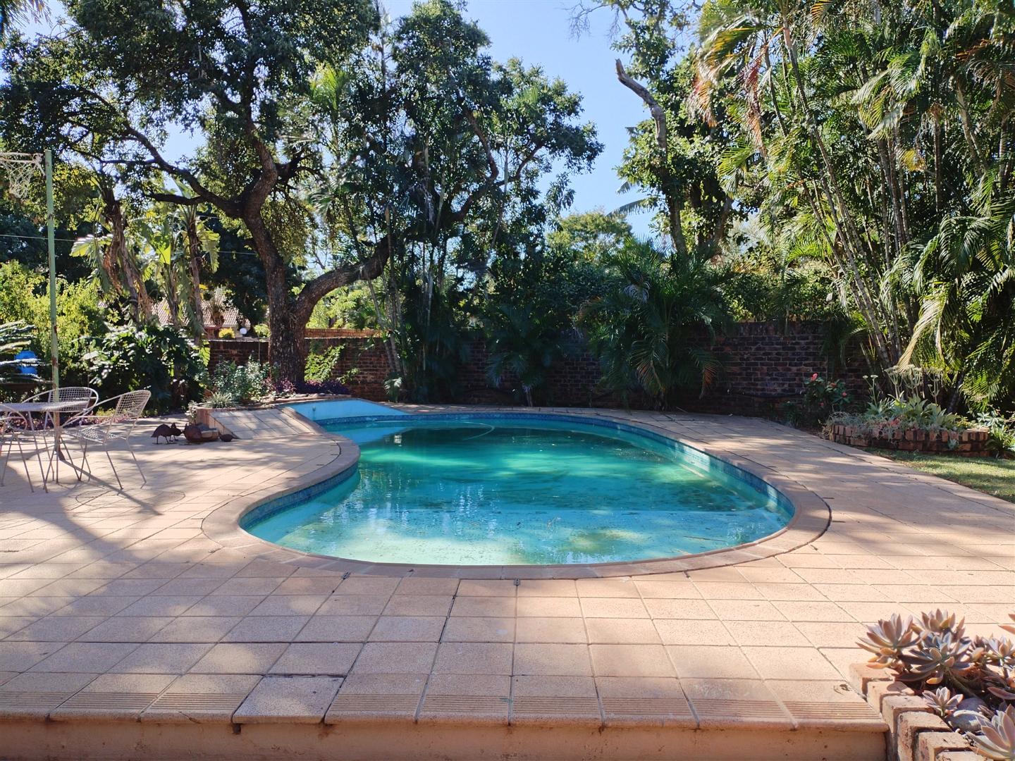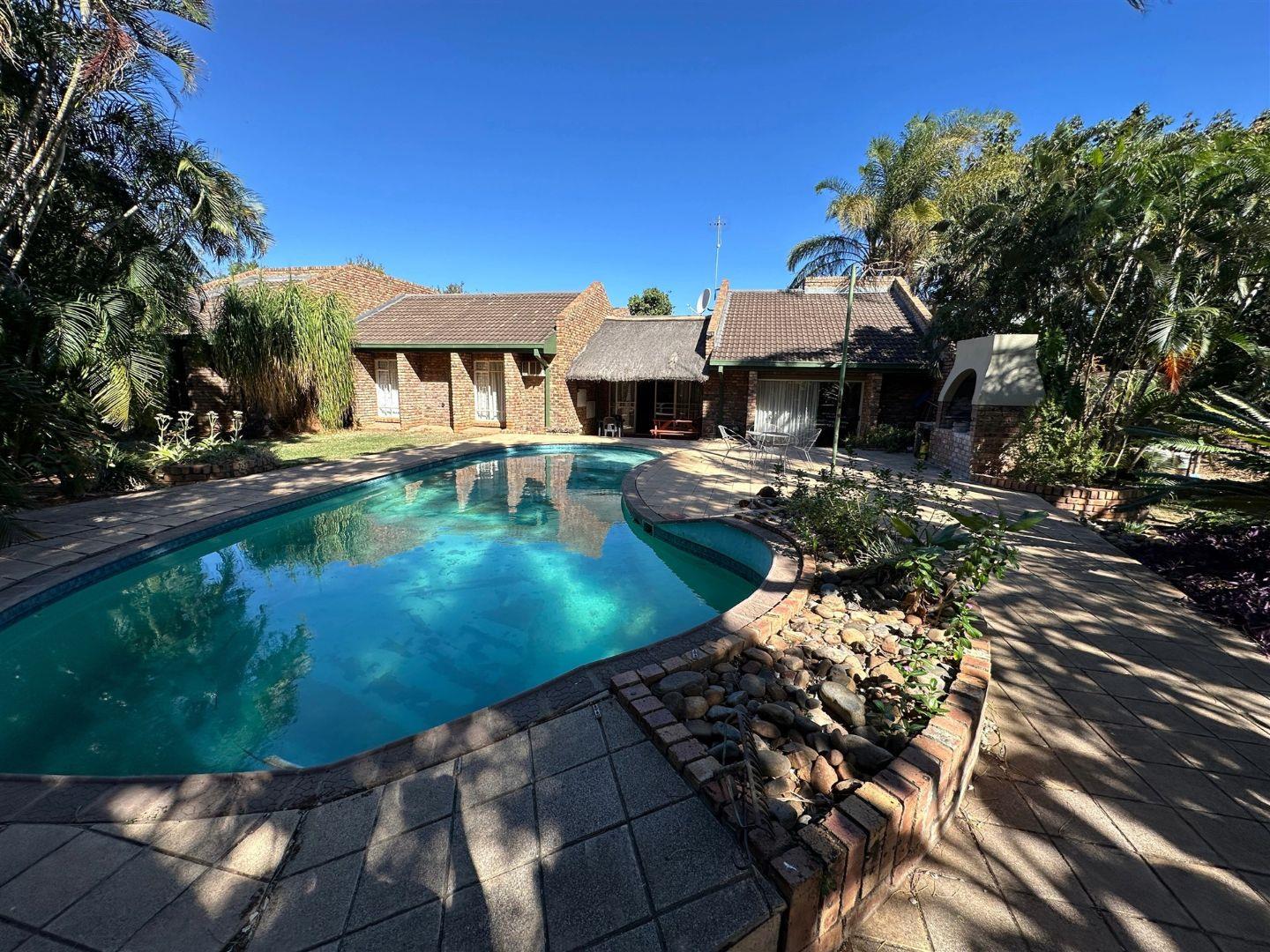 Lush garden with established greenery, built-in braai, and sparkling pool.