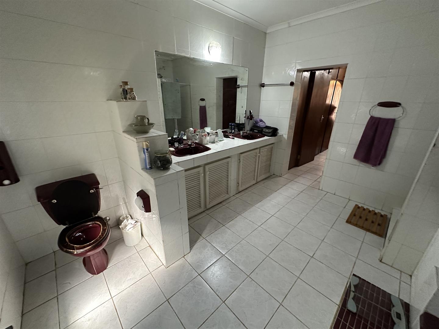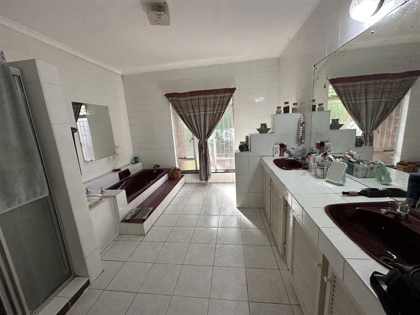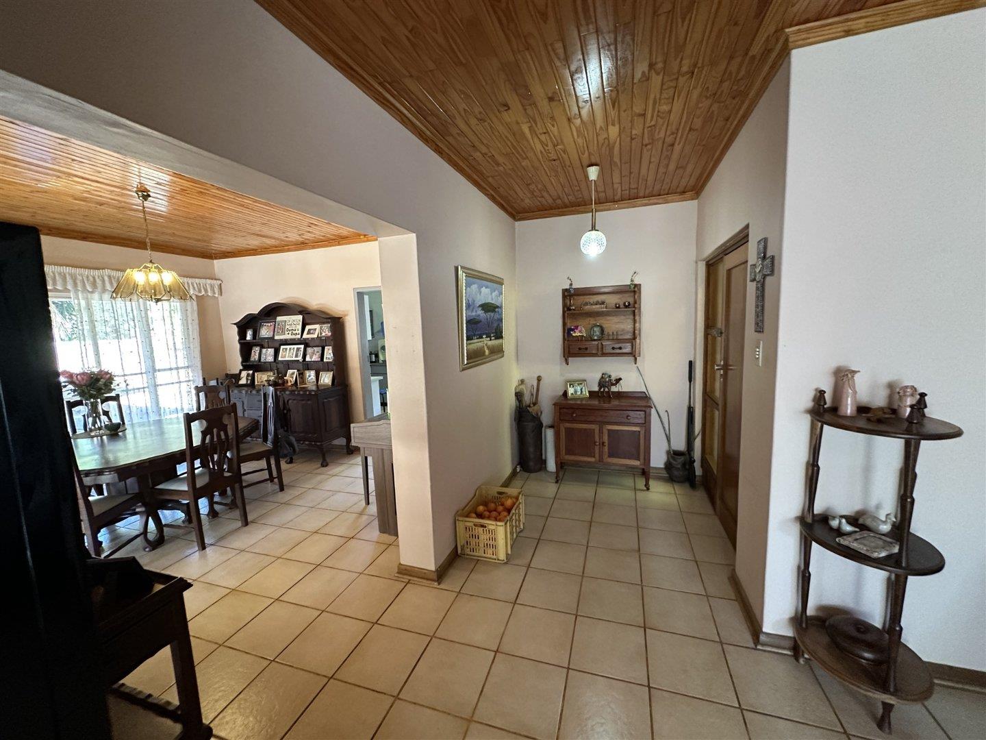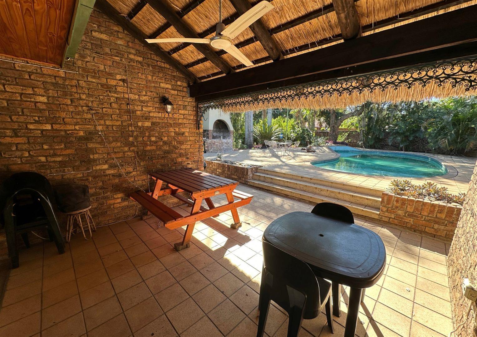 The open-plan dining room seamlessly flows onto a covered patio, offering tranquil views of the sparkling pool and lush, landscaped garden-complete with a built-in outdoor braai for memorable gatherings.