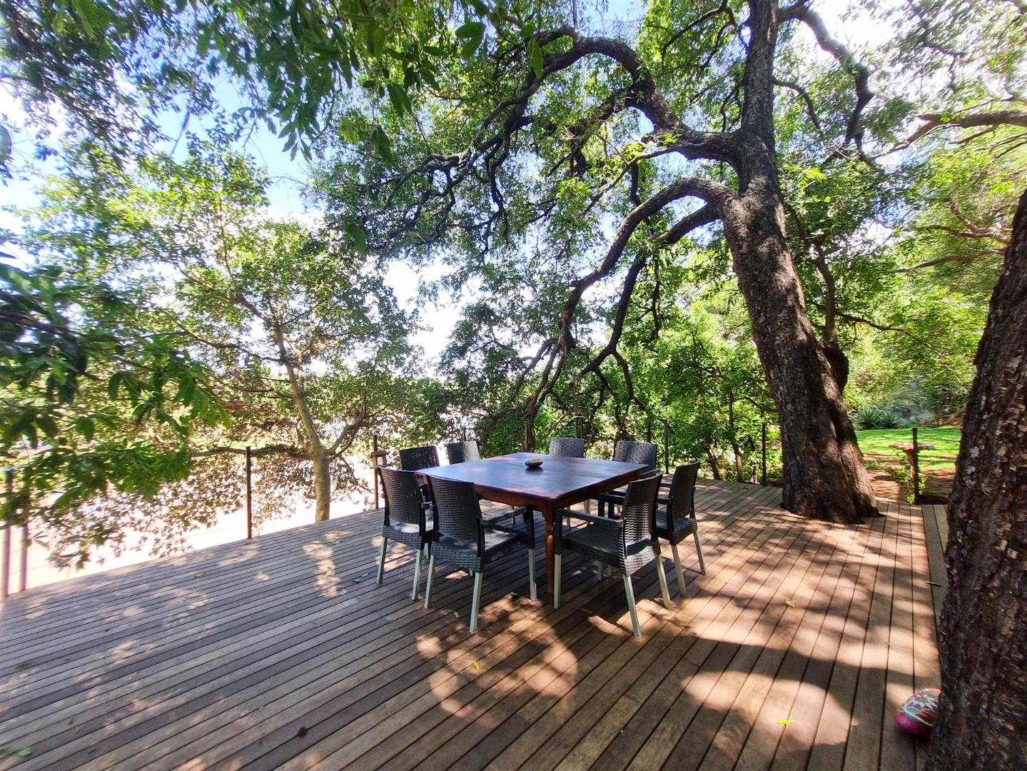 The spacious open-plan living area includes a lounge, dining room, and well-appointed kitchen with a separate scullery, as well as a courtyard and storeroom for added convenience. Sliding doors open onto a generous patio featuring a splash pool and boma area—perfect for relaxed outdoor living beneath the shade of magnificent mature trees.