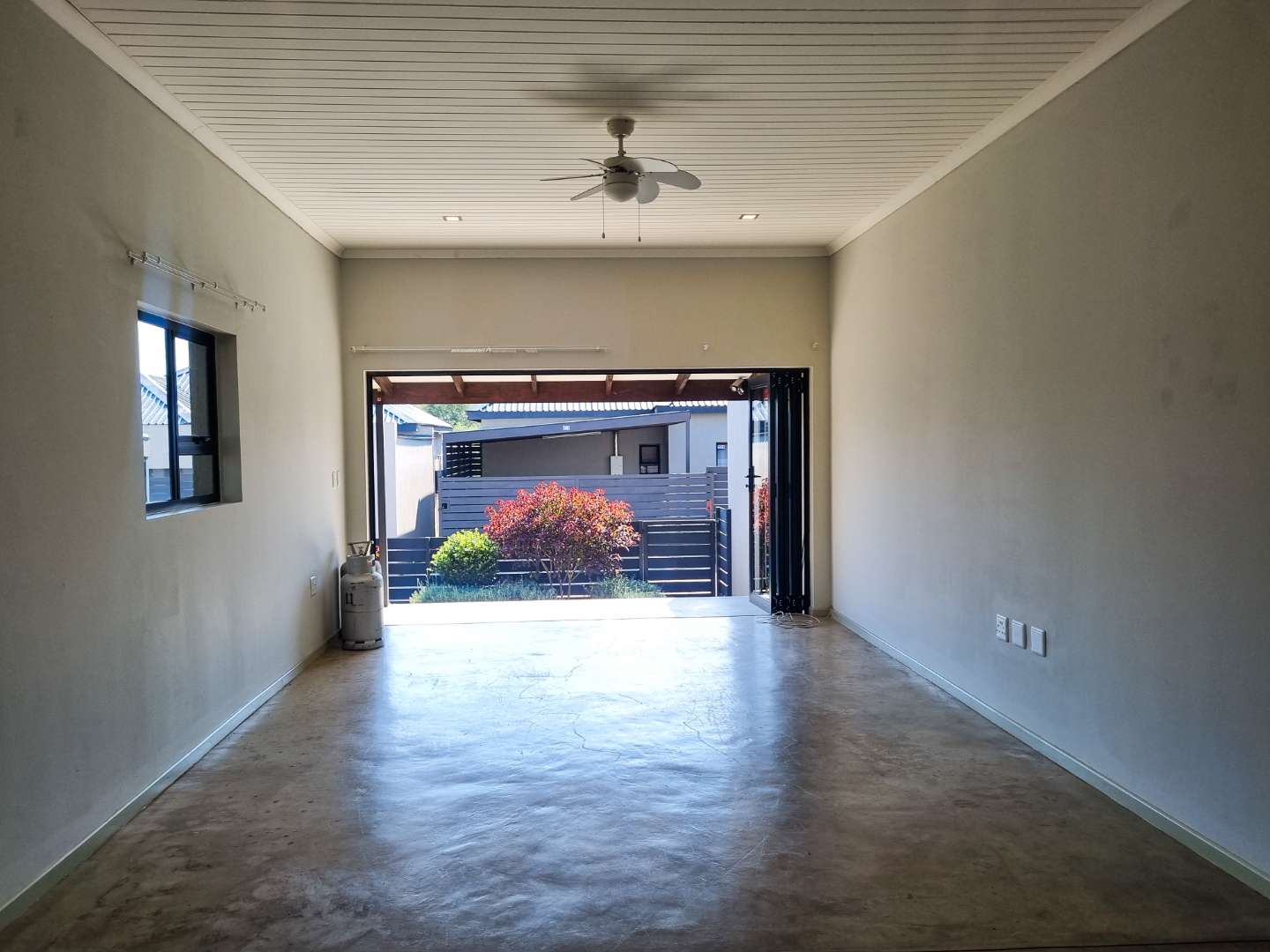 The home features an open-plan living area with stacking doors that open onto a covered patio and small private garden, creating a seamless indoor-outdoor flow.