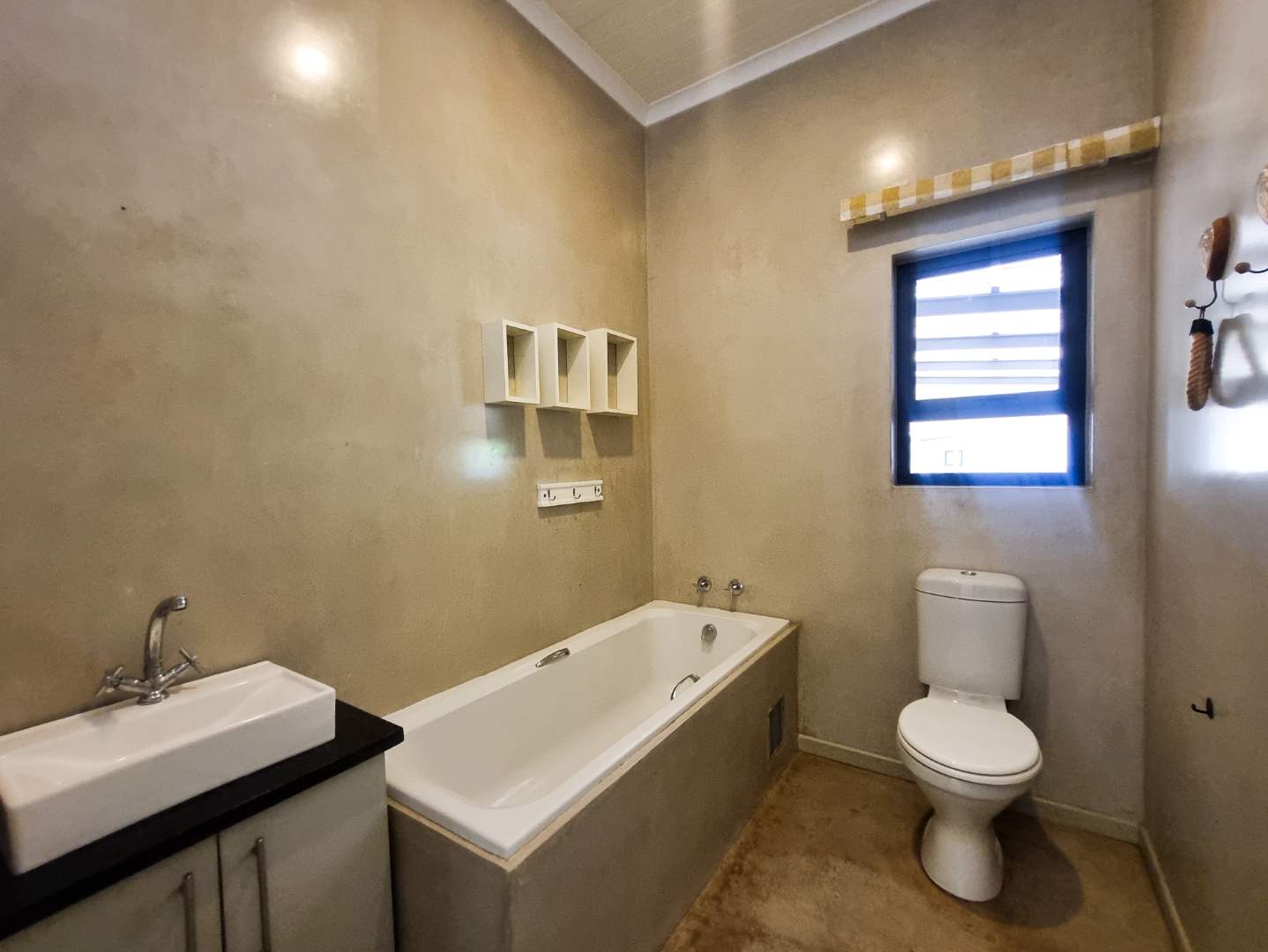 A second, separate bathroom includes a toilet, basin, and bath.