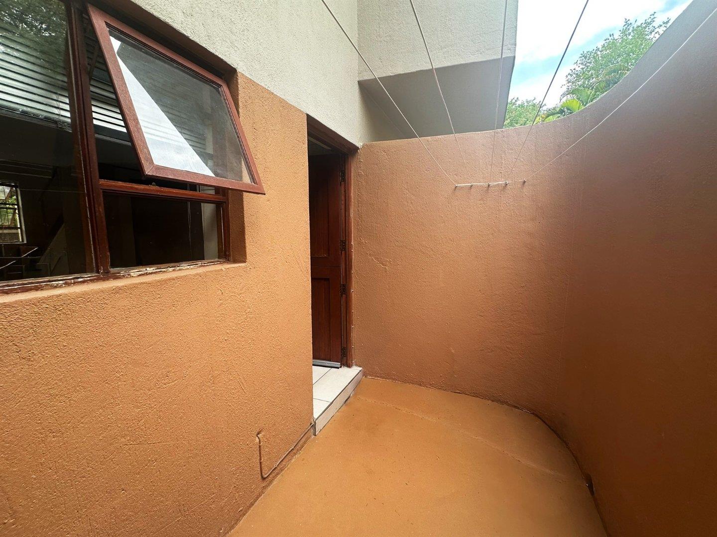 On the ground floor, the open-plan lounge and dining area flows into a modern kitchen. There’s a small study nook, perfect for working from home. The living area opens onto a private patio with a built-in braai, leading straight into the leafy communal garden. Ideal for outdoor entertaining. A private courtyard with a washing line adds convenience, and there’s also a guest loo downstairs.