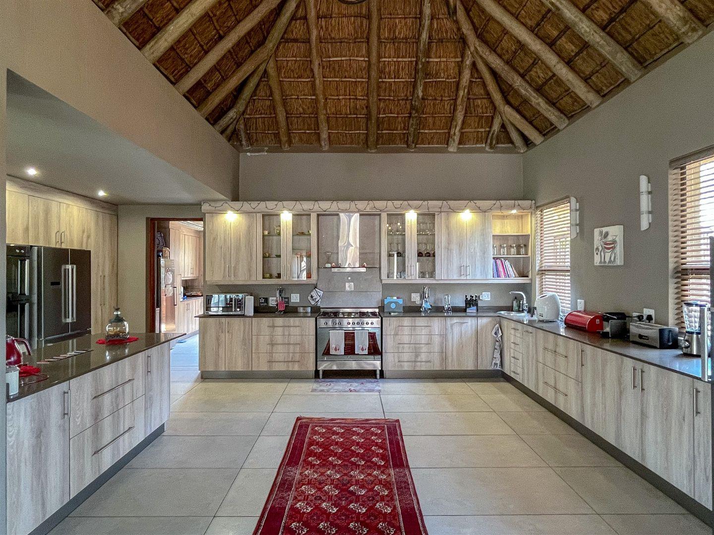 This spacious home is sold fully furnished and equipped. The large open-plan kitchen, dining room and lounge leads out to a covered patio with infinity pool. The modern kitchen has a separate scullery. Each of the large 5 bedrooms have en-suit bathrooms and private patio’s with three of them overlooking the dry riverbed. A large boma is the ideal place to spend evenings around the fire, listening to the night sounds. There is a separate guest loo, double garage plus 6 carports. The property is secured with an electric fence, ensuring a safe and secure environment to enjoy the african wildlife from the safety and comfort of your home.