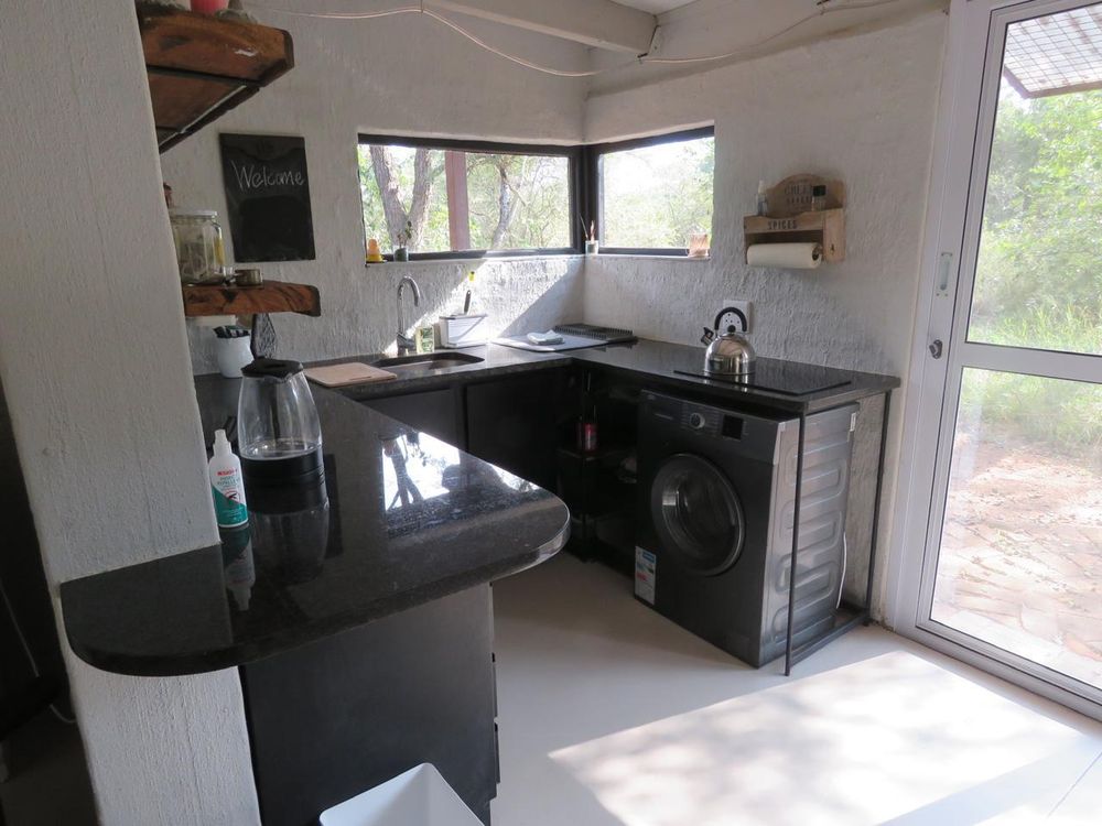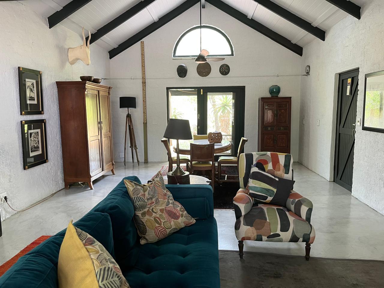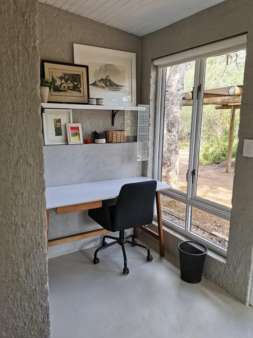 The main home offers two en-suite bedrooms and a separate work area, while the primary suite features a stunning bathroom setup. As an added bonus, the property includes a fully self-contained, separate one-bedroom cottage that is very private and has great bush appeal, with potential for residential letting only. Additional features include a double carport, storeroom, and solar setup.