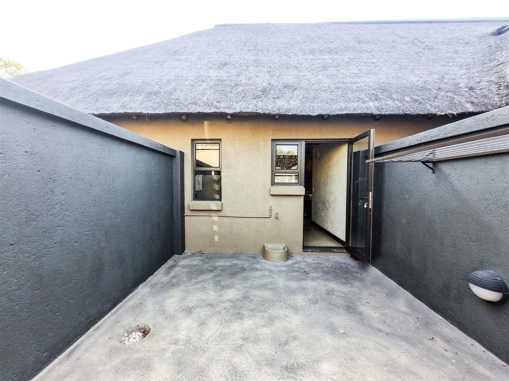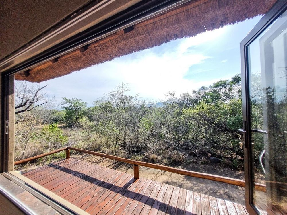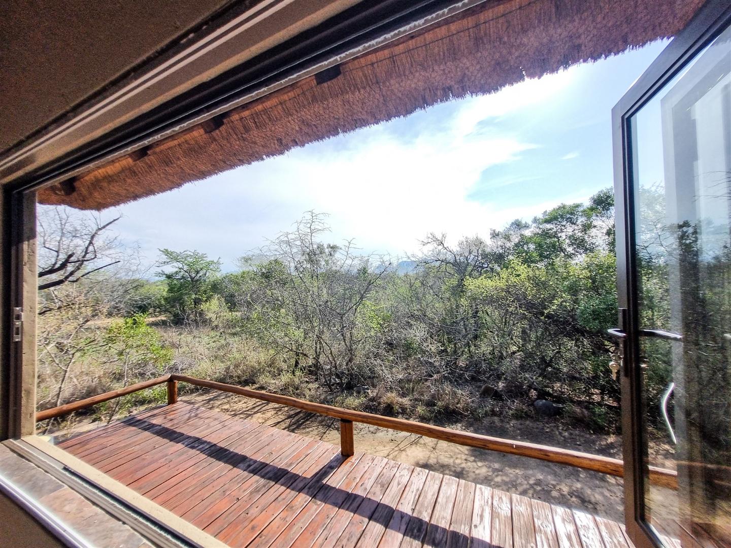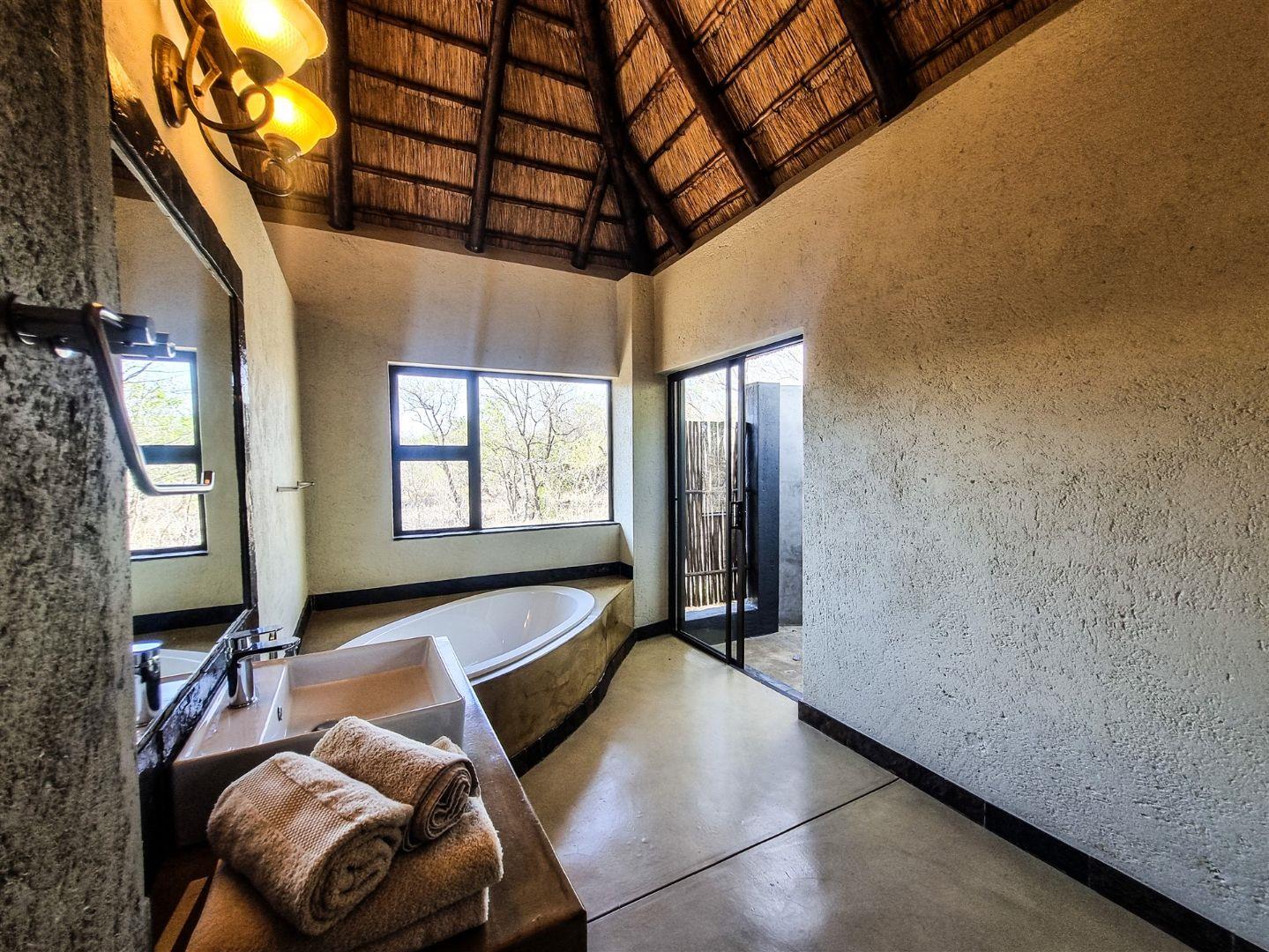 The main bedroom is en-suite and features built-in cupboards, sliding doors, and a large window with shutters that seamlessly connect the interior with the surrounding bushveld. The en-suite bathroom includes a bath, basin, toilet, and an outdoor shower.
