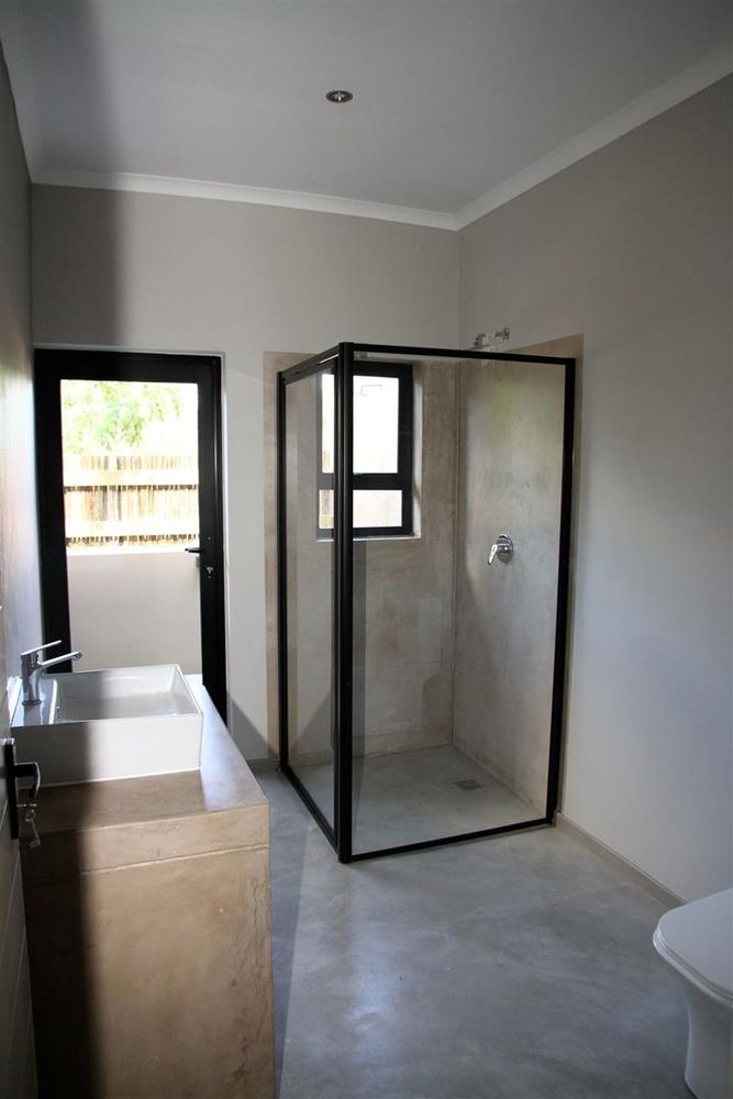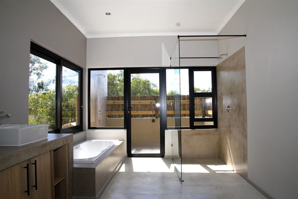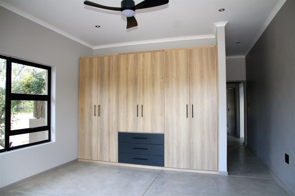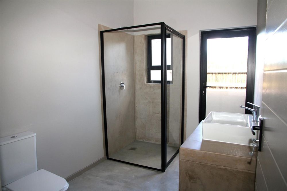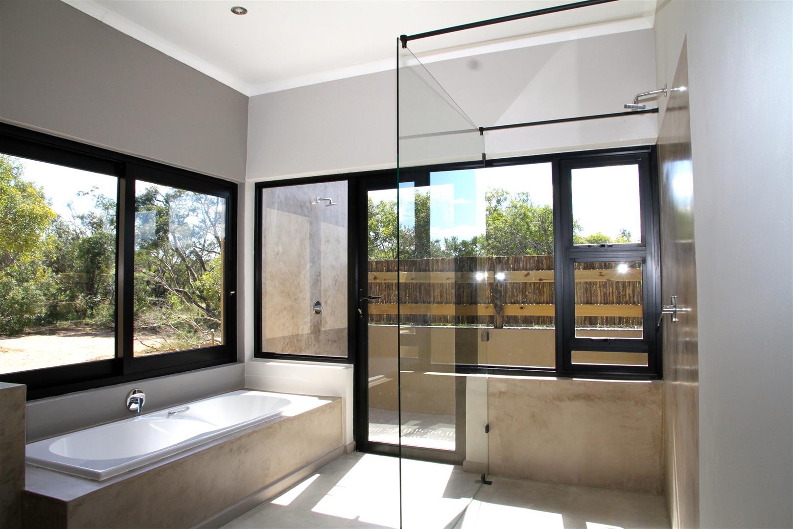 Upon entering, you’re welcomed into a spacious open-plan living area that integrates the kitchen and dining space, all overlooking a covered patio, spacious wooden decking and the swimming pool. This home has aluminum doors and windows throughout as well a ceiling fans. The home has three bedrooms, two of which each have separate indoor/outdoor shower combination, single vanity and toilet. The primary bedroom includes a walk-in closet, full bathroom as well as a spacious outdoor shower with latte privacy wall. All areas of this home enjoy great views of the surrounding bushveld and big skies.