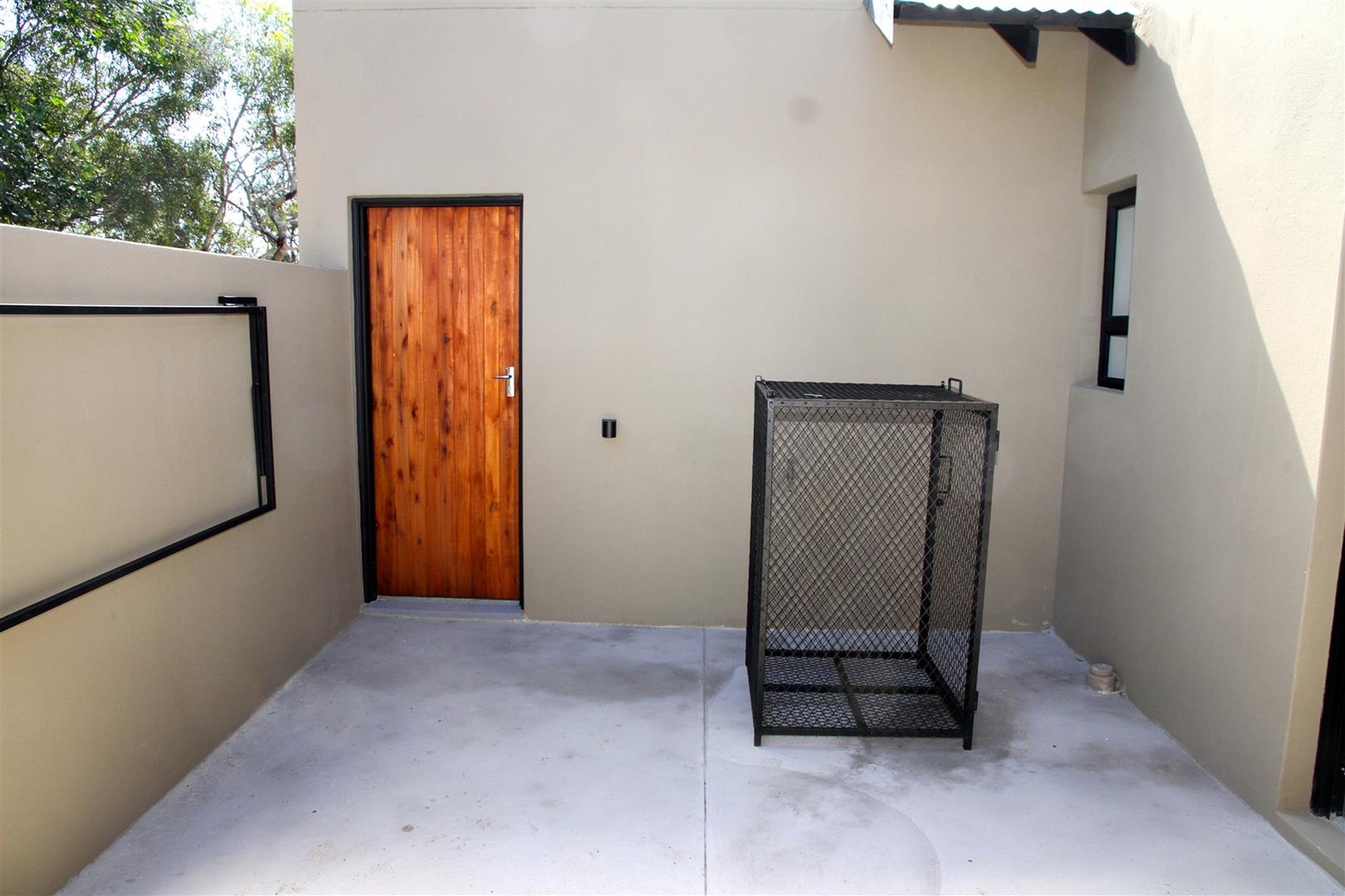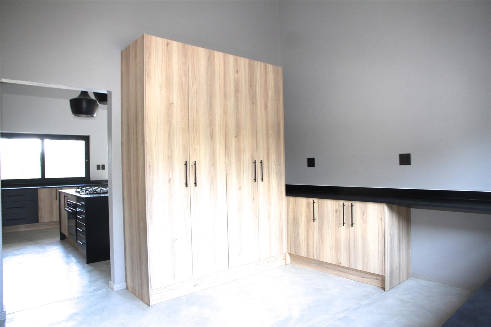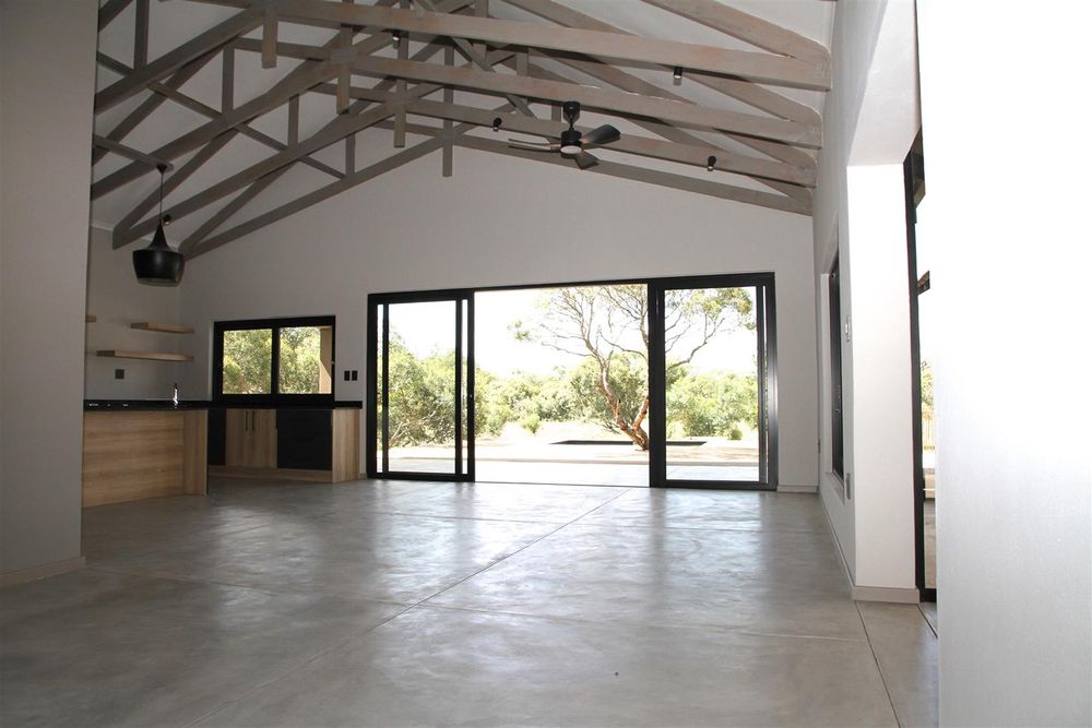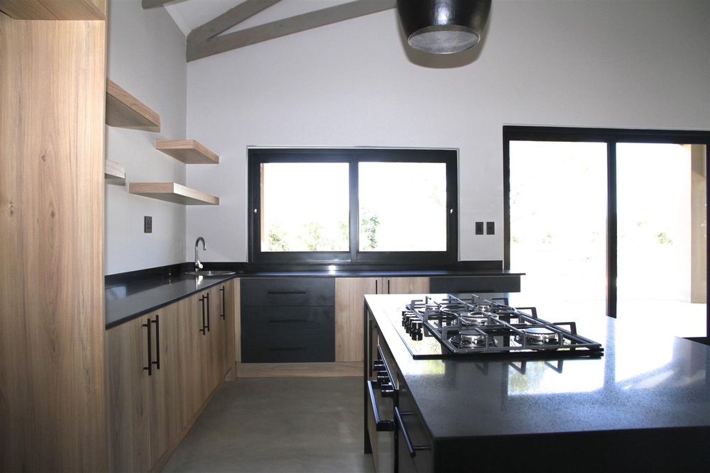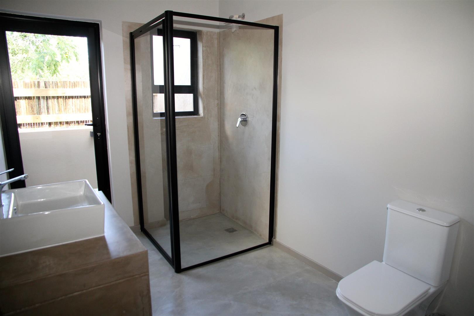 Upon entering, you’re welcomed into a spacious open-plan living area that integrates the kitchen and dining space, all overlooking a covered patio, spacious wooden decking and the swimming pool. This home has aluminum doors and windows throughout as well a ceiling fans. The home has three bedrooms, two of which each have separate indoor/outdoor shower combination, single vanity and toilet. The primary bedroom includes a walk-in closet, full bathroom as well as a spacious outdoor shower with latte privacy wall. All areas of this home enjoy great views of the surrounding bushveld and big skies.