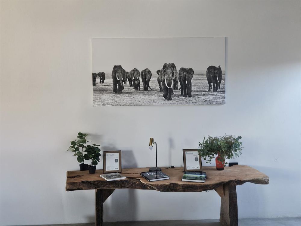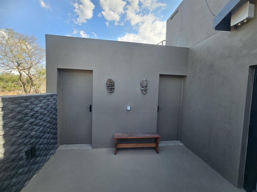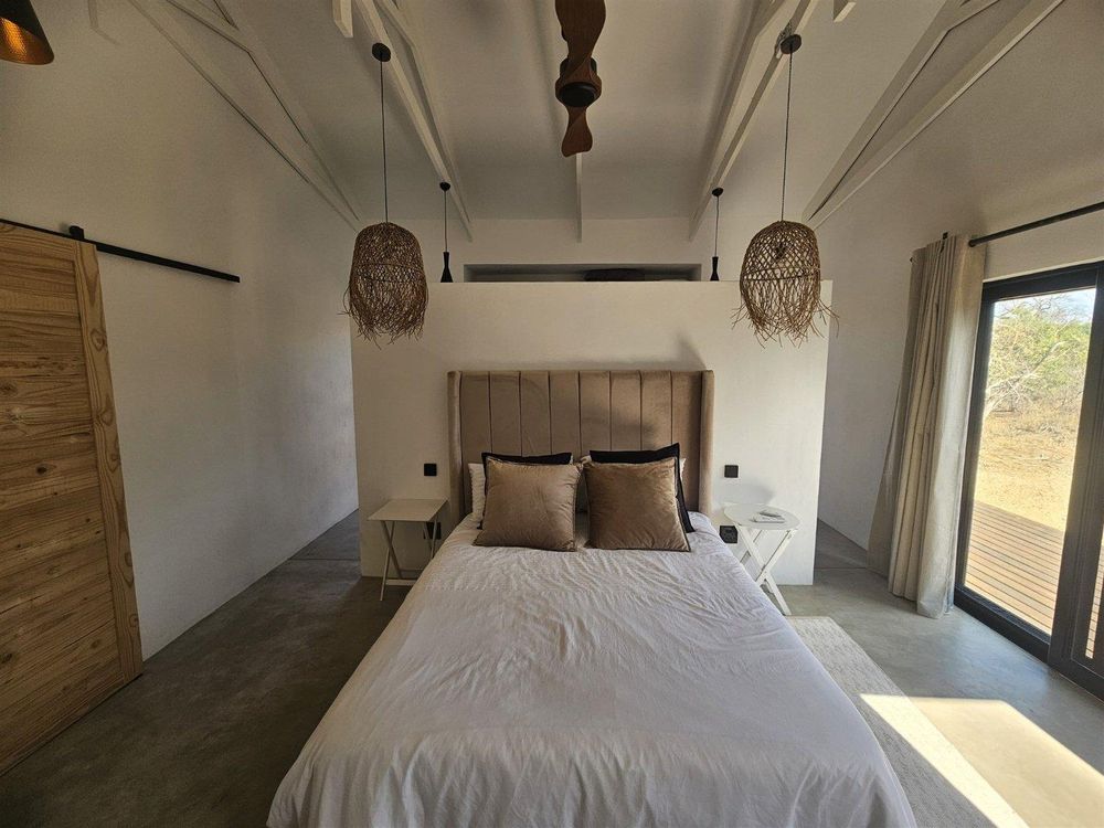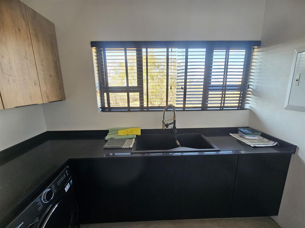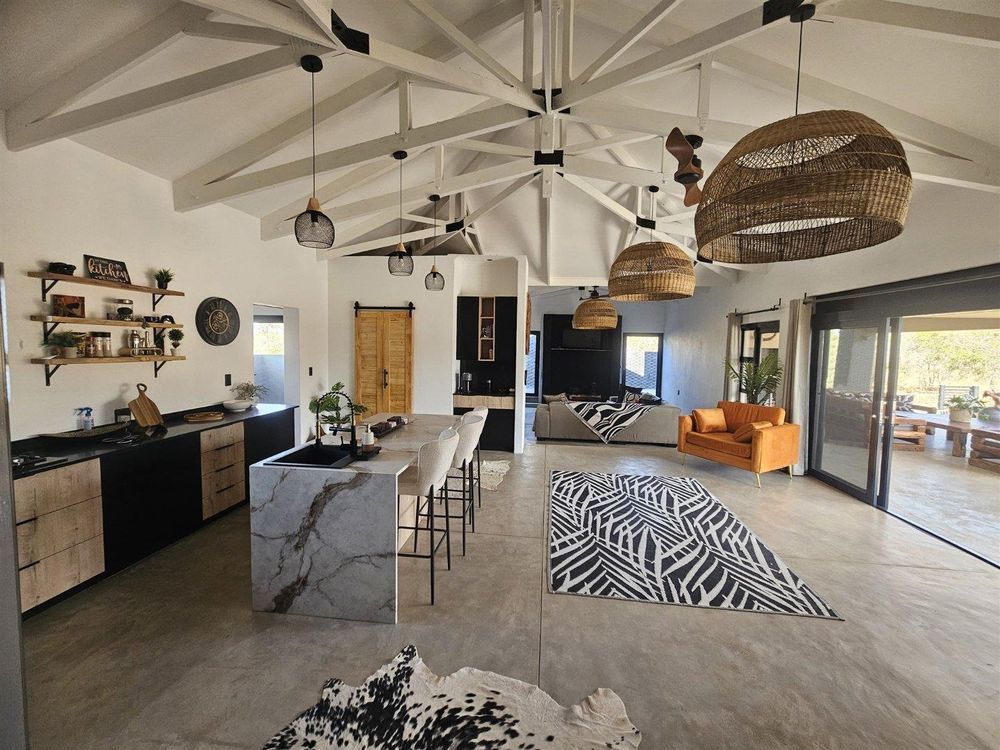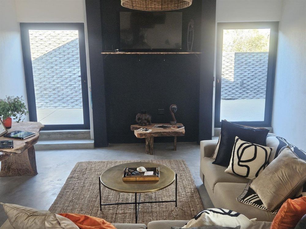 The light-filled entrance hall of this beautifully designed home welcomes you into the open, spacious living area with its African-inspired furnishings. The modern, open-plan kitchen is fully equipped and has an island with seating. This leads into a separate, out-of-sight scullery area.