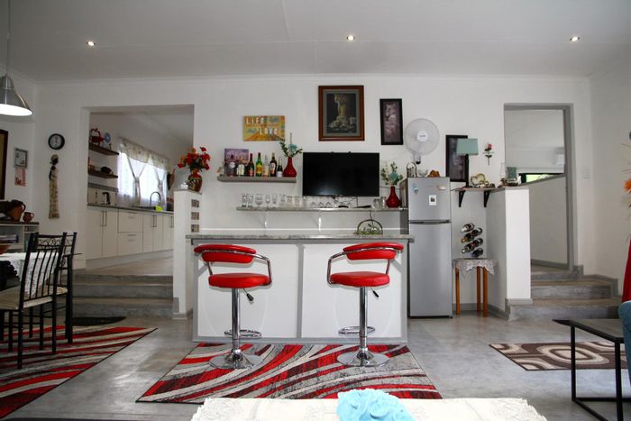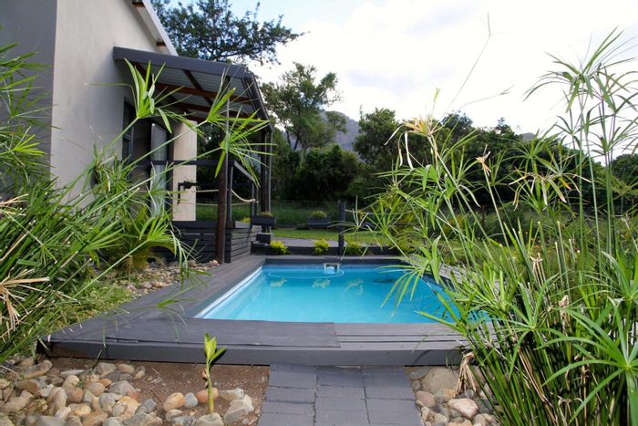 The open-plan living, dining, and recently renovated kitchen are nestled beneath soaring vaulted ceilings, complemented by a separate scullery. Off the living room, a generously sized covered entertainment area presides over the picturesque garden and swimming pool, drawing one's gaze to the Olifants River. This entertainment haven also features lofty vaulted ceilings, a built-in counter, prep sink, and a built-in gas braai—a splendid space for relaxation, book reading, and savoring the beautiful surroundings. This home is sold partially furnished.
