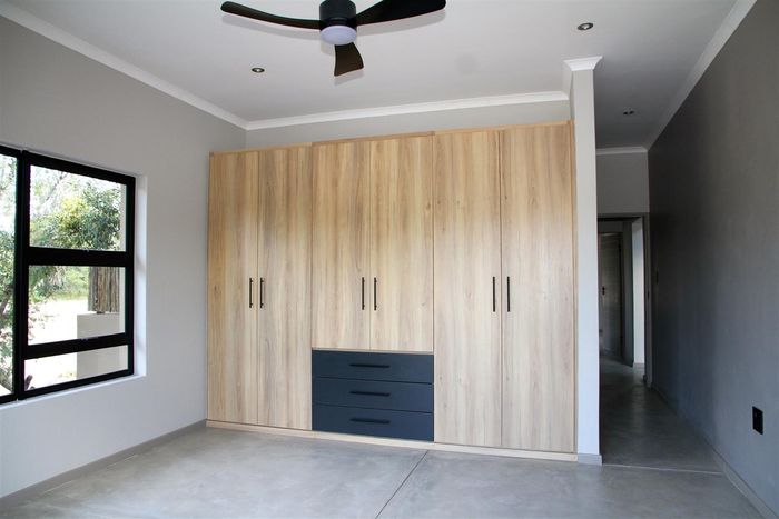 Relaxed bushveld living in Kampersrus near Hoedspruit, with an open-plan kitchen, covered braai patio overlooking a private fenced garden, plus two en-suite bedrooms and air-conditioning.